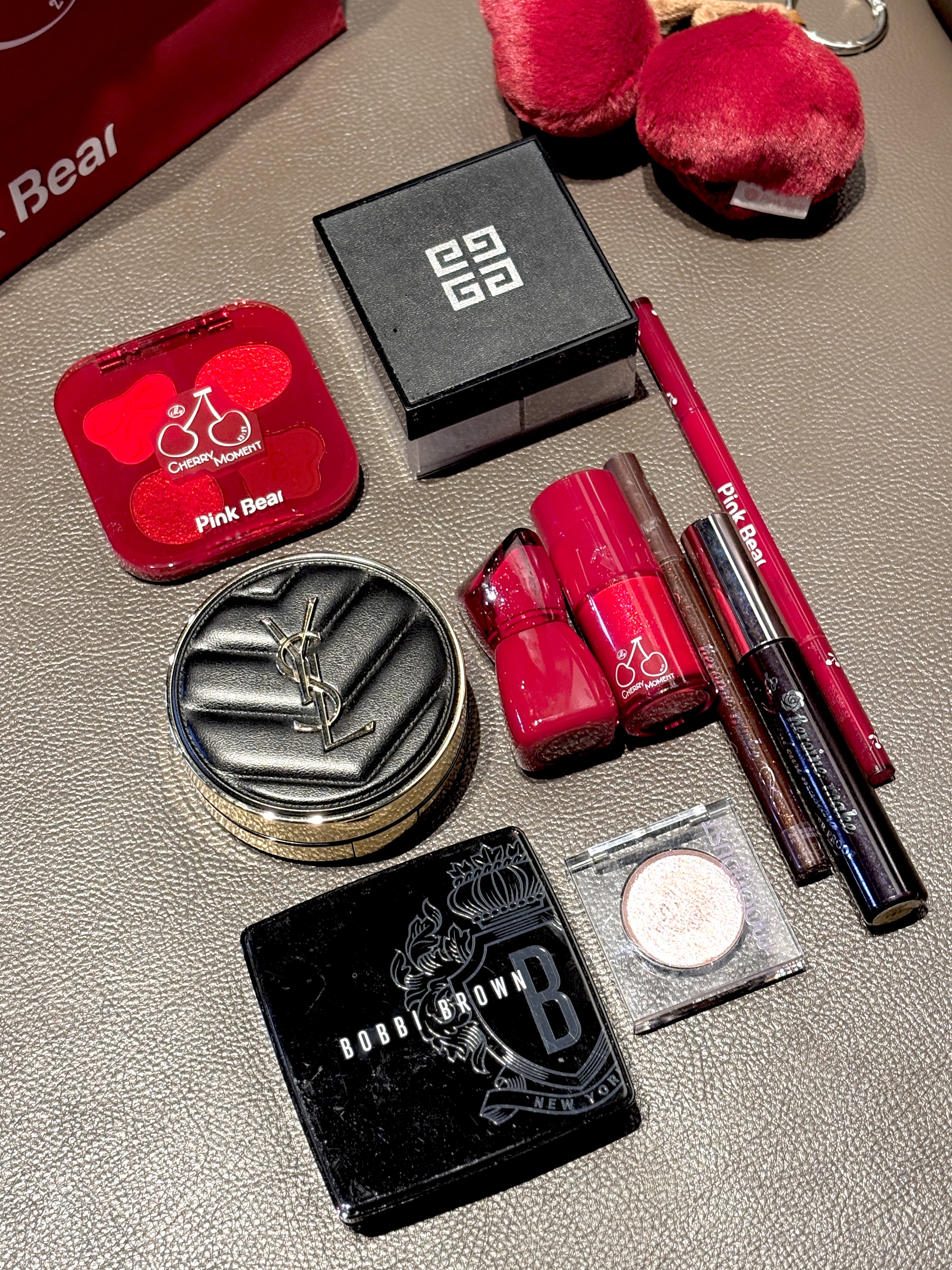 分享一整份「红气养人」的妆备喽 首先是PinkBear樱桃系列眼影和唇釉 眼影是粉棕色系 容易上手不出错 唇釉是粉嫩少女的蜜桃粉色 底妆这块是用的YSL经典皮气垫 搭配着纪梵希散粉定妆 底妆牢牢哒 UD牛郎高光可是点睛之笔 敲灵动 这份红调妆备不管是日常还是约会都ok 今年春节直接拿捏红调氛围感啦