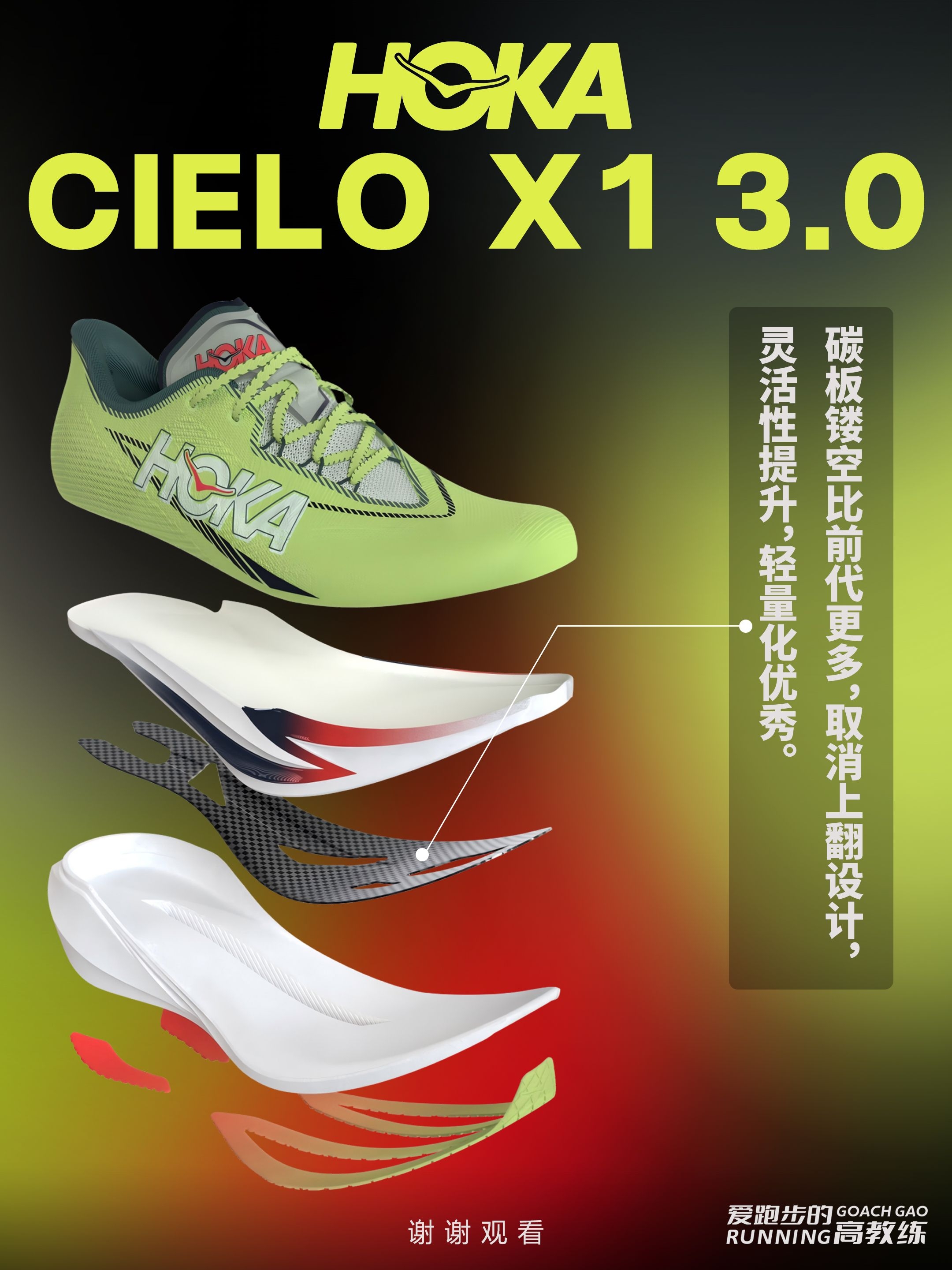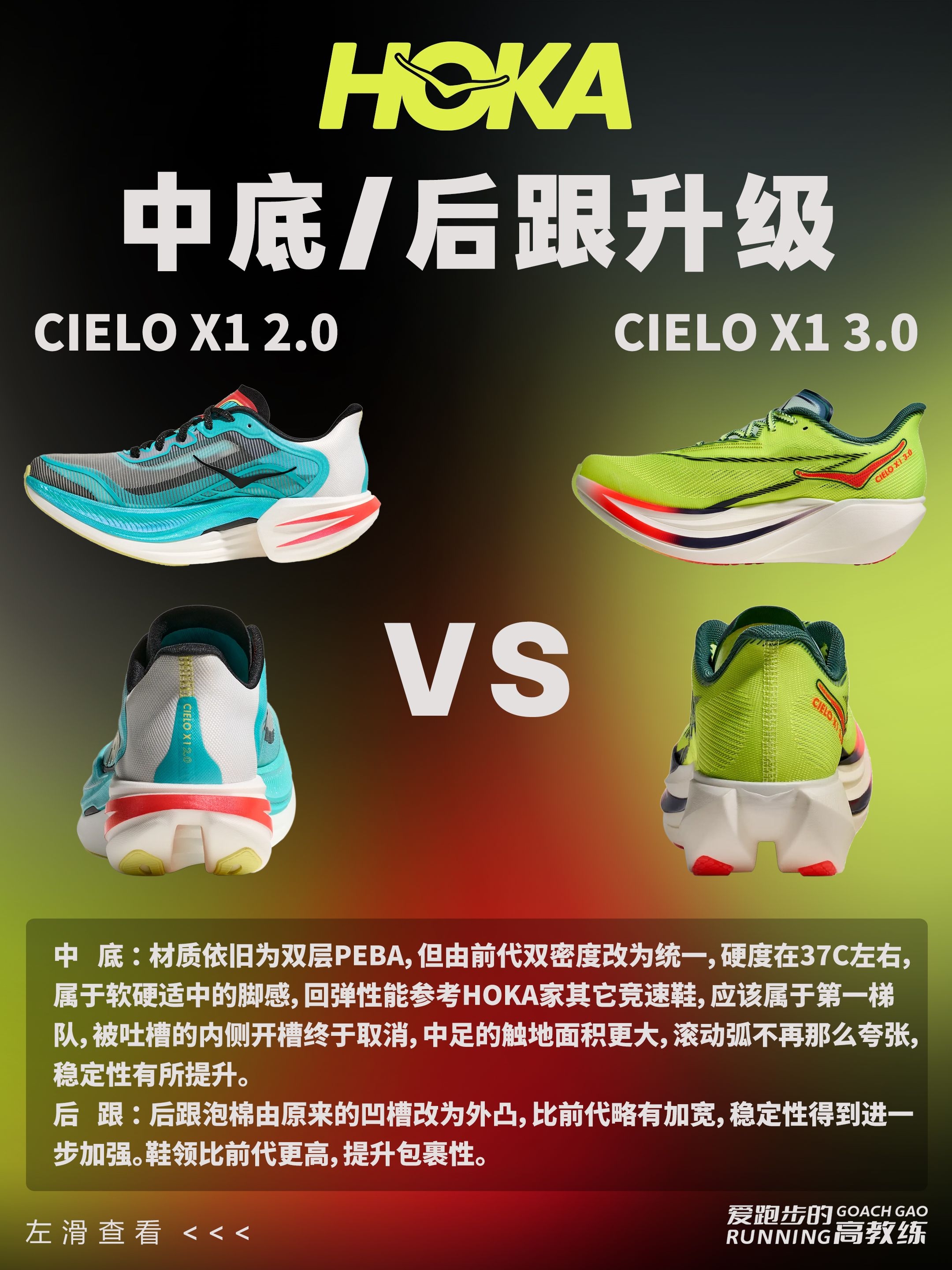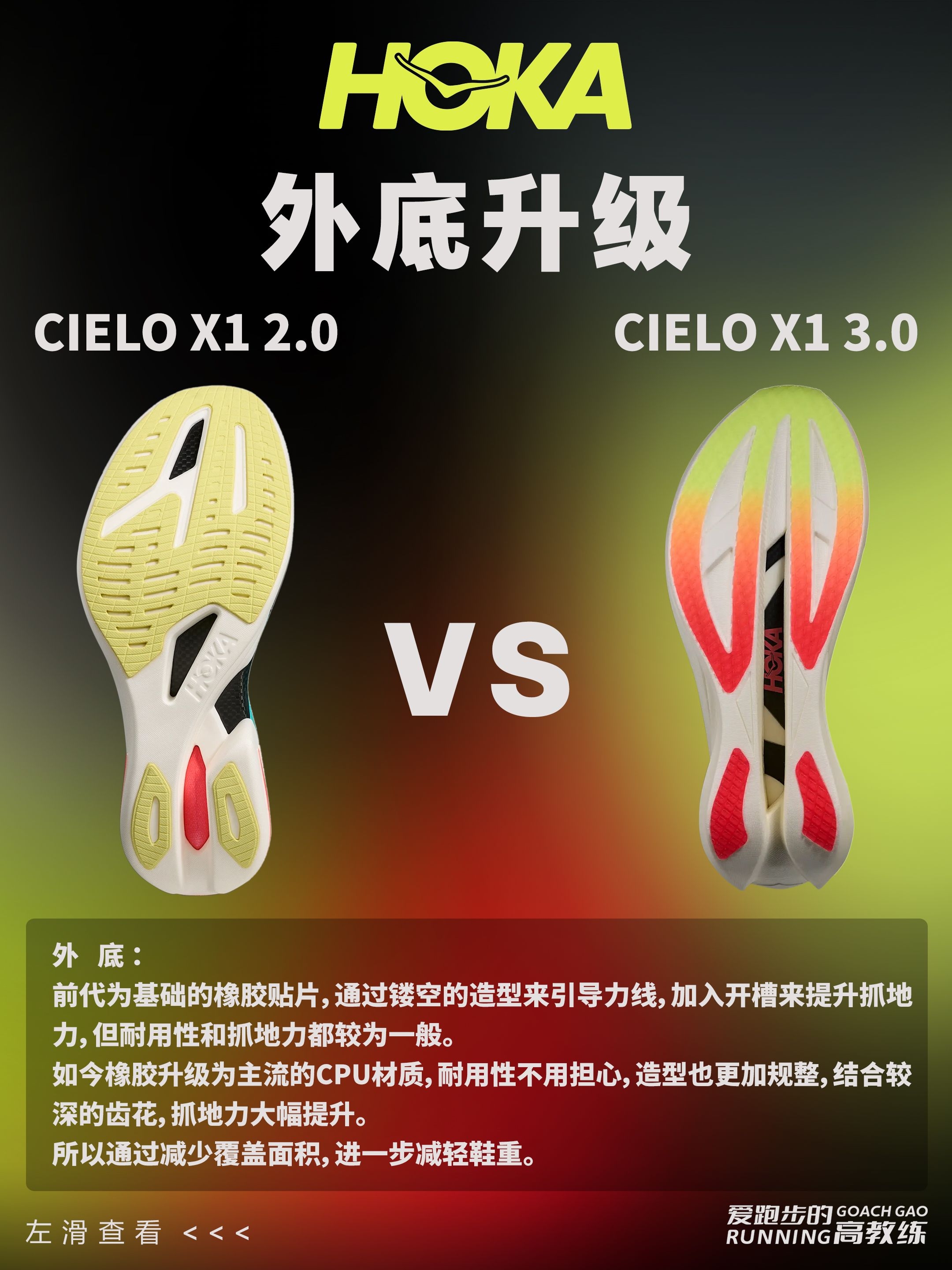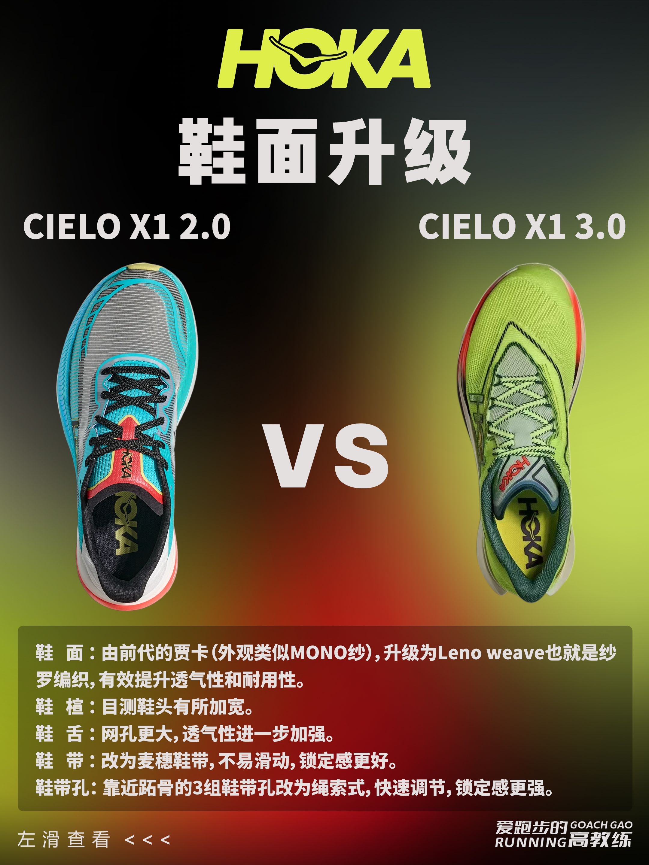 🏃HOKA CIELO X1 系列是 HOKA 专为精英跑者打造的顶级竞速跑鞋,CIELO X1 3.0 刚刚于2026年1月30日正式上市。 ⏫️那CIELO X1 3.0对比前代到底升级在哪?是否值得购买呢❓ 📢我们一起来看下: ✅外观:荧光配色,非常亮眼; ✅鞋重:在2代减重30g的基础上,3代继续减重10多g,44码来到213g; ✅鞋面:由2代的贾卡鞋面更新为纱罗编织,更加透气、耐用...