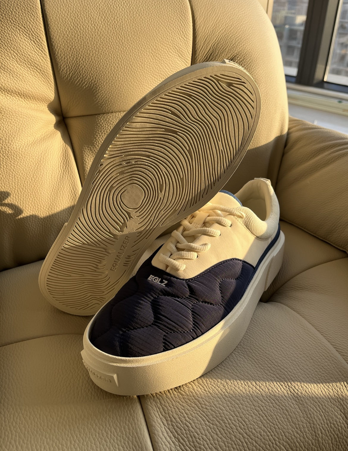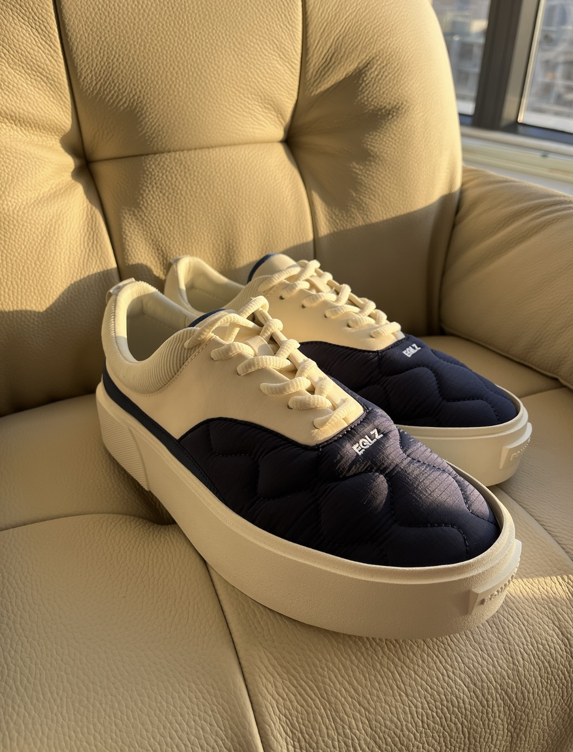EQLZ 最初我记得是做篮球鞋 但是后面逐渐以拖鞋还有板鞋出圈 这款空军特种兵板鞋采用了藏青色搭配米色 经典的鞋型配上品牌独有的细节 羽绒服一样的纹路设计 非常新颖 看得出来搭配起来非常简单 可以说是百搭 冬天卫裤夏天短裤都是高颜值 关键两张的价格确实性价比很高 上脚这个中底感受也是挺软弹的 其实如果可以做成一脚蹬的话会更舒服 大家给这双鞋可以打几分?