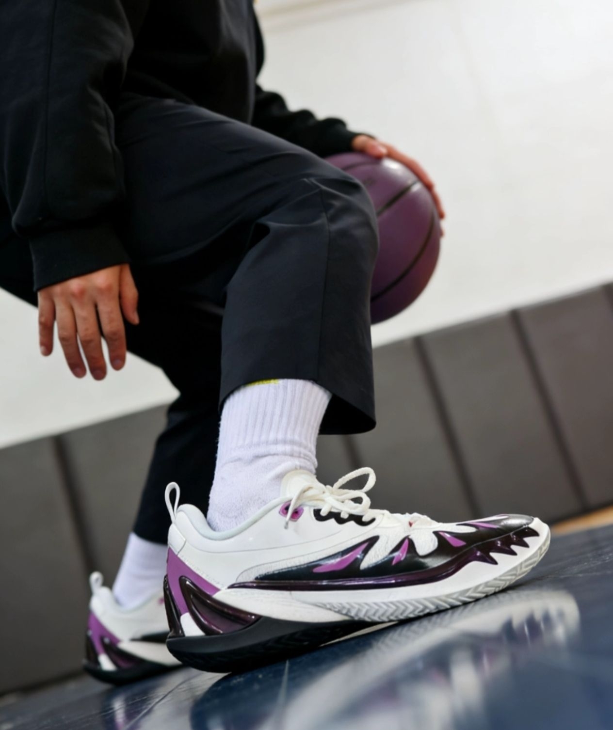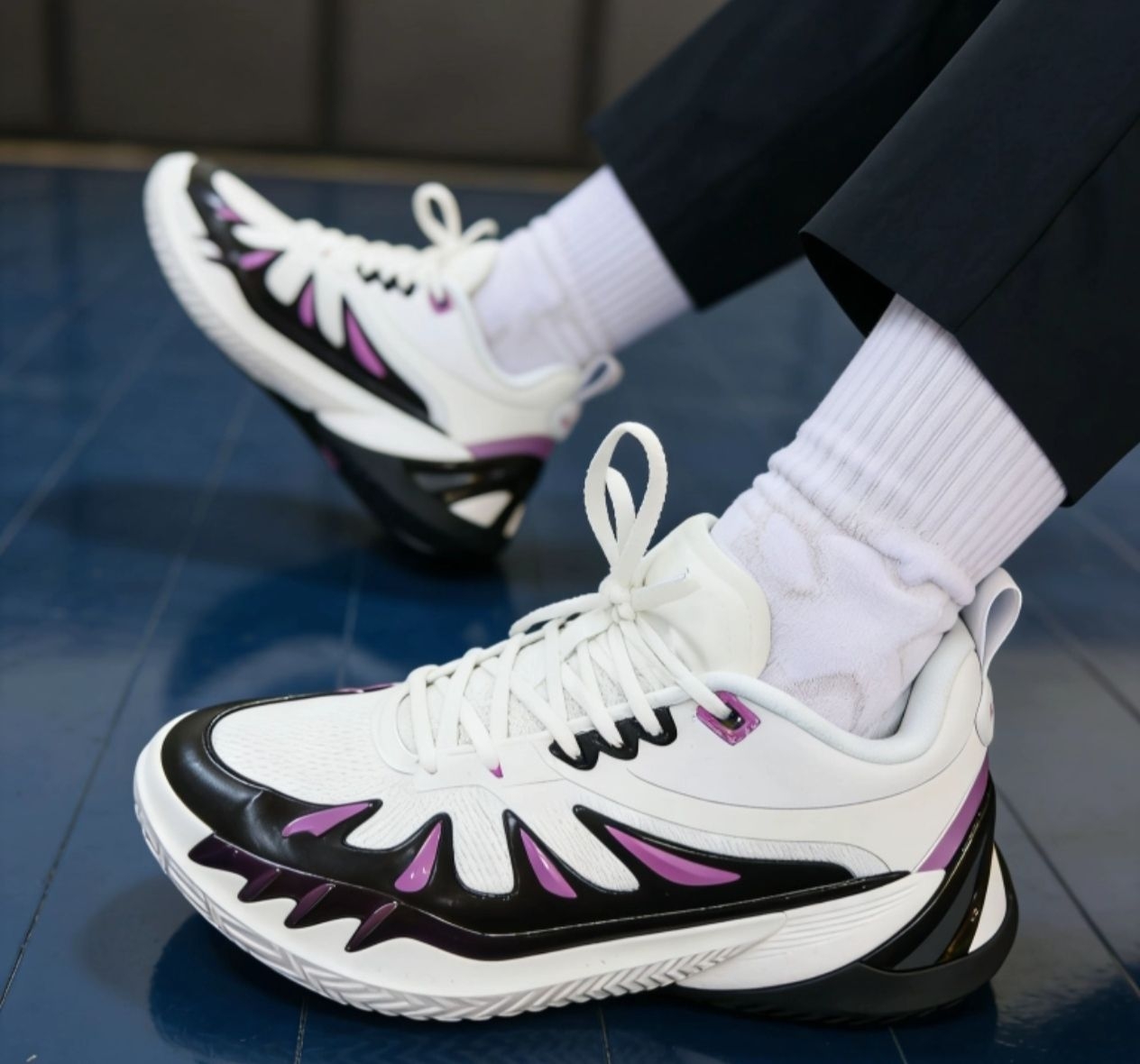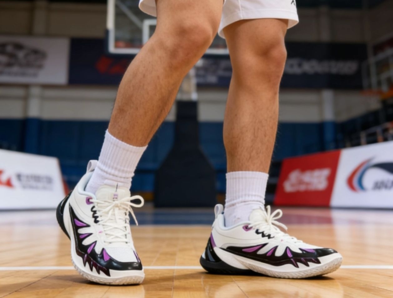 黑白紫的配色看着就很高级,那种流线型的纹路设计,有点像机甲风又带点街头感,拿到手质感也很扎实。今天穿着去球馆打了一下午,上脚踩进去那一下就感觉包裹感刚好,不会挤脚但又能把脚牢牢锁住,急停变向的时候抓地力直接拉满,地板上一点都不打滑,启动的时候也没拖沓感。缓震也很顶,起跳落地的时候膝盖都没那么酸,打完全场脚也没觉得累。 而且这鞋真的不止能打球,平时出门我配个卫裤或者宽松西裤,回头率直接拉满,黑白...