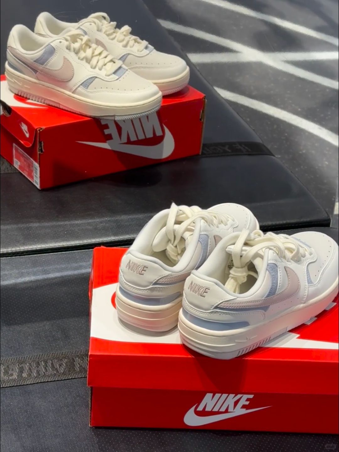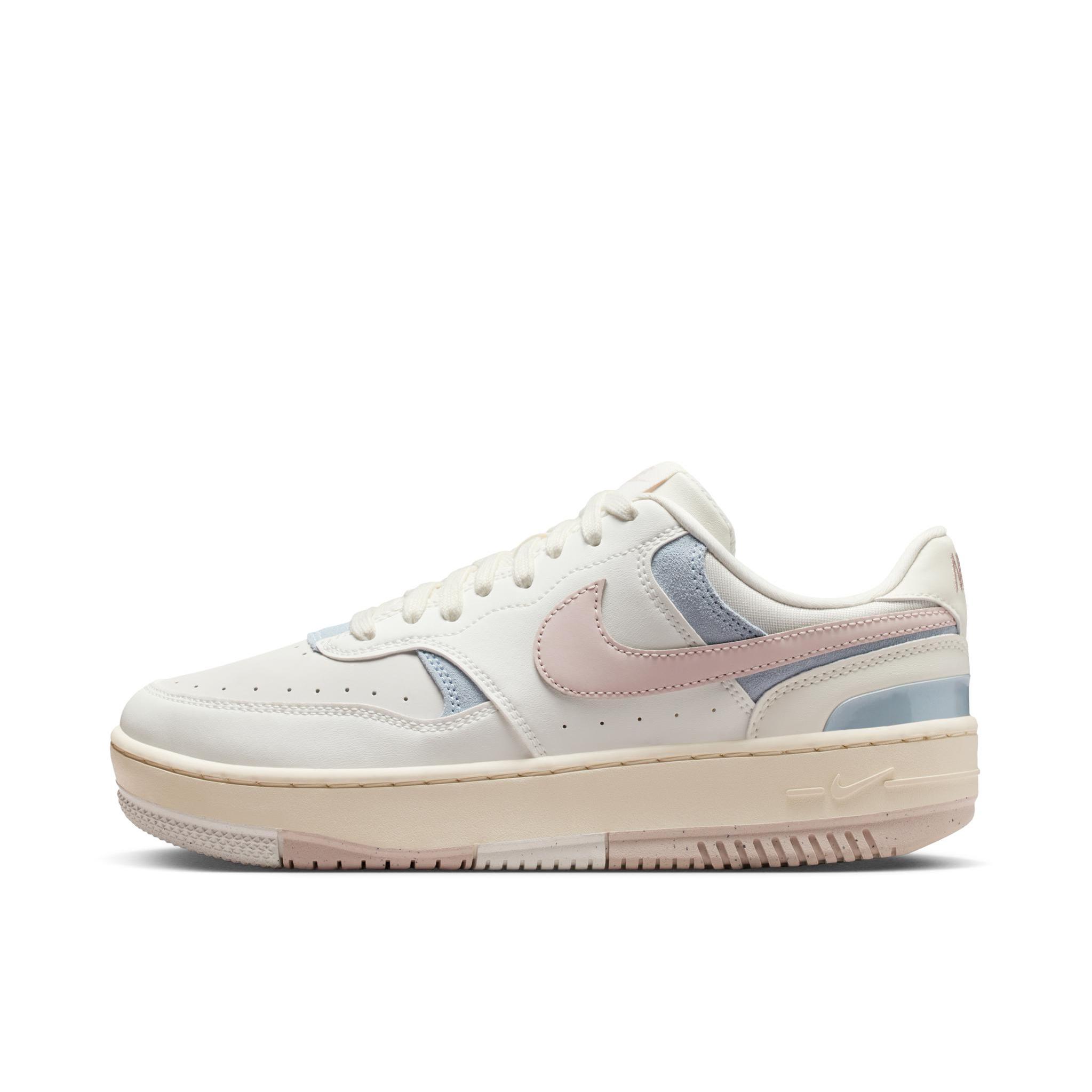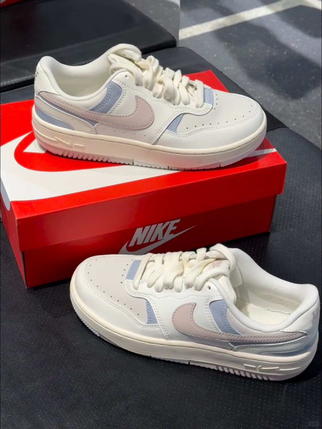 Nike Gamma Force马卡龙板鞋,奶白主色+粉蓝拼接,清新温柔超百搭!复古厚底设计,增高约3cm,缓震效果不错,通勤休闲都OK。鞋面皮质柔软,但鞋底偏硬,初期穿着可能有点夹脚,建议搭配厚袜子或鞋垫缓解哦~配色灵感来自马卡龙,春夏搭裙装或牛仔裤都很出彩,轻松切换多种风格!