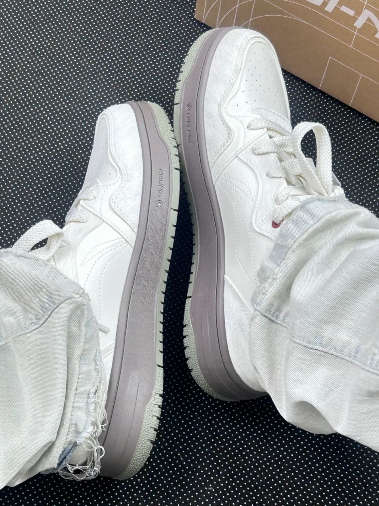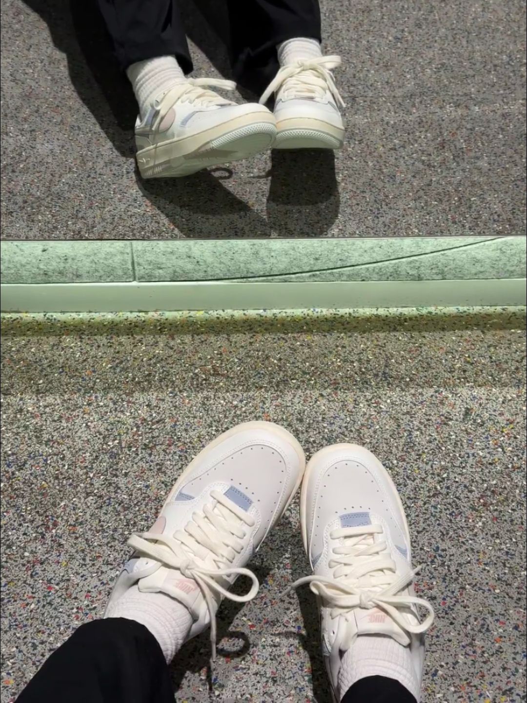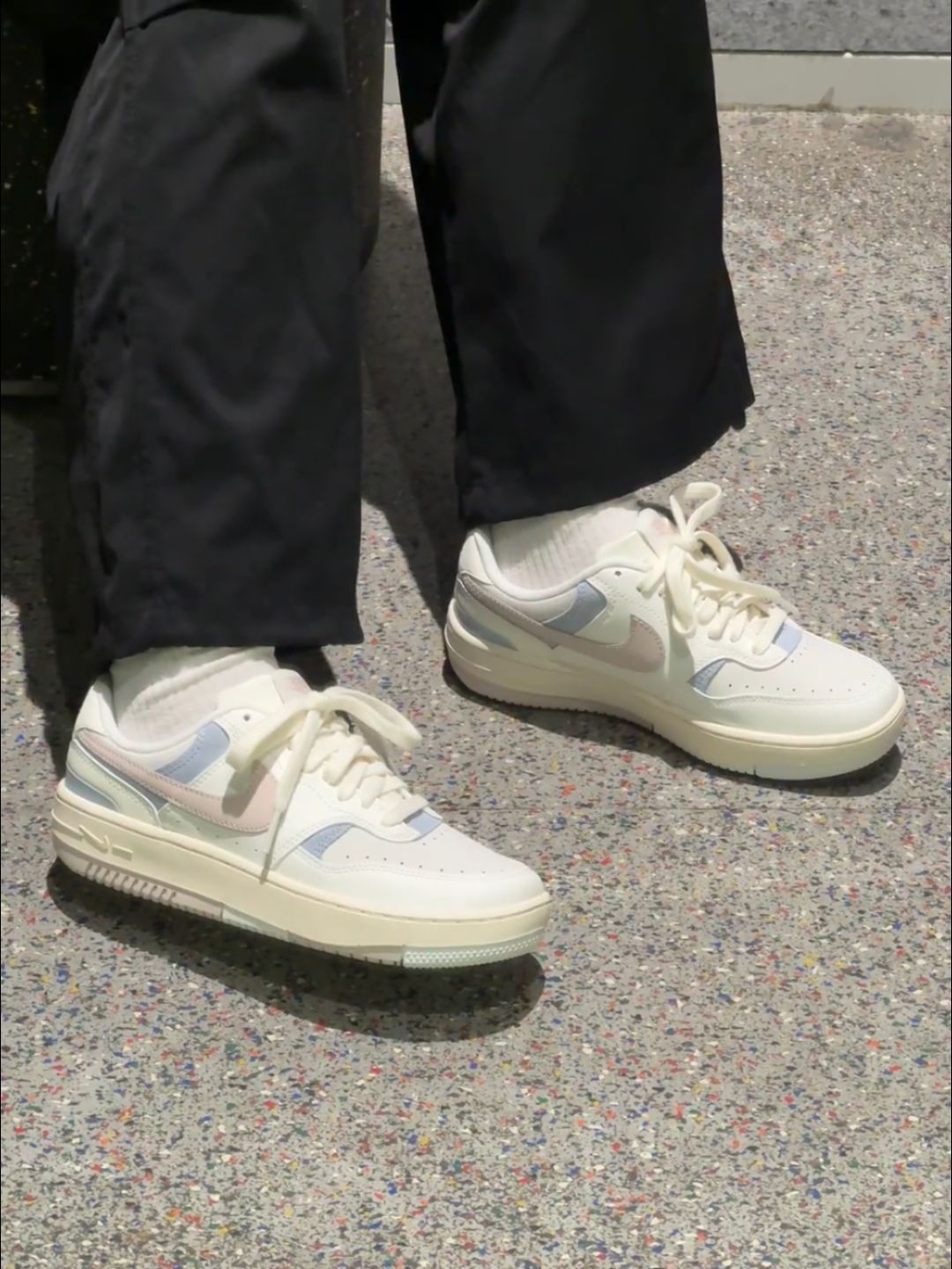 Nike Gamma Force马卡龙板鞋,奶白主色+粉蓝拼接,清新温柔超百搭!复古厚底设计,增高约3cm,缓震效果不错,通勤休闲都OK。鞋面皮质柔软,但鞋底偏硬,初期穿着可能有点夹脚,建议搭配厚袜子或鞋垫缓解哦~配色灵感来自马卡龙,春夏搭裙装或牛仔裤都很出彩,轻松切换多种风格!