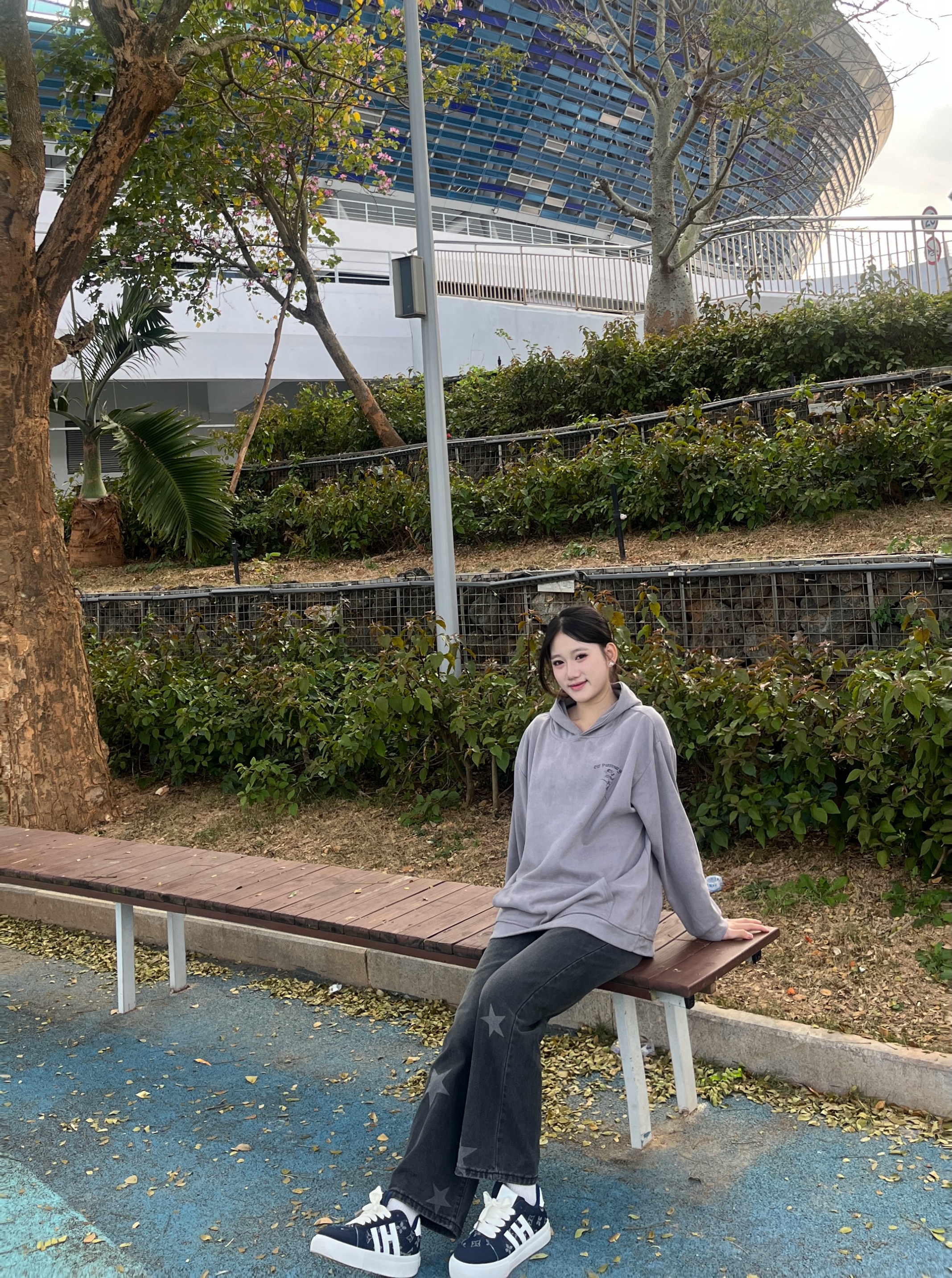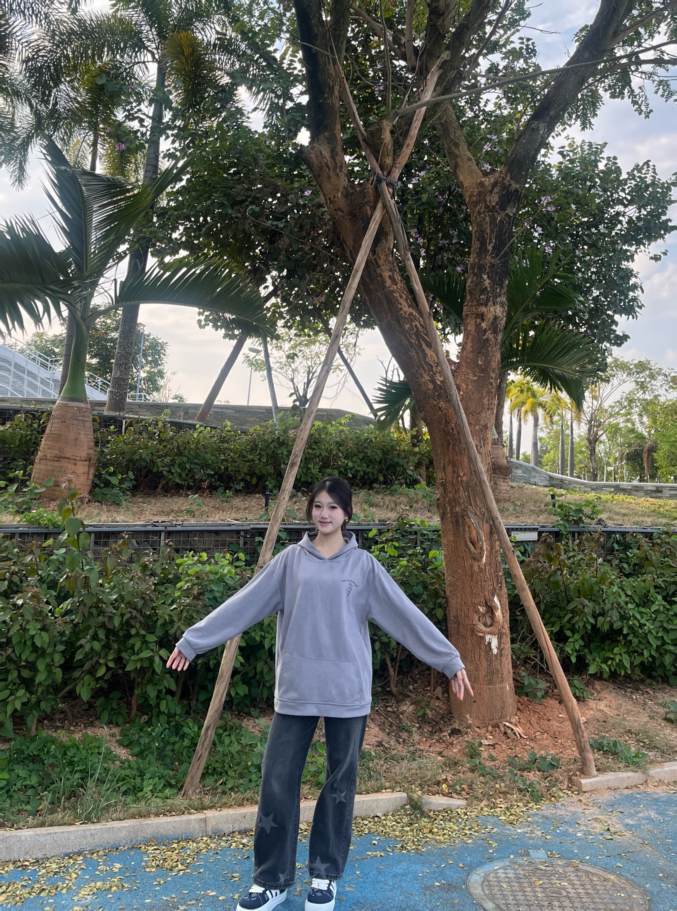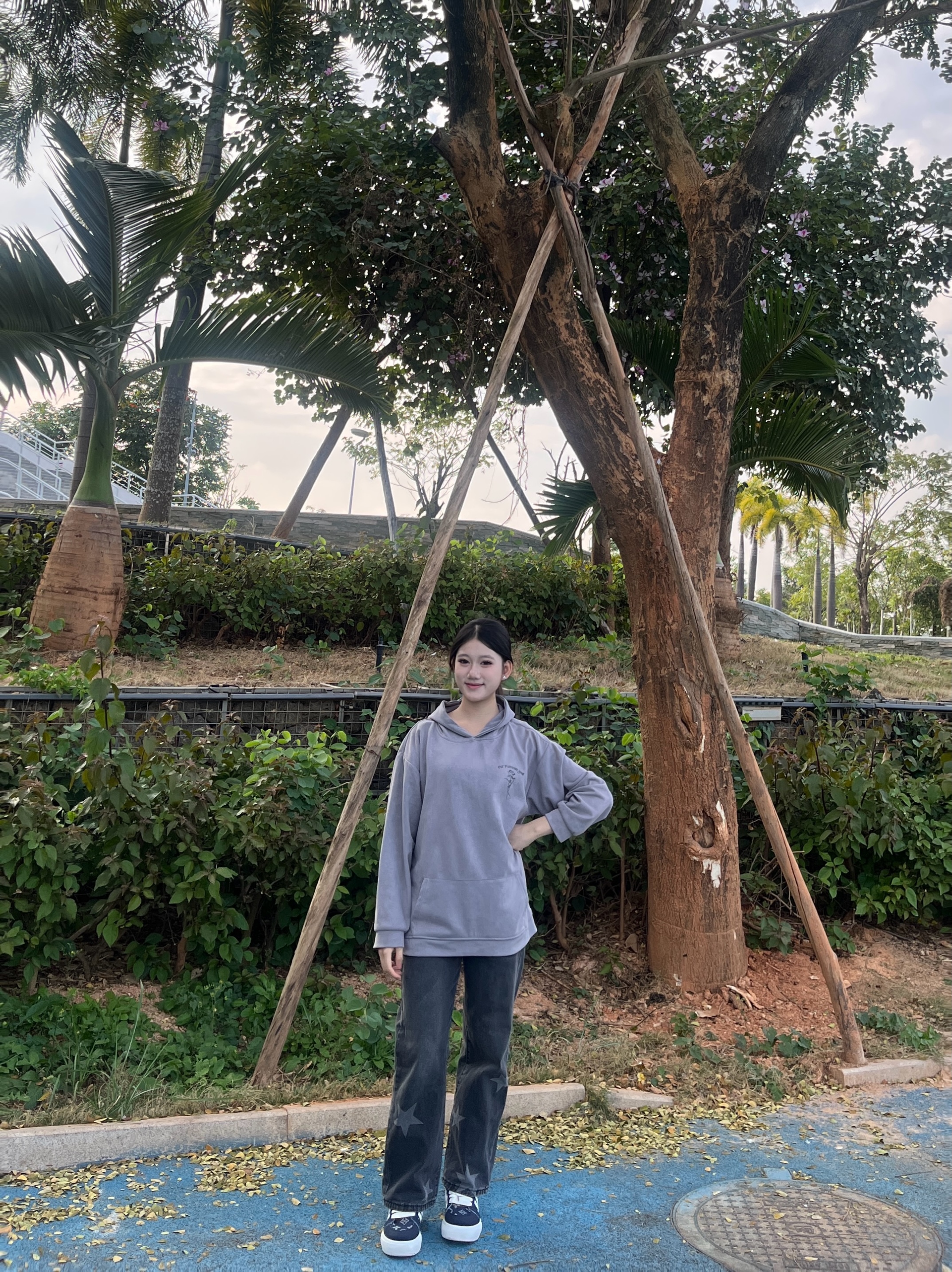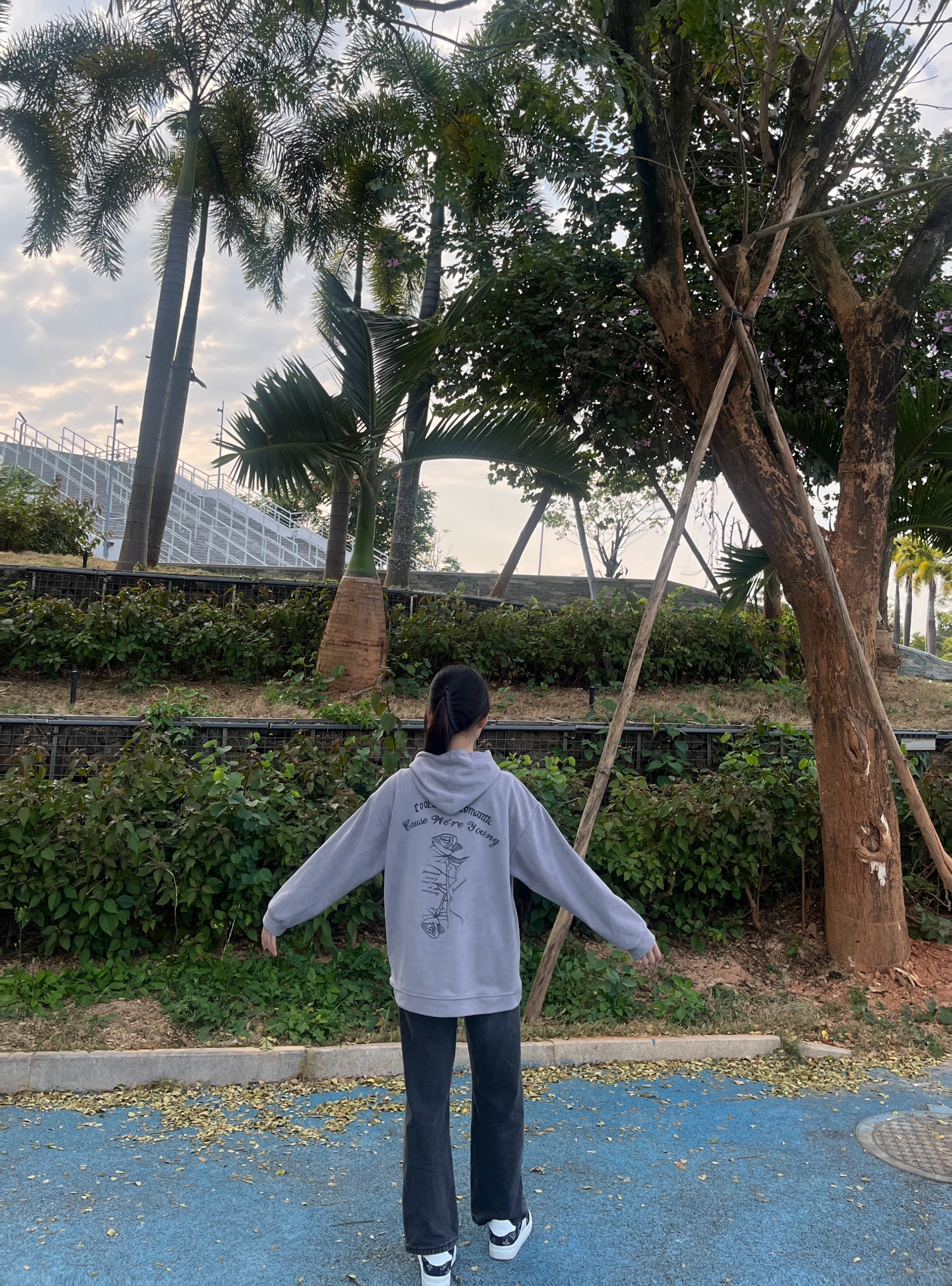 158|92斤 这件灰调连帽卫衣是秋冬刚需单品,软乎乎的面料上身亲肤又保暖。 宽松落肩的版型对各种身材都很友好,不挑人穿。 背后的玫瑰线条印花低调又带点小心思,让基础款不再单调。 搭配牛仔裤就是松弛感满满的日常穿搭,不管是上学通勤还是周末出门散步都合适,慵懒又耐看,是可以穿一整个秋天的宝藏单品!