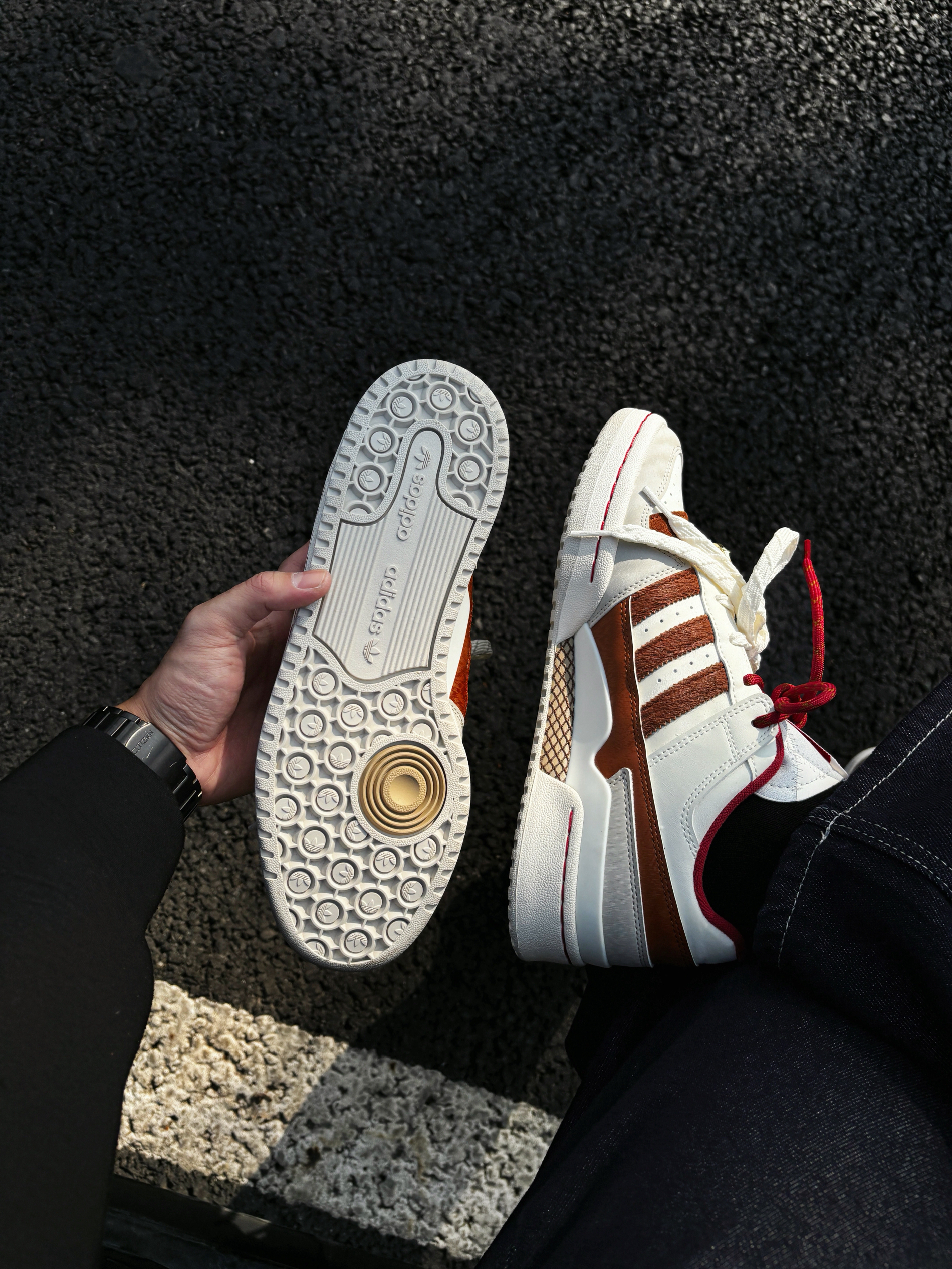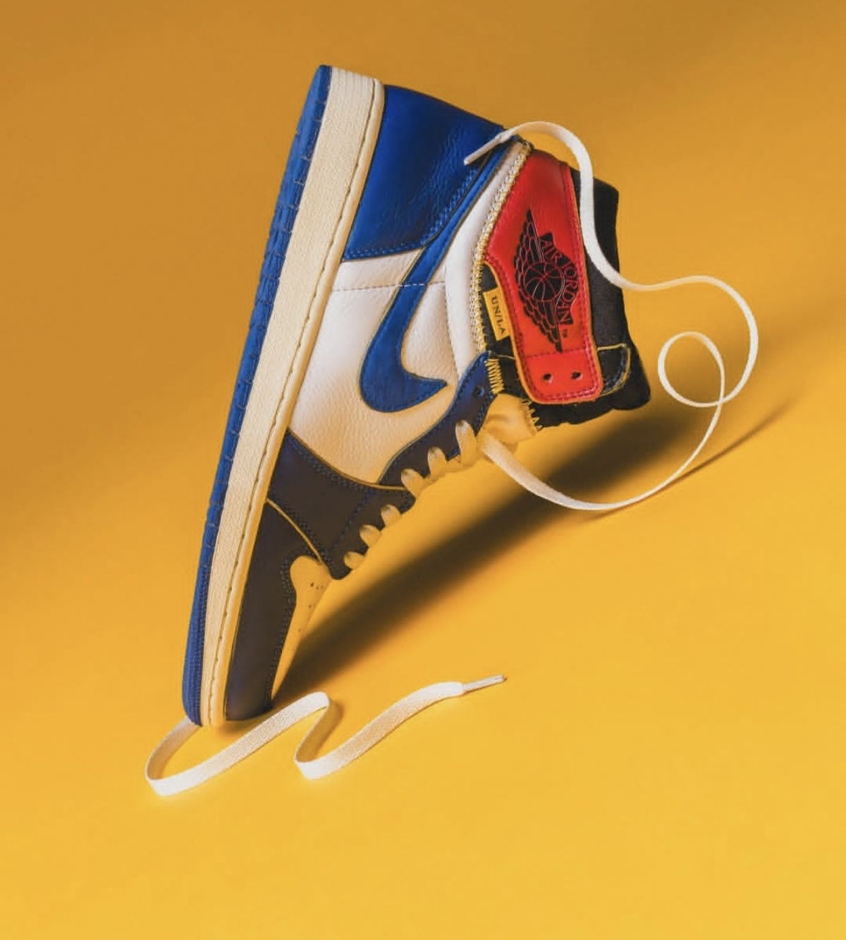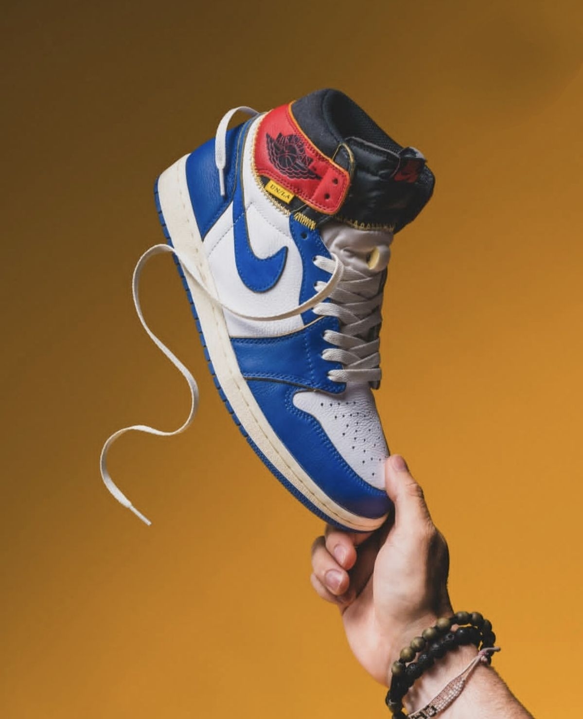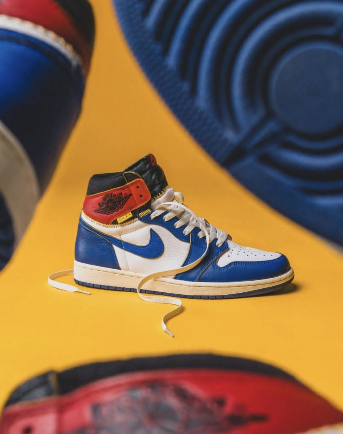 - 拼接解构设计:以AJ1元年配色为蓝本,将黑红、风暴蓝、灰白等色块通过金色缝线拼接,视觉冲击力极强,诠释“重生”设计概念。 - 复古细节点缀:鞋舌外露海绵、金色车线与醒目的“UN/LA”标签,还原90年代复古质感;飞翼LOGO下方印有联名专属标识,辨识度拉满。 - 做旧中底处理:米黄色中底模拟自然穿着痕迹,弱化了传统球鞋的“崭新感”,更契合当下复古做旧的潮