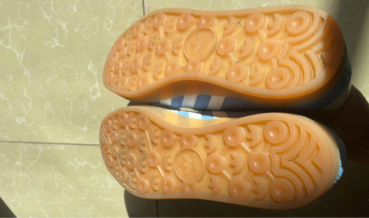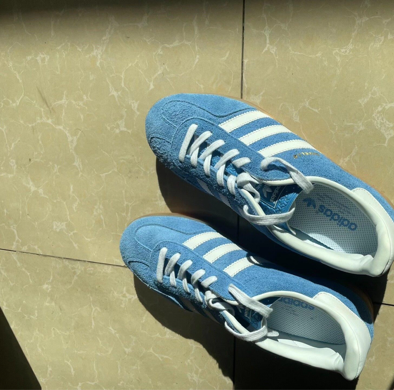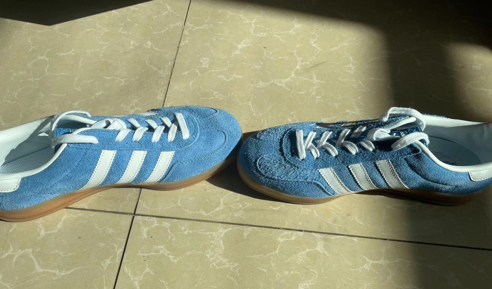 谁懂啊家人们!刚上脚这双Adidas Gazelle Indoor直接把春日松弛感焊在脚上了✨ 蓝白翻毛皮+生胶底的组合,复古又清新,完全是今年必冲的宝藏鞋款! ✨ 颜值细节 • 材质质感:浅蓝色翻毛皮软fufu的,摸起来巨舒服,纹理细腻显高级,白色三条杠和鞋尾皮质拼接,走线工整到细节控狂喜。 • 复古细节:鞋身侧面的金色“GAZELLE”小标太点睛了!生胶底自带做旧感,阳光底下泛着暖调光泽,...