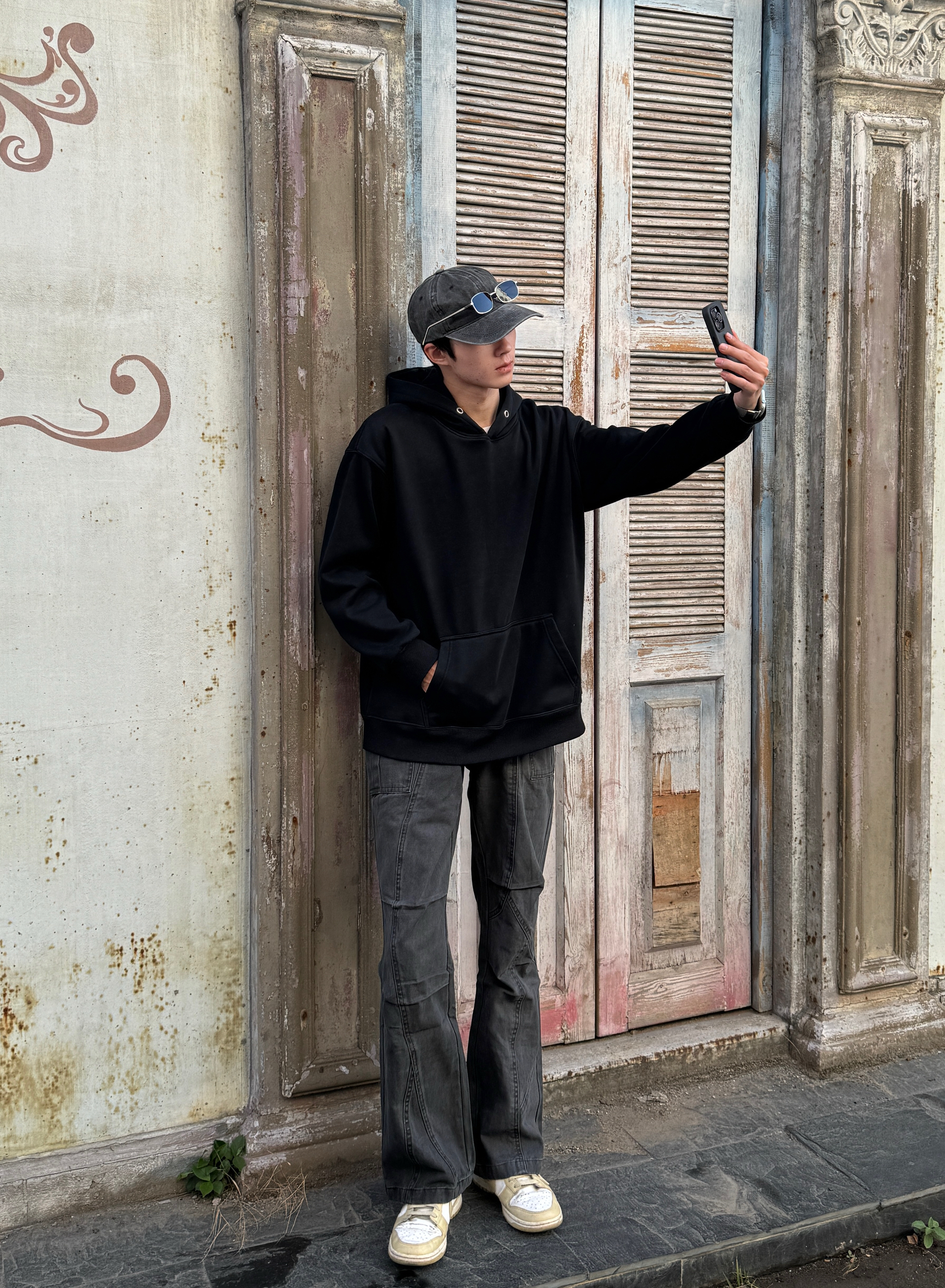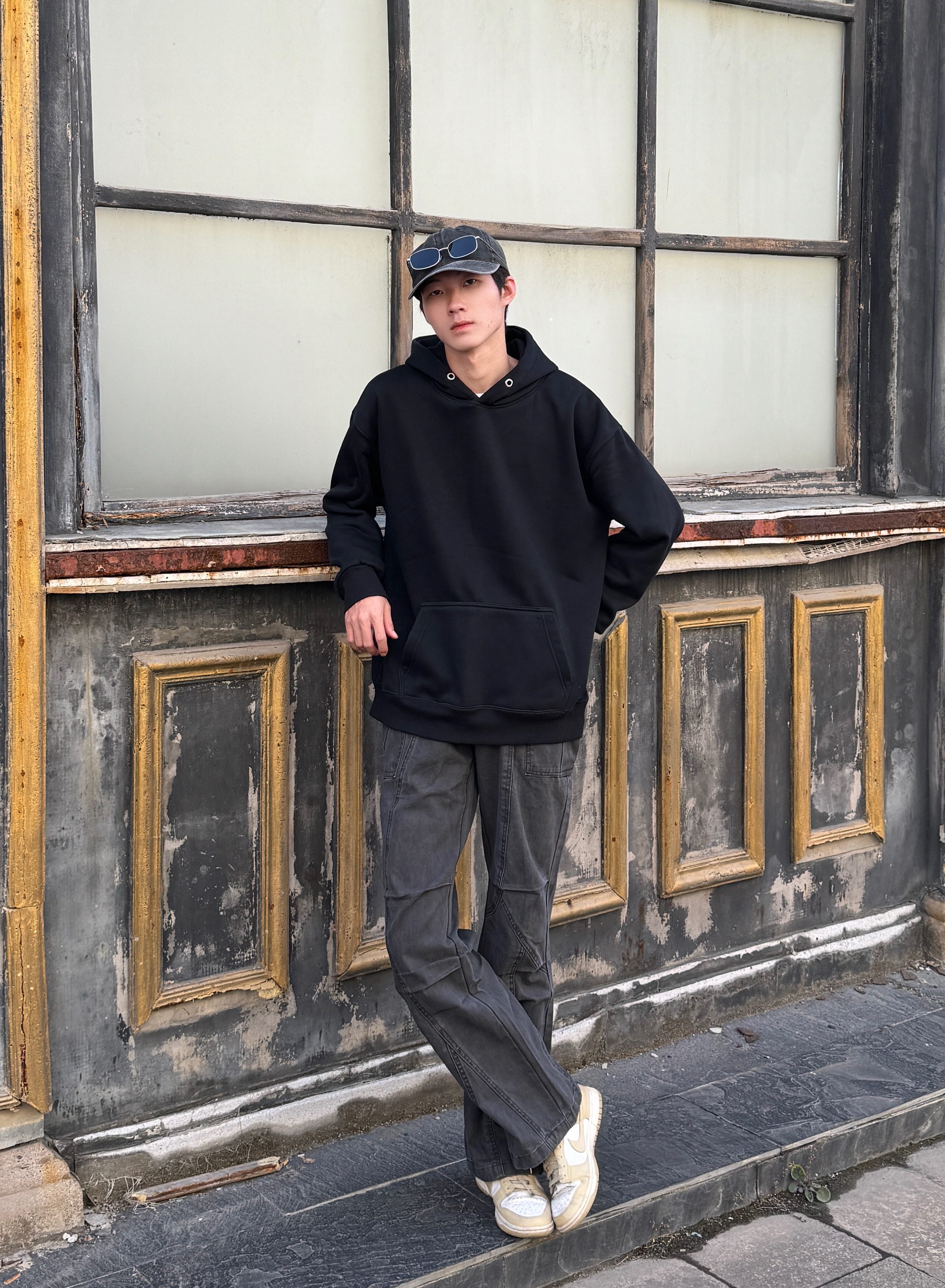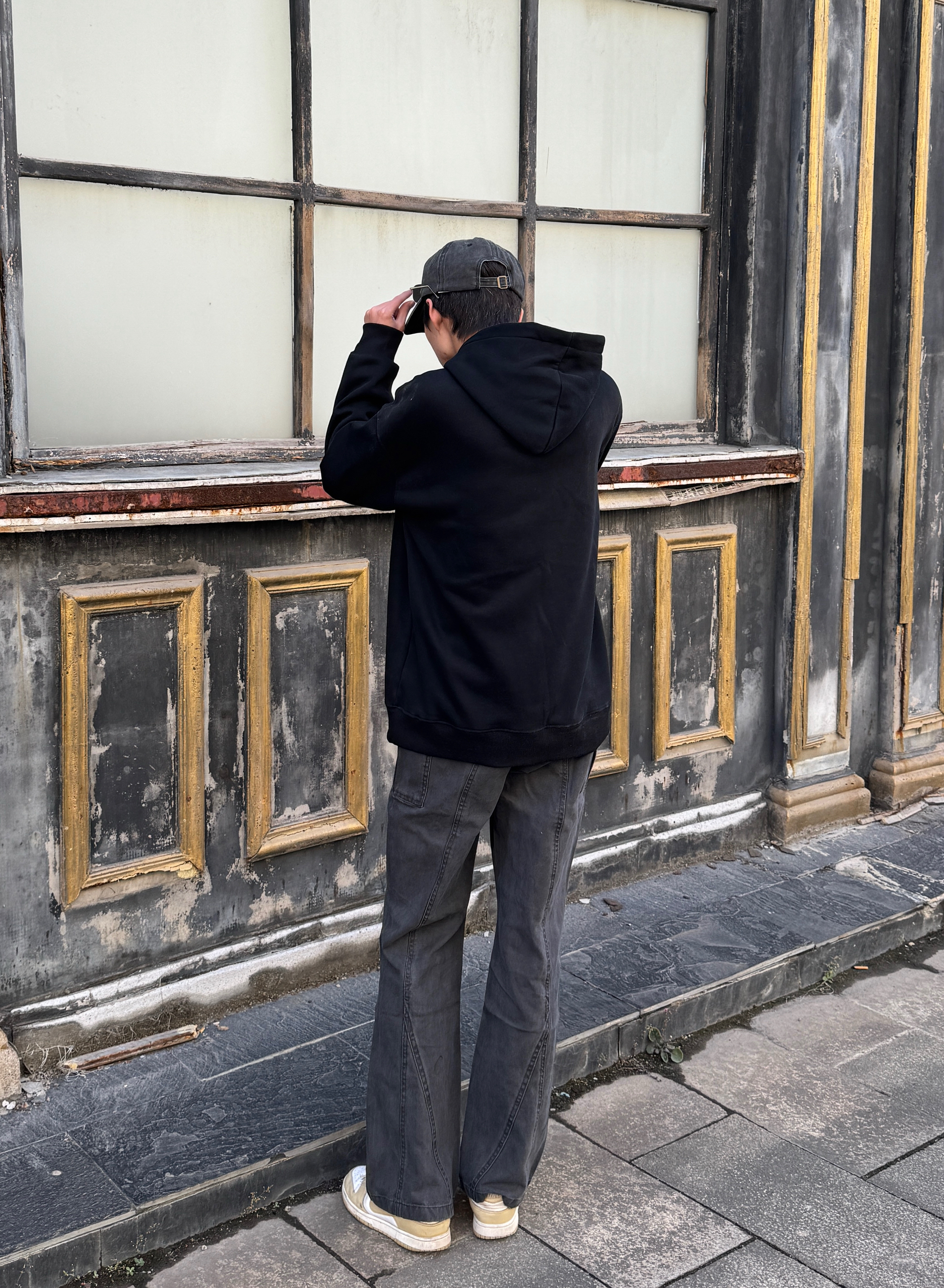 今天这身灰黑叠buff 灰色棒球帽压低檐角🧢 黑色连帽卫衣叠出层次感 灰调工装裤带点微喇剪裁 宽松但利落 走起路来带风🌀 整套灰黑渐变像天色将暗 慵懒里带点飒气 出门随手拍都出片📸