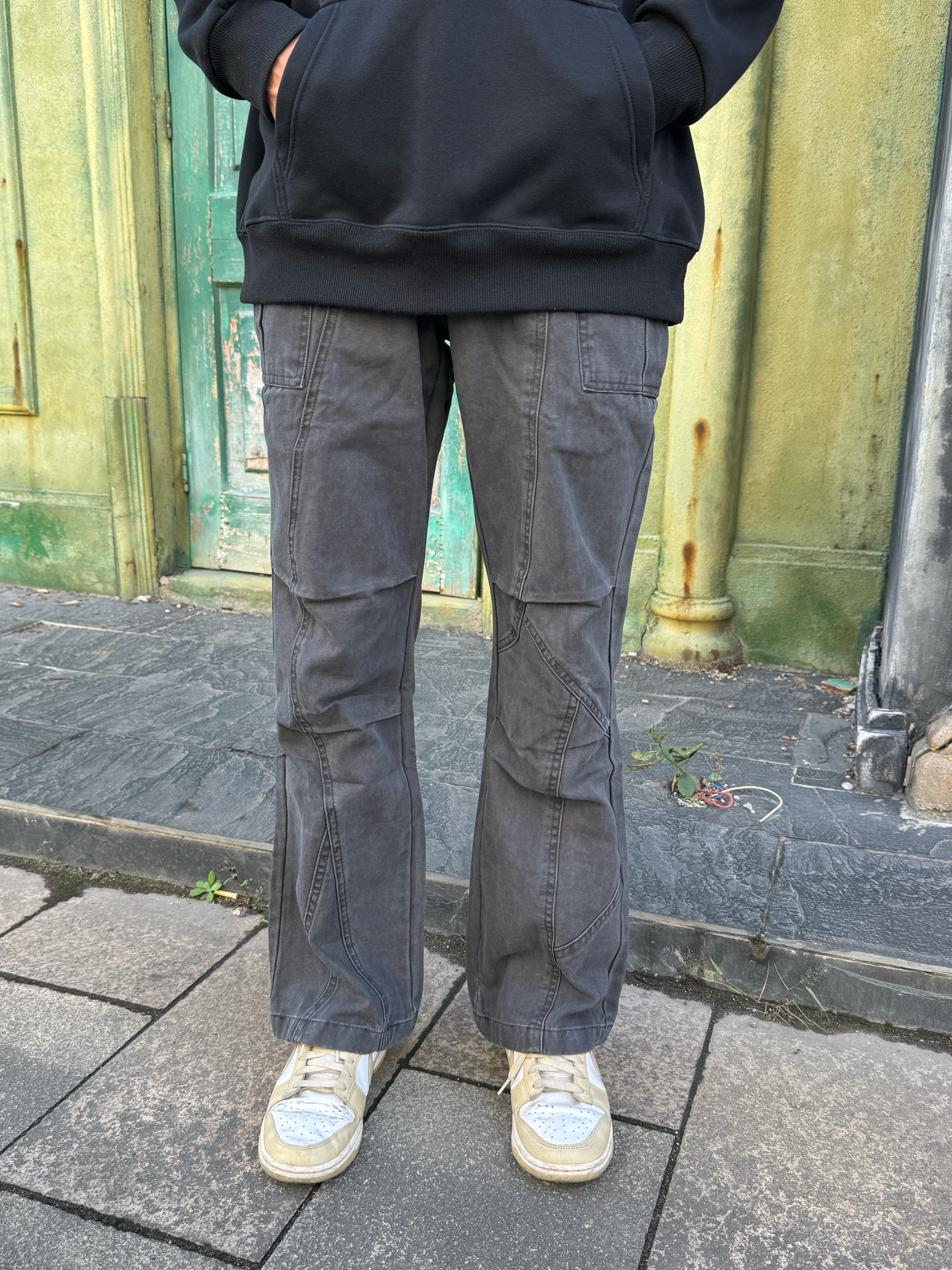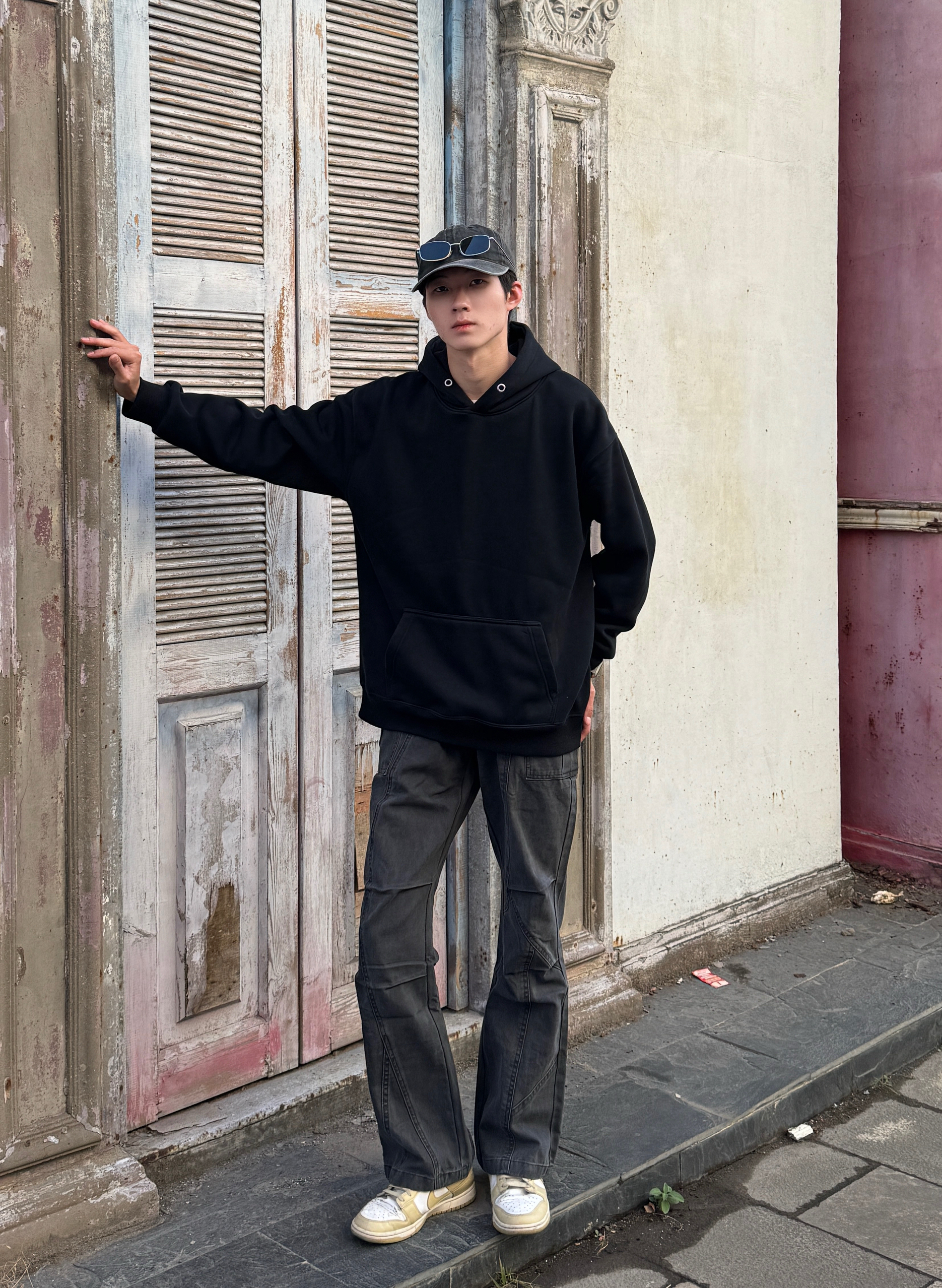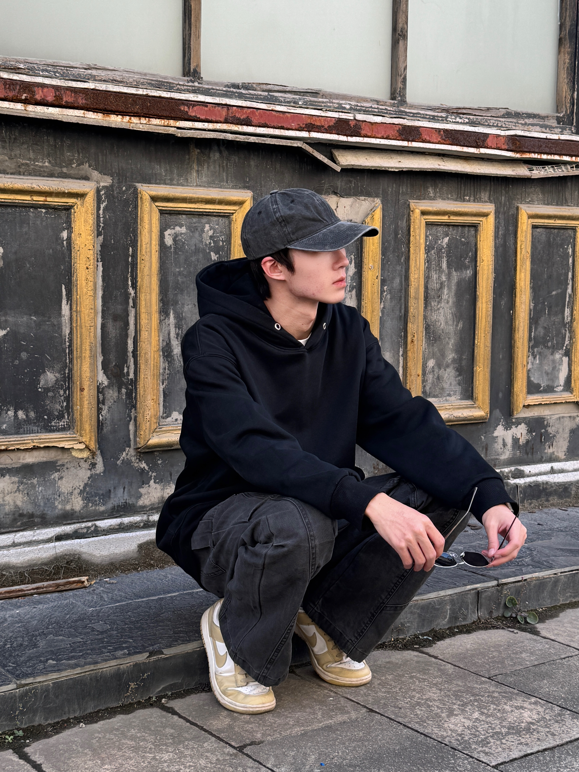 今天这身灰黑叠buff 灰色棒球帽压低檐角🧢 黑色连帽卫衣叠出层次感 灰调工装裤带点微喇剪裁 宽松但利落 走起路来带风🌀 整套灰黑渐变像天色将暗 慵懒里带点飒气 出门随手拍都出片📸