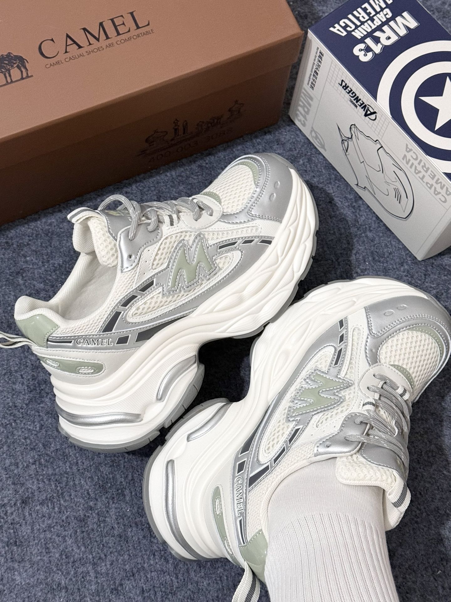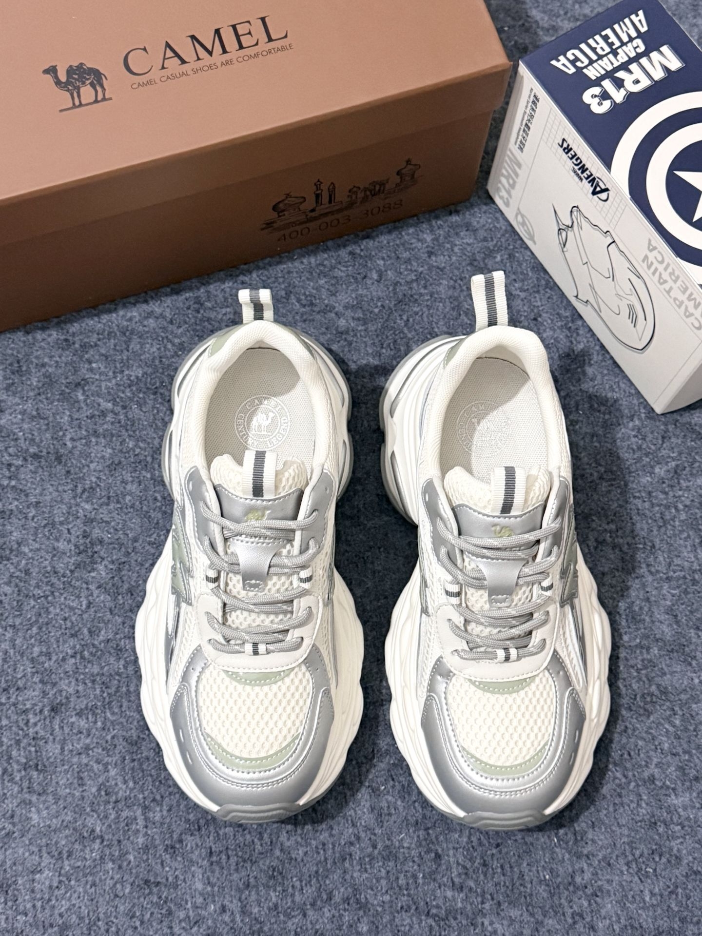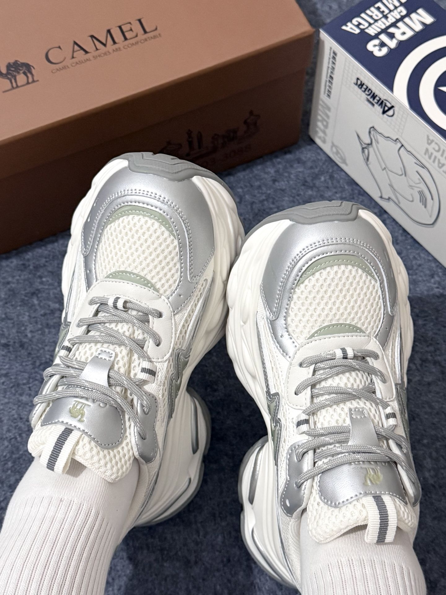 就素骆驼家的滴介双老爹鞋呀 它和我的耳机有点搭喔 银色y2k风我感jio巴里巴气滴 搭配上牛仔裤or休闲裤都阔以捏 我穿了一天也不觉得脚累 穿上它带上耳机我要粗去玩啦~