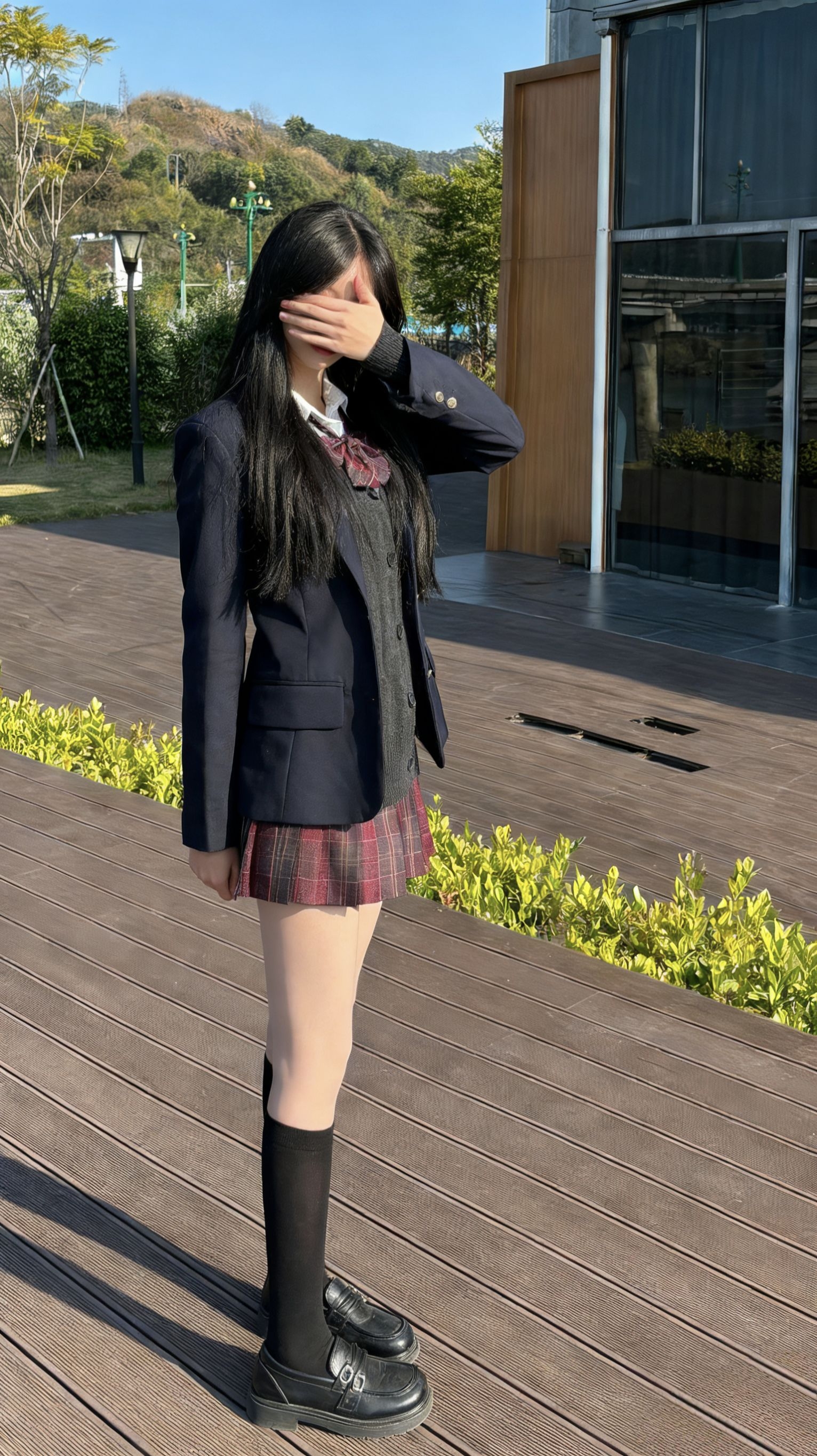 👔 今日穿搭:藏青西装+深灰开衫+红格裙+黑色小腿袜 ☁️ 今天是元气满满的学院风女孩!叠穿真的是秋冬JK的灵魂,藏青西装自带正统感,配上软糯的深灰开衫,保暖又不显臃肿,红格裙在深色系里跳出来,瞬间点亮整套搭配。 🖤 小腿袜必须是显瘦神器!视觉上直接拉长腿部线条,搭配厚底乐福鞋,小个子也能拥有超模比例~ 📸 拍照的时候用手机挡脸,氛围感直接拉满,谁拍谁好看! 💡 小tips:这种叠穿法很适合南方的...