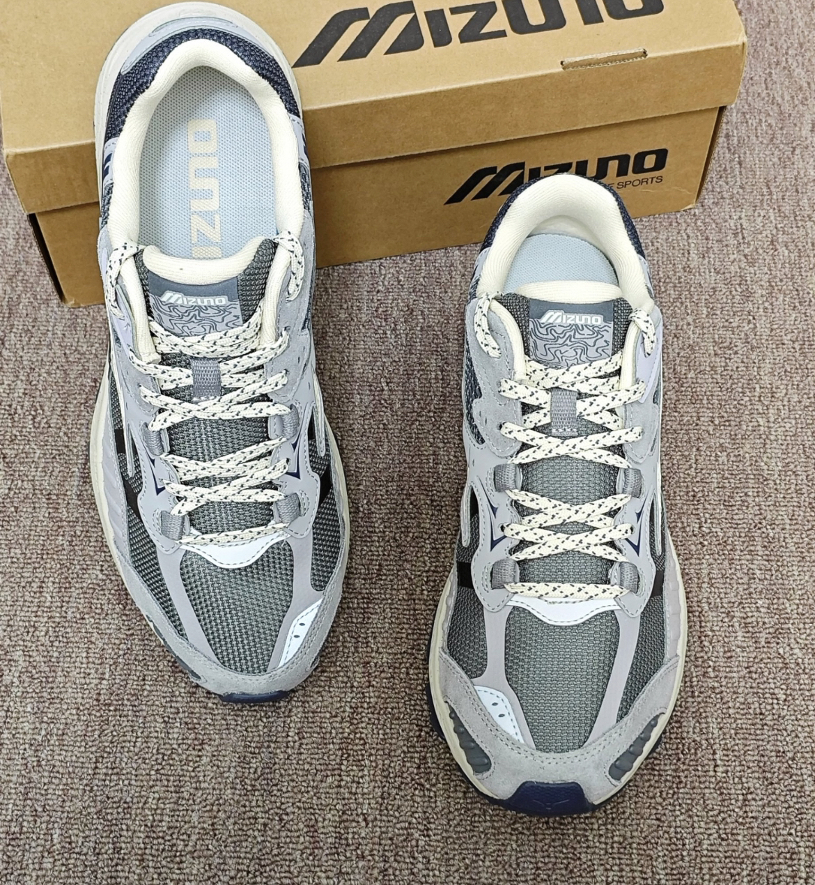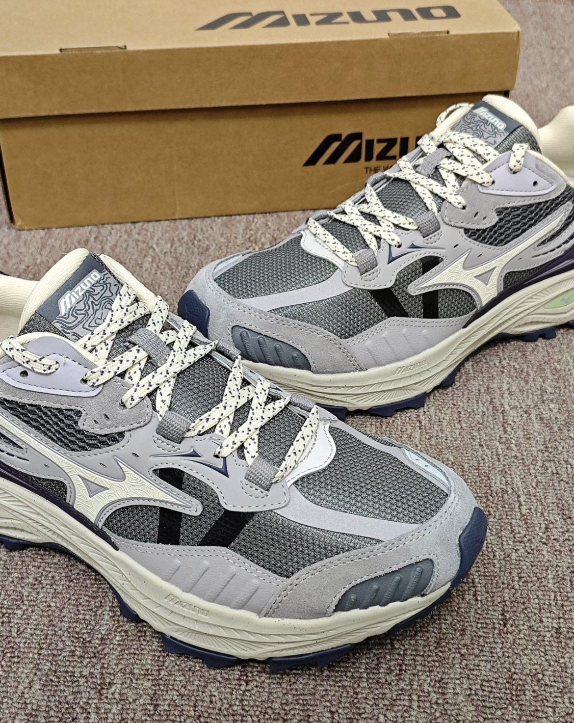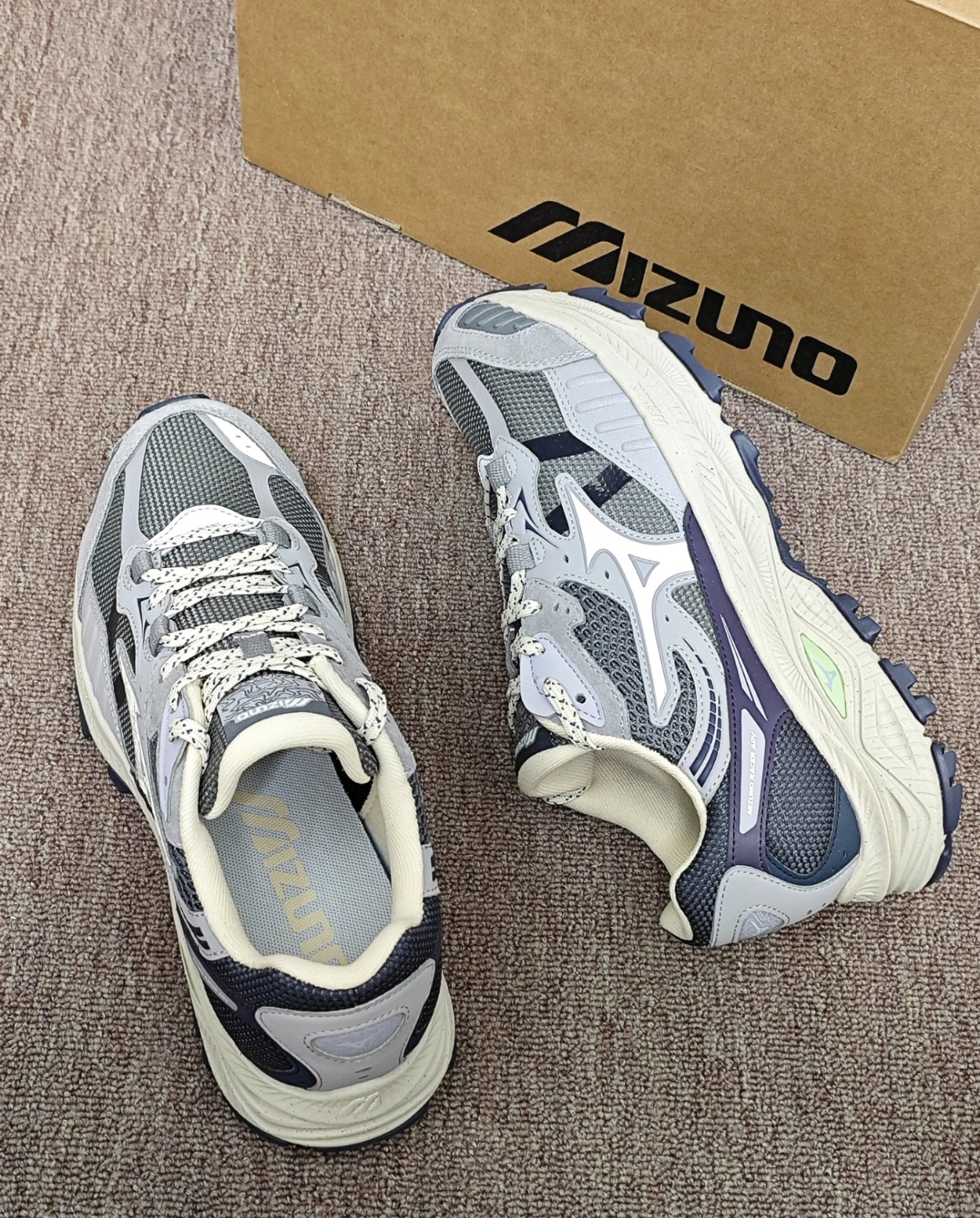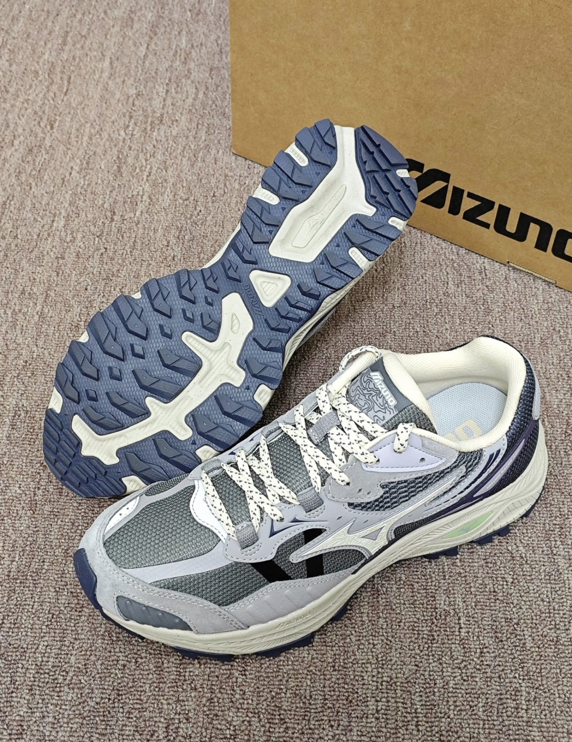 俺今天分享的是这双Mizuno 户外复古跑鞋✨ 灰紫渐变拼色就蛮复古的 好适合冬天🉑 鞋底软乎乎的 爬了一下午的山也没酸胀感☁️ 鞋面的材质看着就透气不会闷脚💨 日常通勤、运动跑步、户外登山搭配个黑色直筒裤或者宽松运动裤都是蛮不错滴~