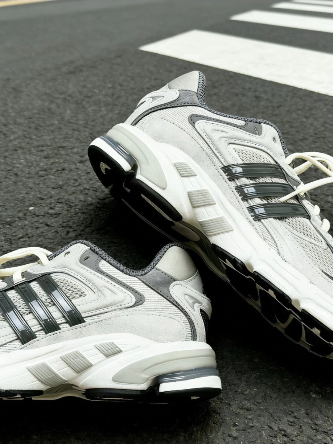 周末出门随手搭的一双鞋,没想到成了路人问了两次的“心头好”。 做旧灰的网面拼接麂皮,鞋带是泛黄的米白色,复古感直接拉满,像从衣柜翻出的旧物,自带松弛滤镜。 脚感软而不塌,中底的回弹刚好,暴走一下午也不累。配宽松牛仔裤是美式复古风,搭运动裤又能穿出慵懒感,属于不用刻意想搭配的百搭款。 站在斑马线旁拍了几张,柏油路的黑和鞋身的灰意外和谐,是这个季节会反复穿的一双鞋~