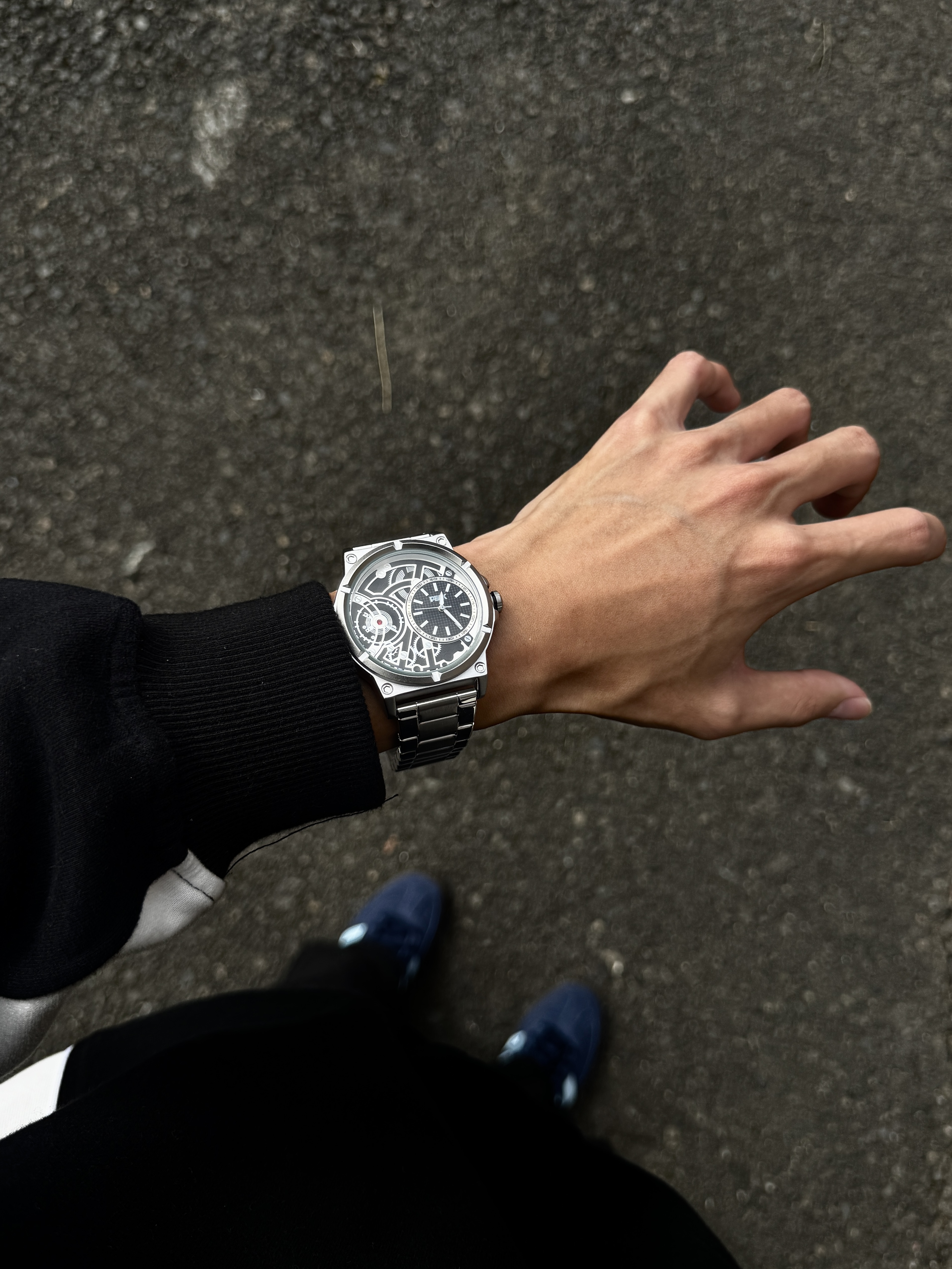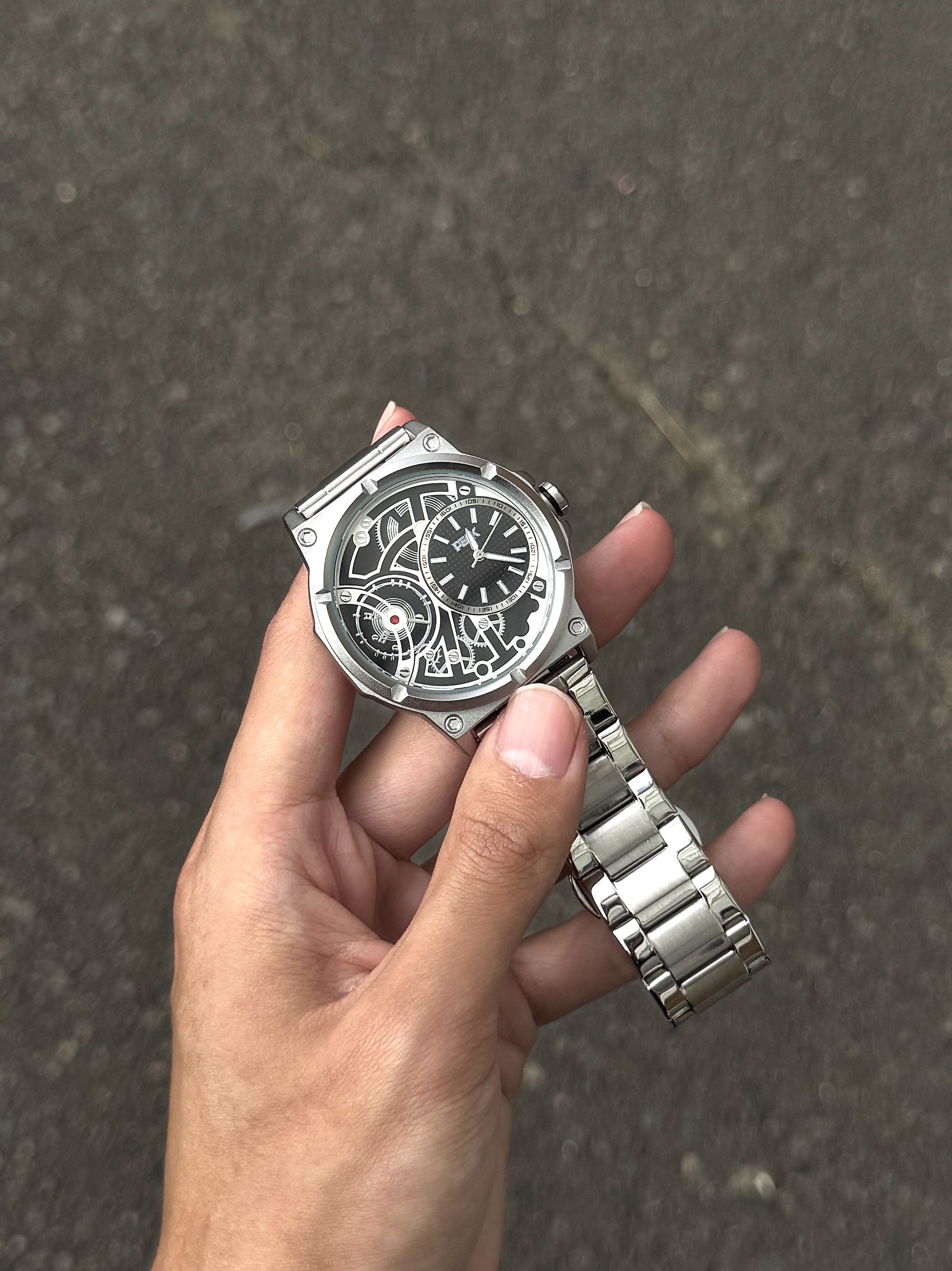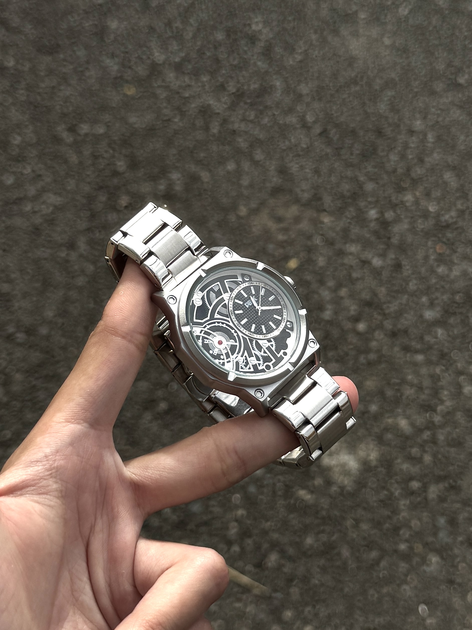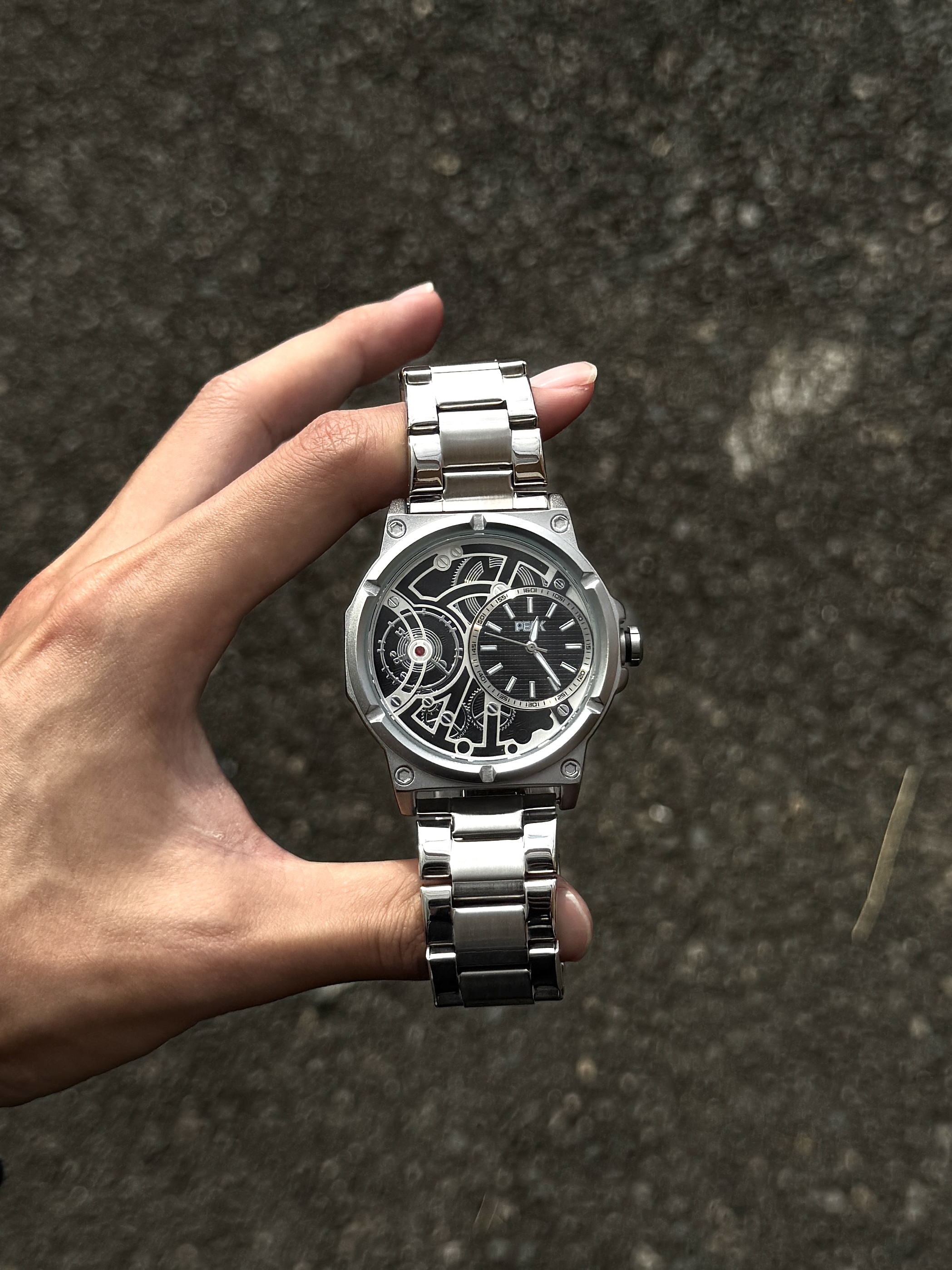 自从入手了介块手表 我总会不经意地抬手看表 这表整体以银色为主 简约又大气 表盘设计很有个性 镂空设计还能看见齿轮运转 日常戴着也很顺手 简简单单搭配休闲风就蛮好看