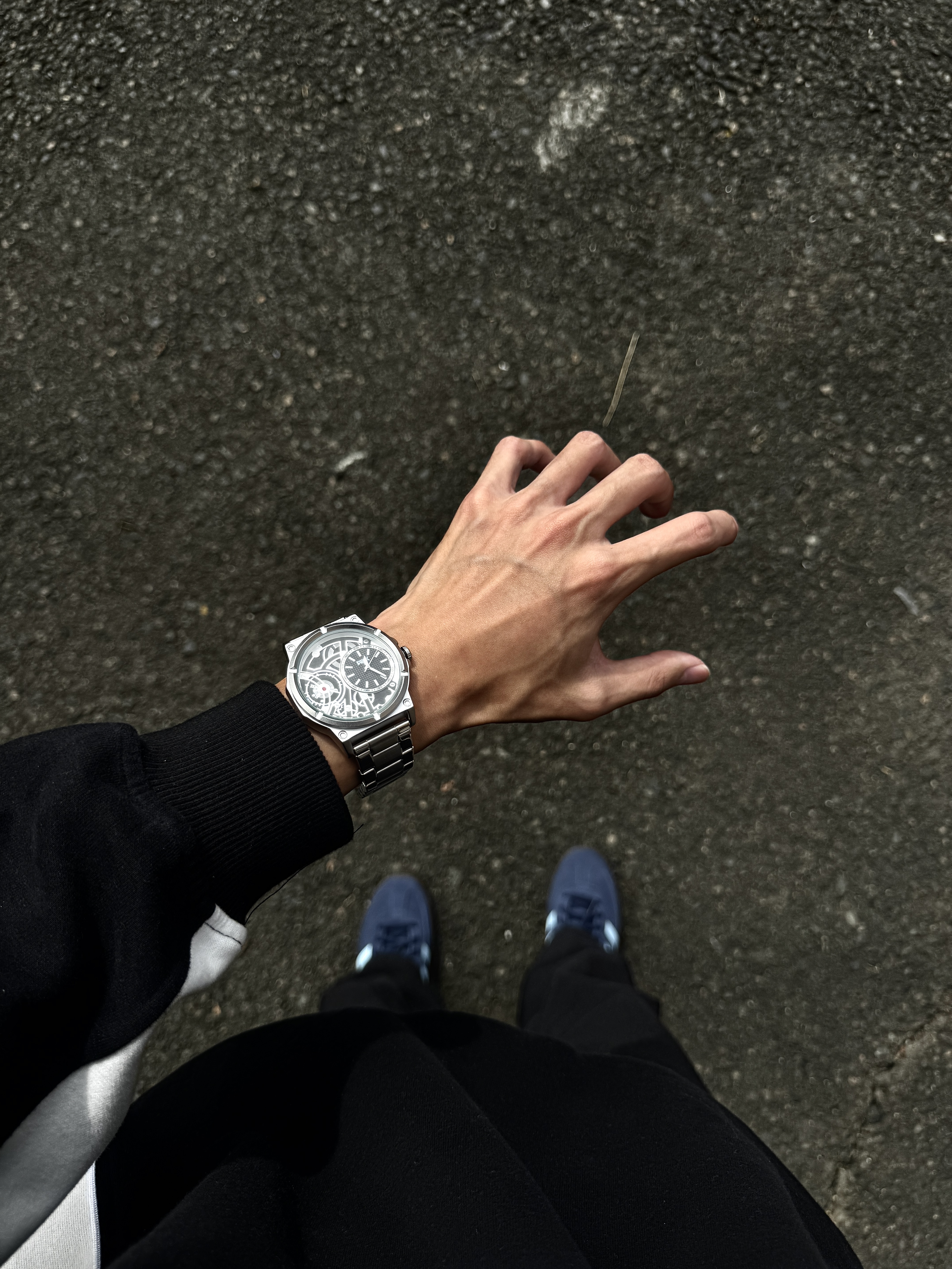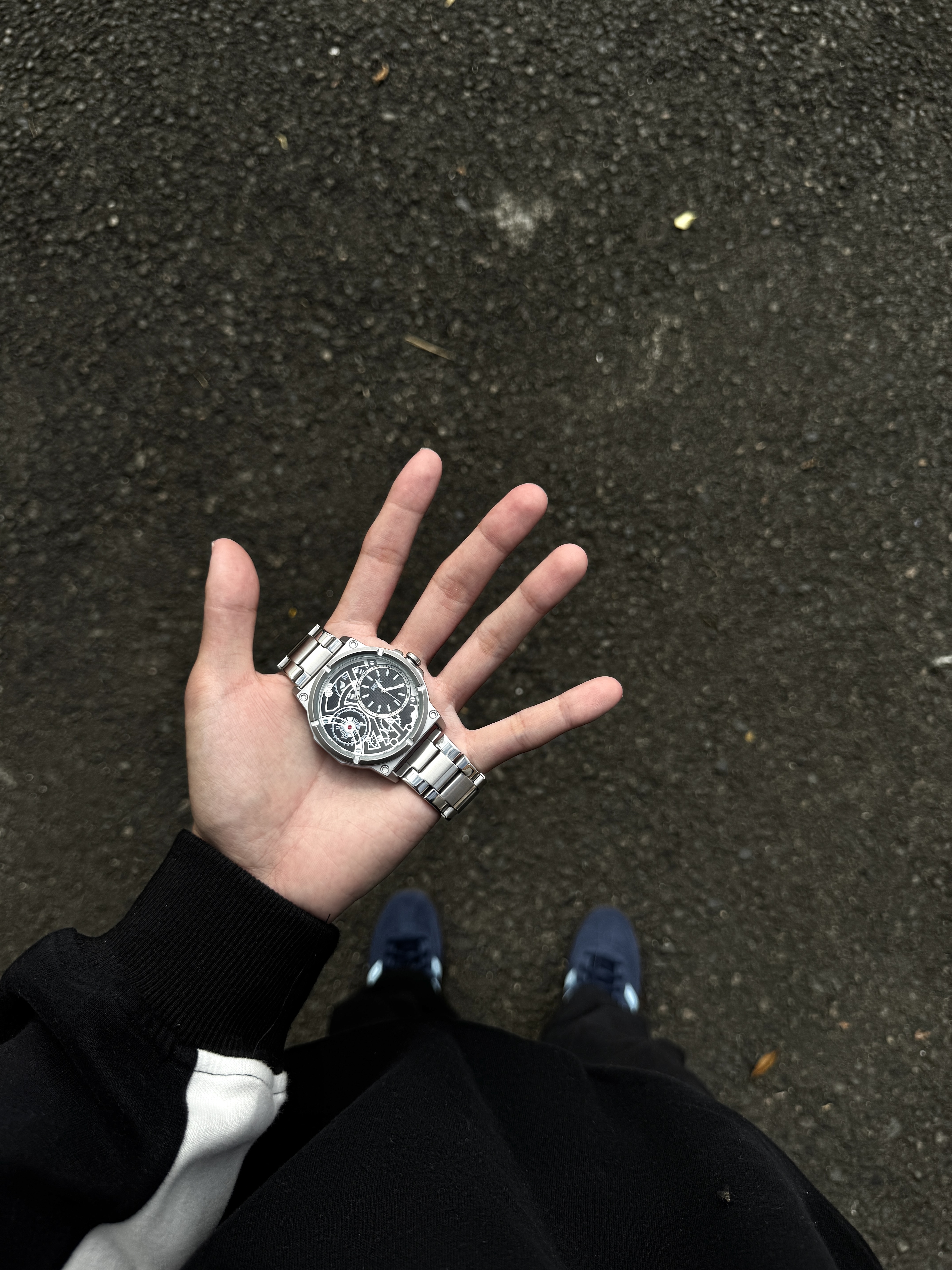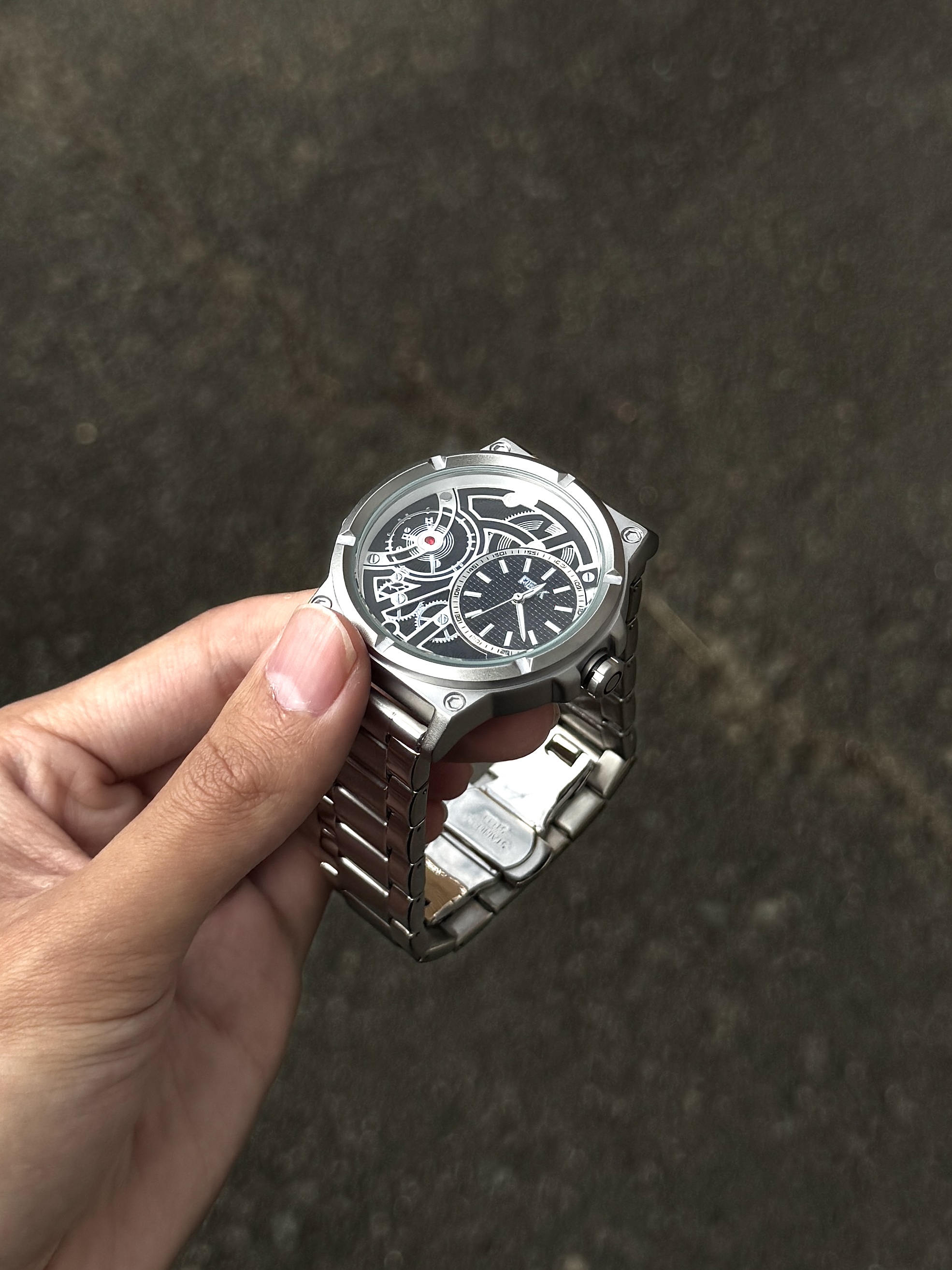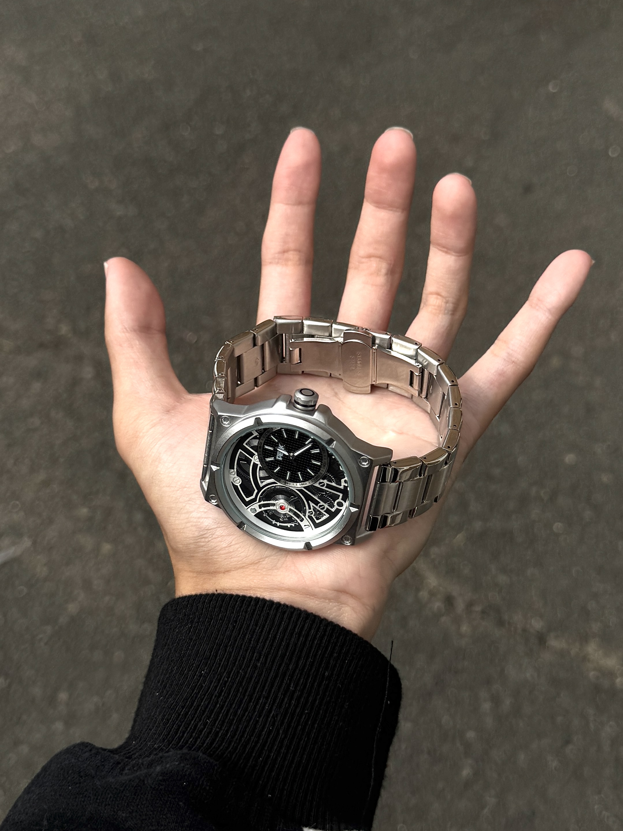 自从入手了介块手表 我总会不经意地抬手看表 这表整体以银色为主 简约又大气 表盘设计很有个性 镂空设计还能看见齿轮运转 日常戴着也很顺手 简简单单搭配休闲风就蛮好看