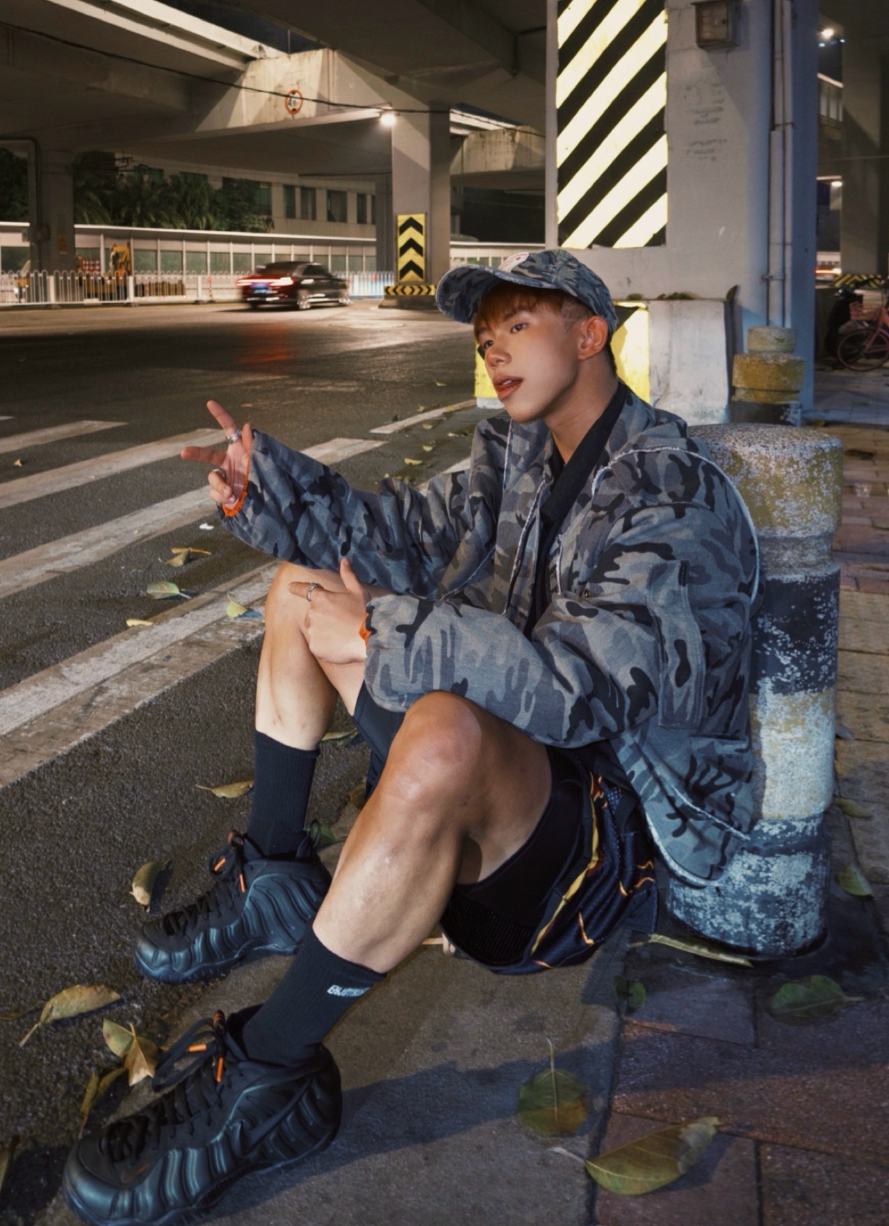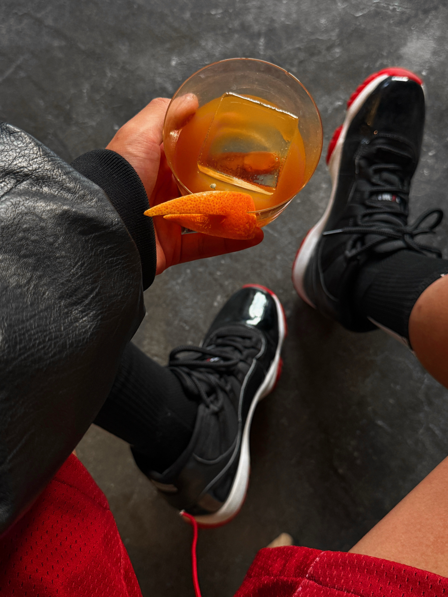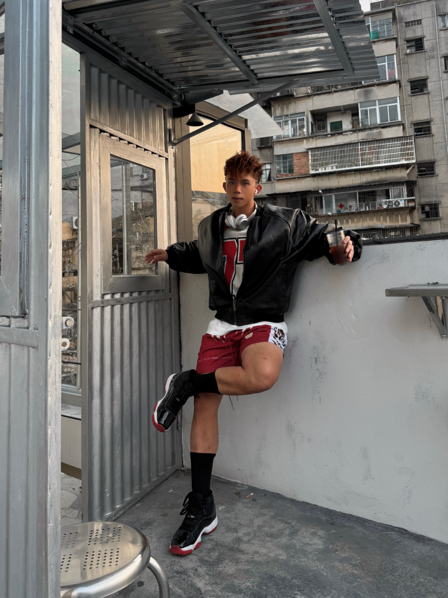 在珠江边的旧厂房咖啡店 用一双AJ 11黑红加几个构图技巧 十分轻松拍出一组美式味超浓的大片🙋🏻♂️ 廓形黑皮夹克加红白撞色印花T恤 酒红色网眼运动短裤加黑长袜 再搭配AJ 11黑红的亮面漆皮鞋面 傍晚柔光下自带反光效果 十分上镜🕶️ 1️⃣低角度仰拍 放大球鞋细节和腿部线条 同时让背景的旧墙更有延伸感 2️⃣站立倚靠姿势 单手扶着台阶 重心放一条腿上 另一条腿自然弯曲 人...