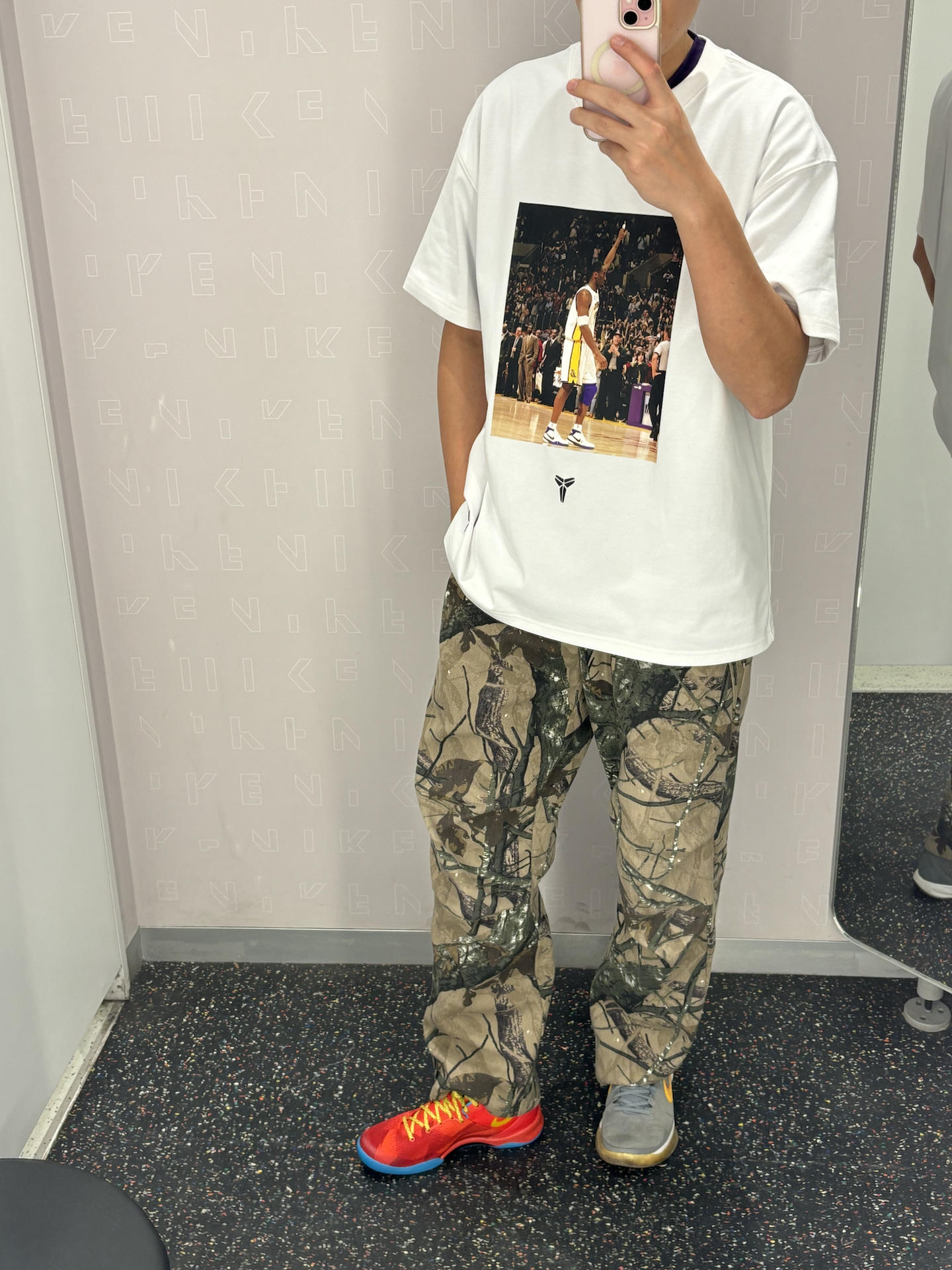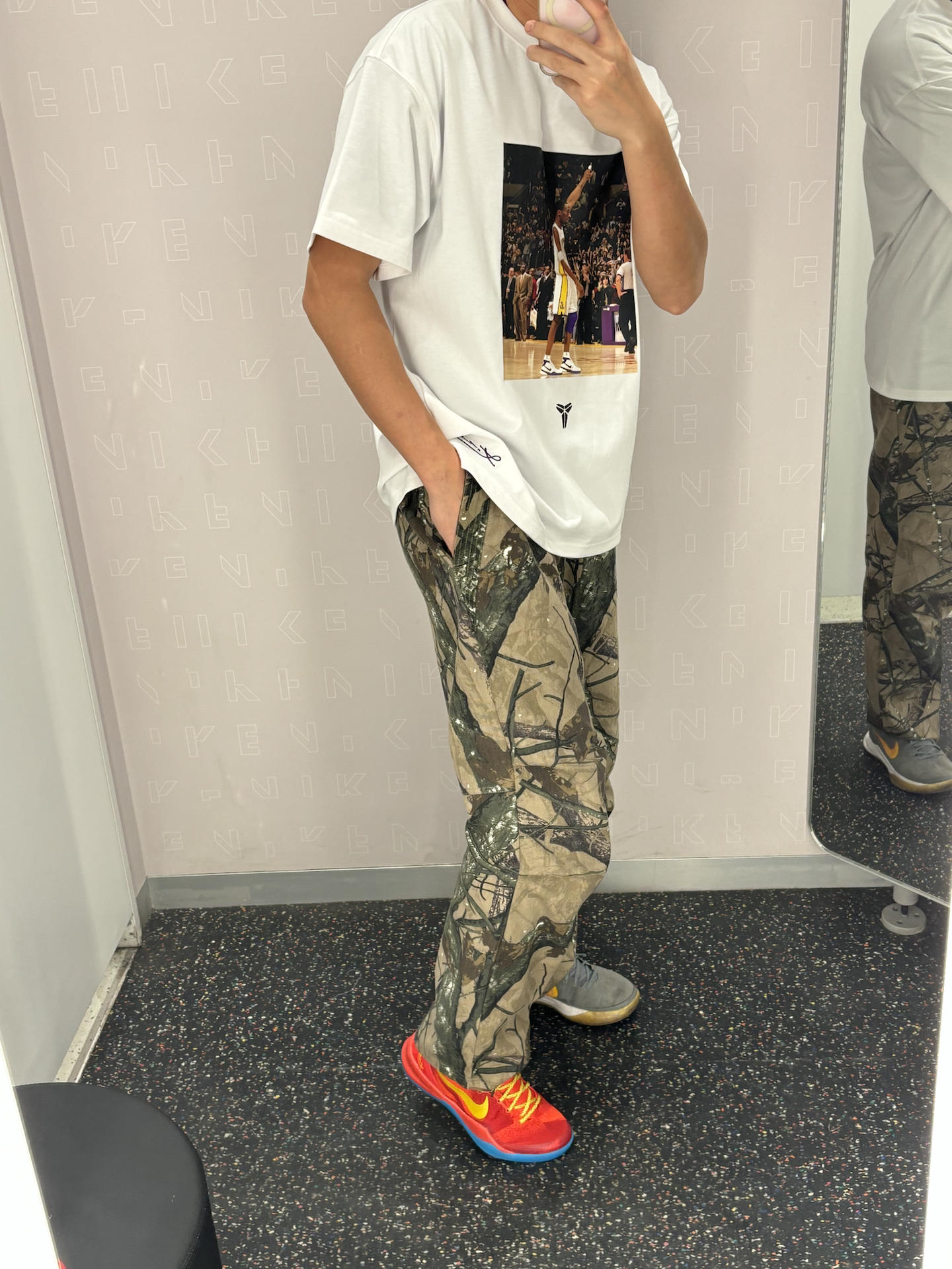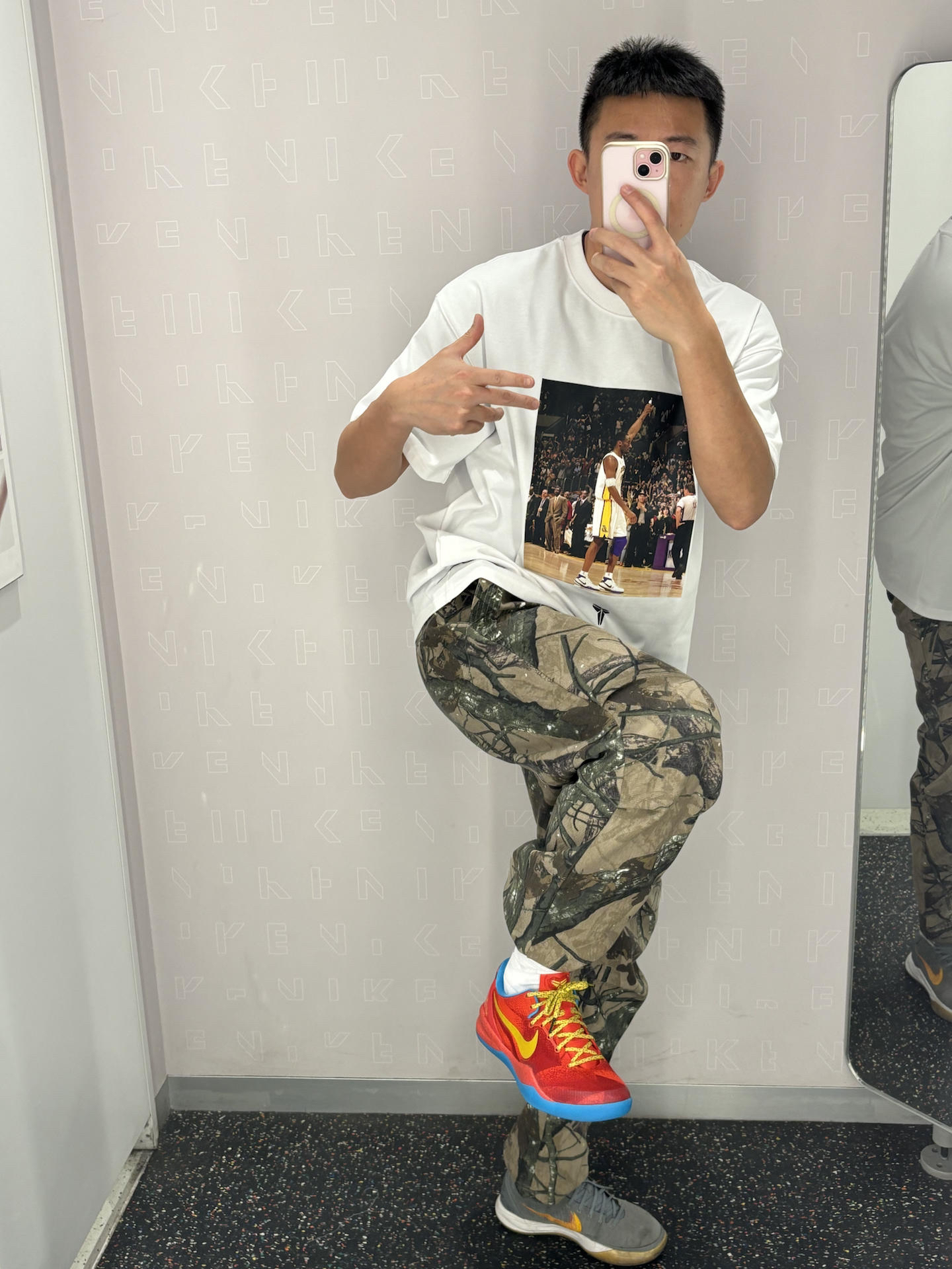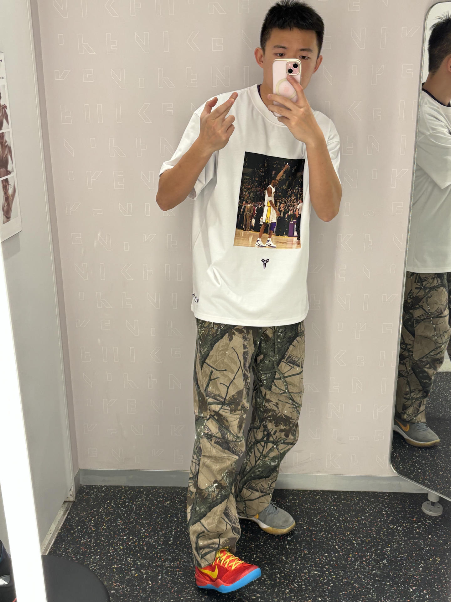 #人设穿搭法 这一套包容度很高的体育生运动风 科比的短袖也是很有质感 就连细节护肘也做成了摇粒绒材质 搭配户外运动风迷彩裤 普通人大众都可以驾驭 一双科比8马年大红色彰显能量感很有活力 👔科比81分之夜短袖 👖uzis迷彩 👟科比8马年