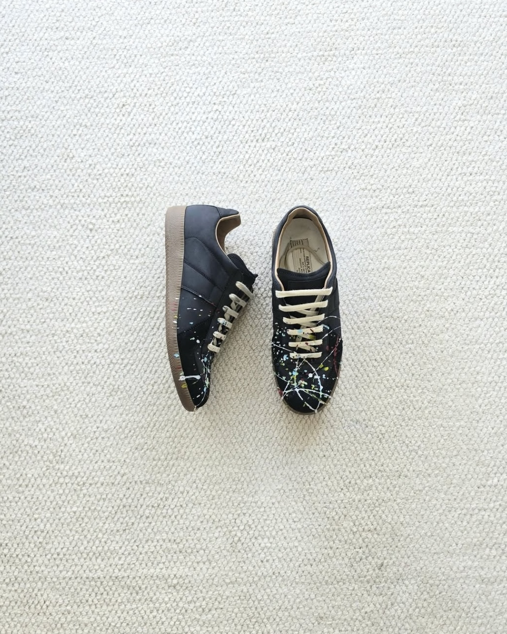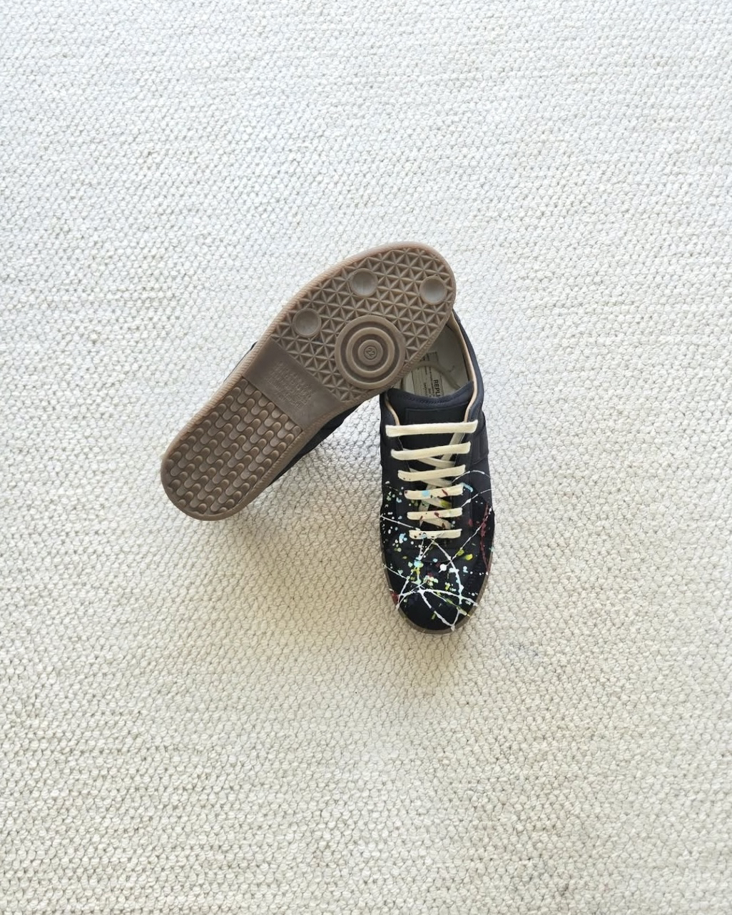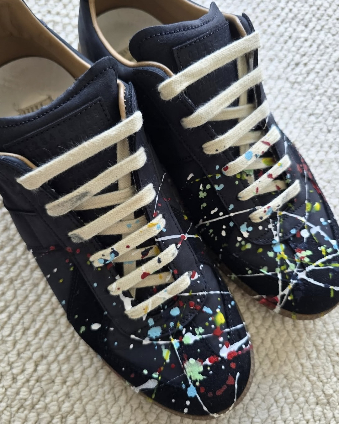 这双Maison Margiela泼墨德训鞋,真的把街头艺术感拉满了!🎨 经典的德训鞋型,配上彩色泼墨涂鸦,黑白底色上的斑斓颜料,像把艺术家的调色盘直接穿在了脚上。复古做旧的米白鞋带,和生胶大底呼应,既有复古运动感,又充满先锋艺术氛围。 不管是搭配牛仔裤、西装裤还是运动裤,都能瞬间提升造型辨识度,低调又吸睛。日常通勤或周末出街,都是回头率爆表的存在。 属于是“一眼种草,上脚就爱上”的宝藏鞋款...