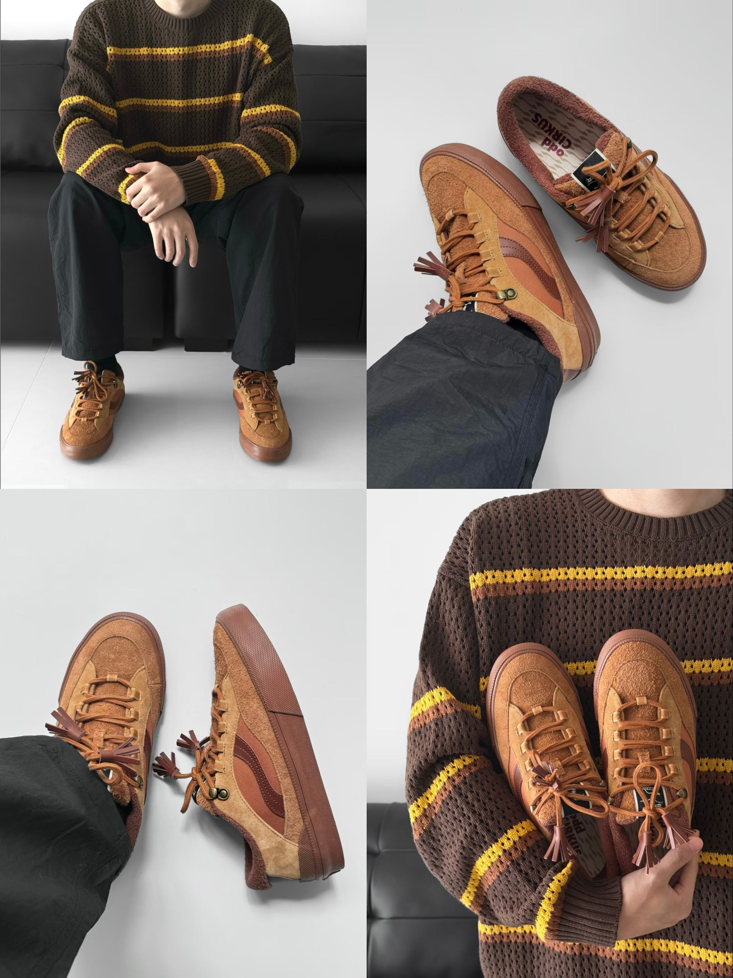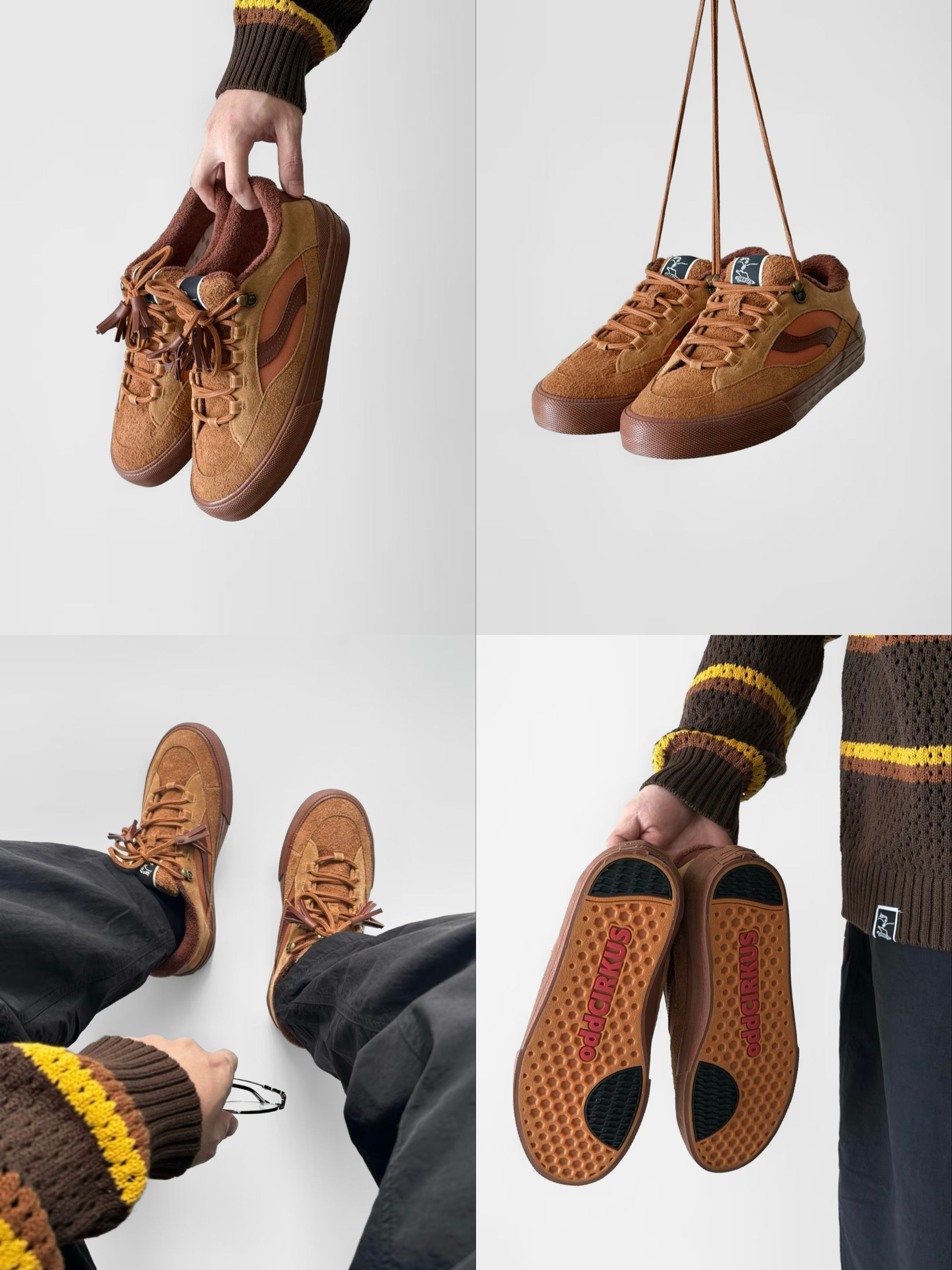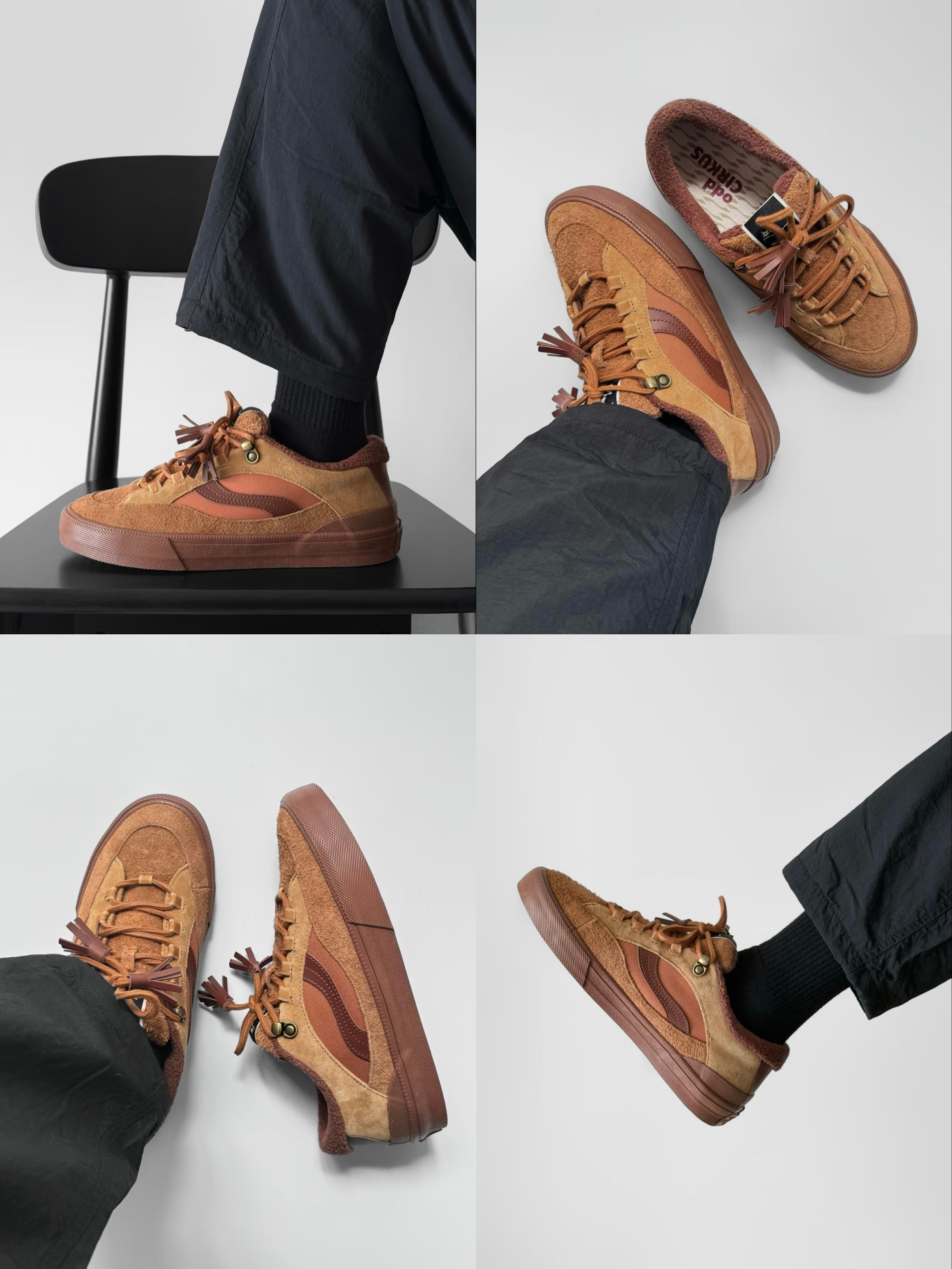 老实说,一开始是被它的颜值种草的。 鞋盒刚拆开,那种质感就扑面而来——复古调的大地色麂皮和皮革拼接,摸上去手感扎实,配上鞋带尾那几缕皮质流苏,走起来轻轻晃动的样子,真的是有点日系旧杂志里走出来的味道。鞋舌和鞋底的 “oddCIRKUS” 标,不算张扬,但懂的人一眼就能对上信号。 不过真让我决定天冷也穿它的,是上脚之后的体验。鞋型对脚背的包容度很好,我穿稍厚的袜子也没觉得挤,重点是足弓那一块的支...