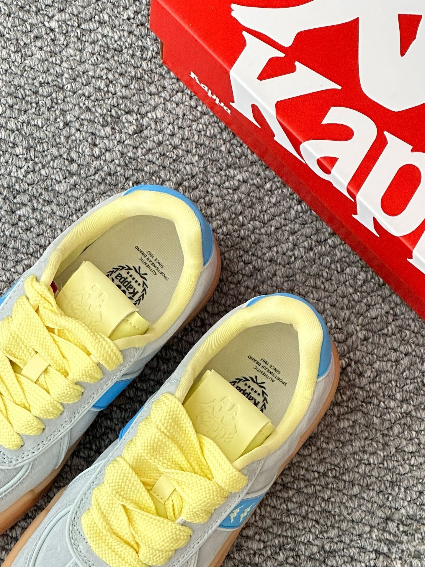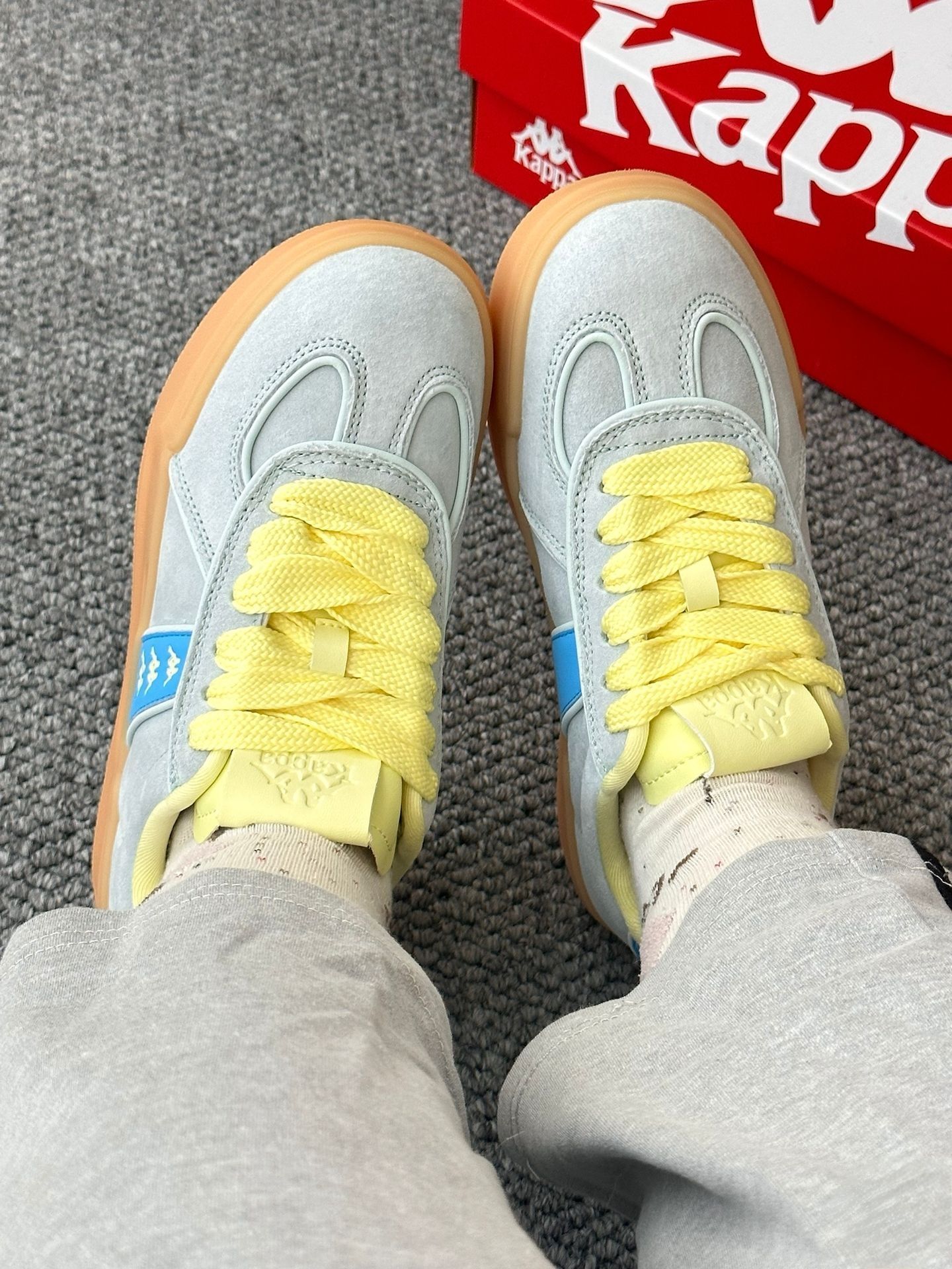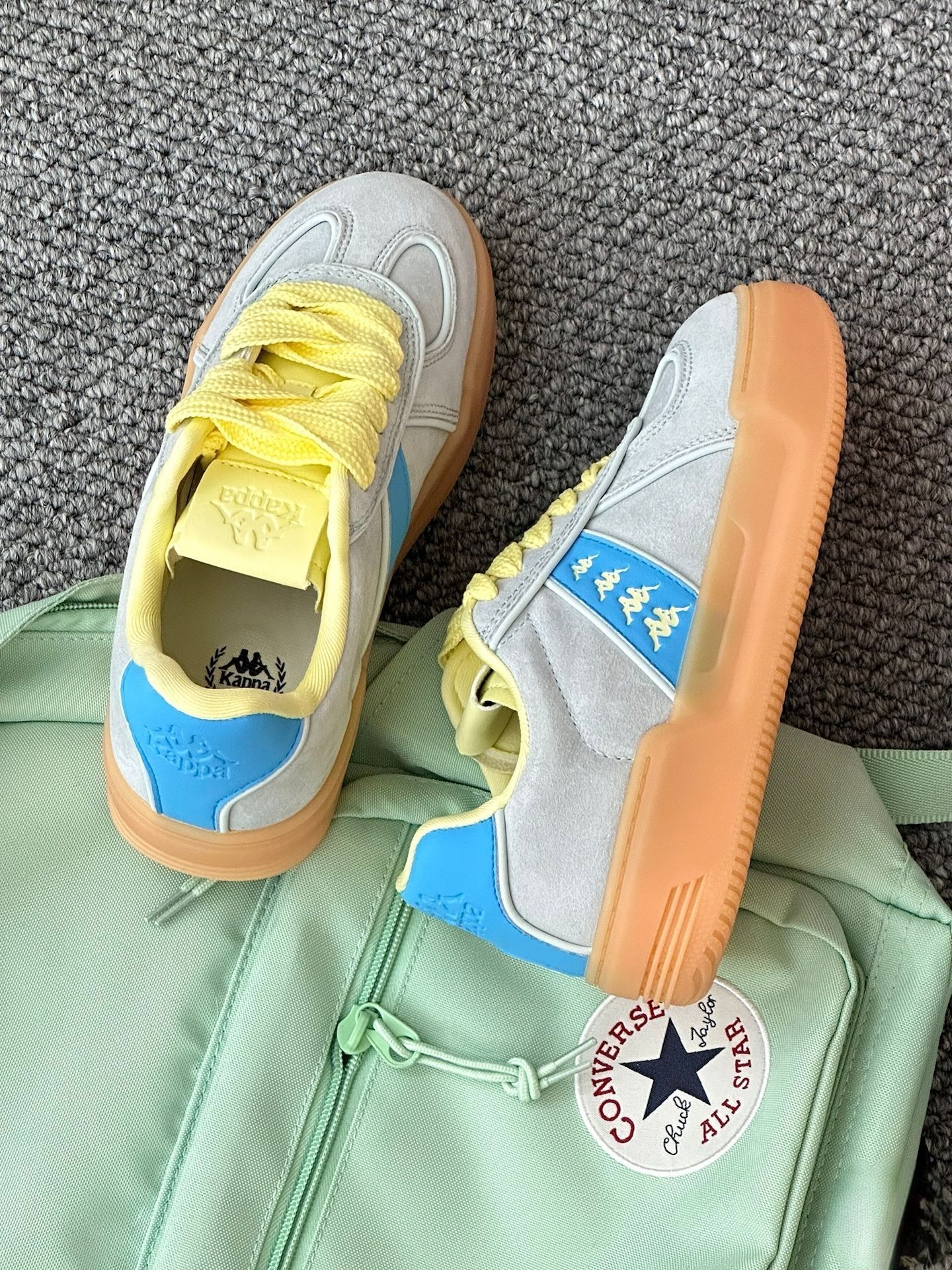 这双Kappa的灰蓝黄拼色鞋上脚第一感觉就是轻,走路没什么负担。 麂皮的鞋面摸起来软乎乎的,鞋型偏宽,对脚胖的人很友好,不用像穿窄版鞋那样挤脚。 配色是真的出彩,灰底+亮蓝+奶黄的撞色很有活力,配灰色运动裤就很有松弛感,搭浅色系牛仔裤也清爽,甚至配百褶裙都不违和,随便穿都不会出错。