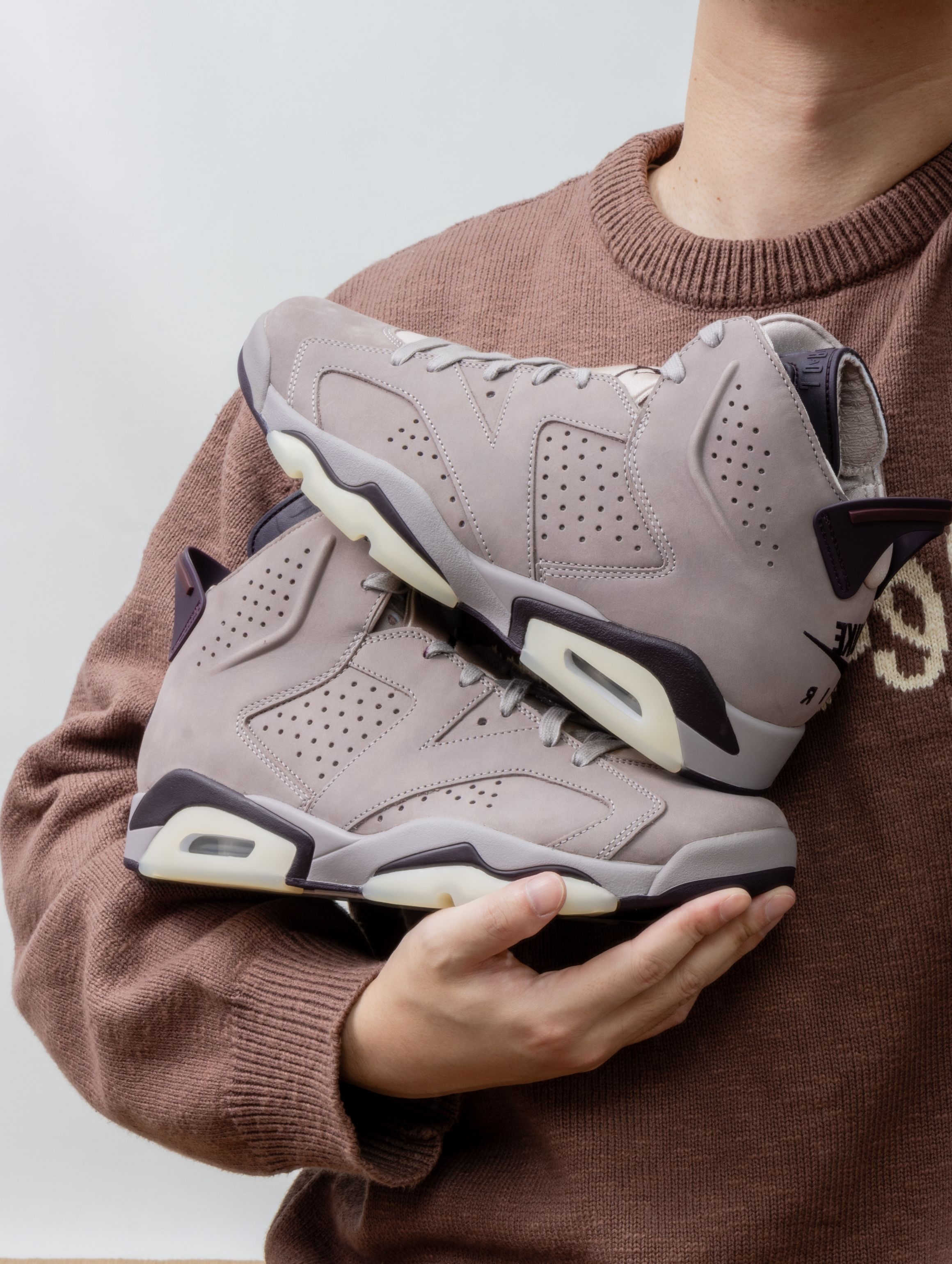 A Ma Maniére这次真的把联名玩透了!这双AJ6的烟熏紫麂皮好看,颜色像被暮色熏染过的绸缎,后跟做旧的金属扣和刺绣内衬直接把质感拉满。 上脚发现包裹性意外舒服,高帮设计护住脚踝却完全不板脚,气垫走起来软韧适中。 那种低调的奢华感刚好。鞋柜里终于有双能镇场又不张扬的鞋了——联名不该只是印花叠加,而是让经典学会用材质讲故事。