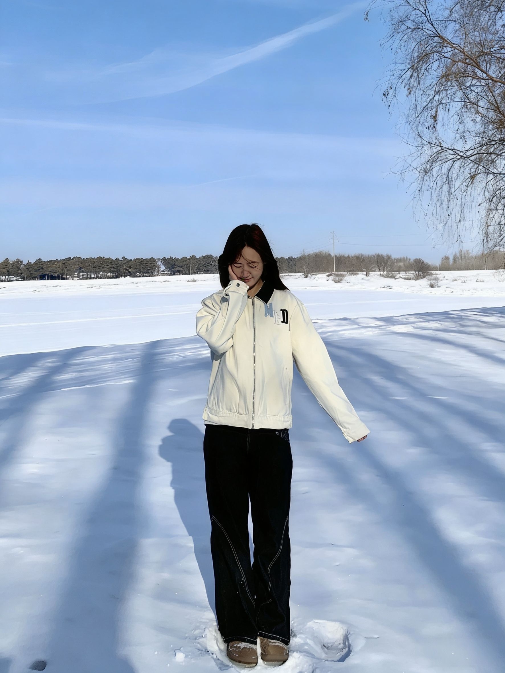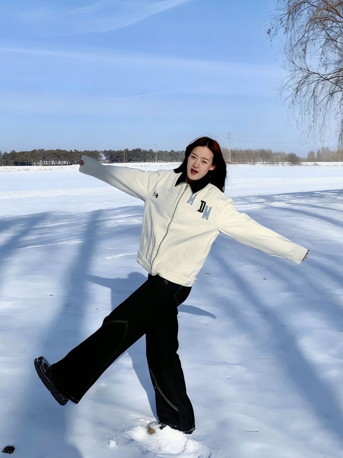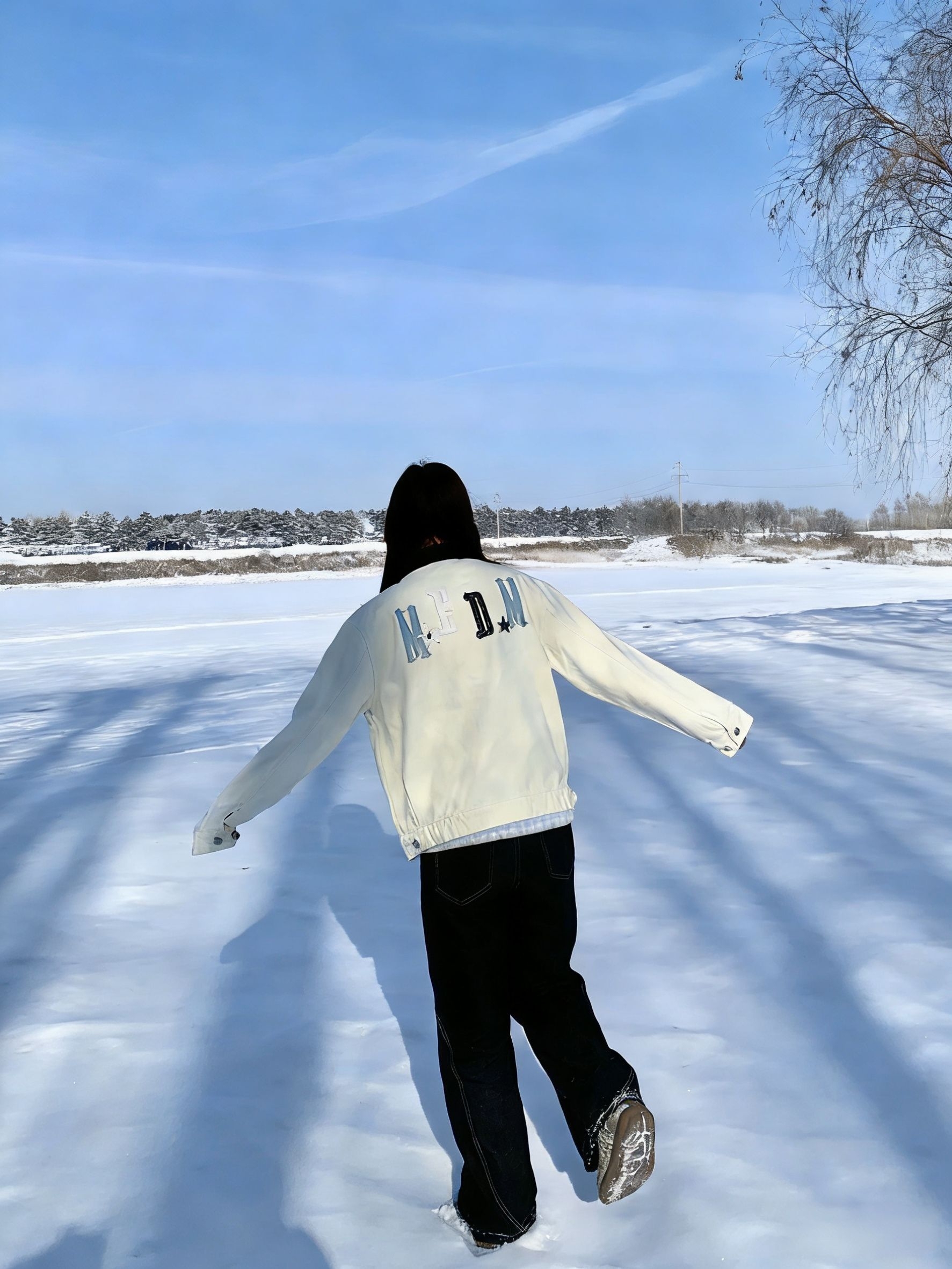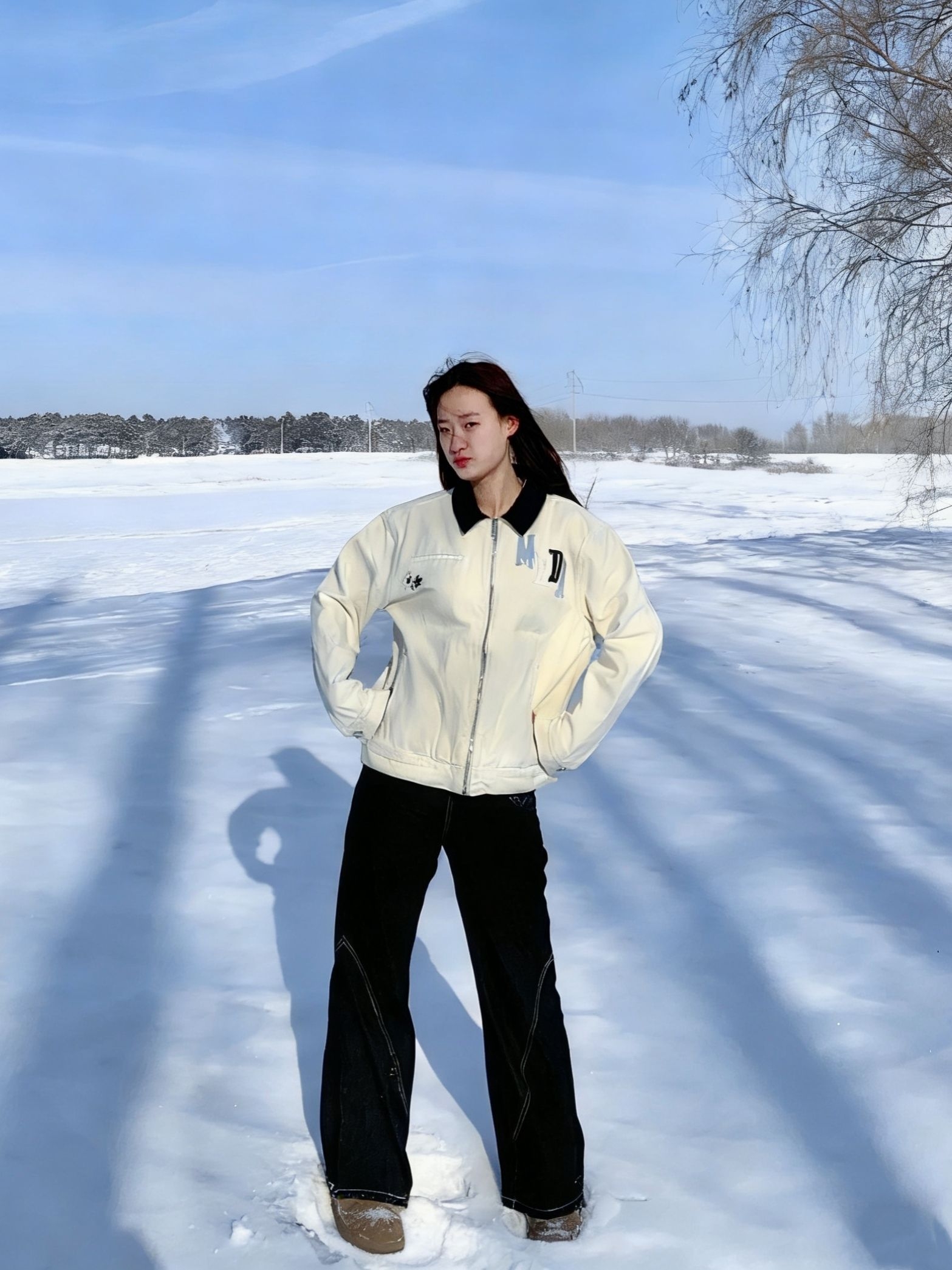 MEDM这件米白夹克太会了 软乎乎的质感 在雪地里巨显白。 背后的字母印花自带潮酷buff 宽松版型藏肉一绝, 随手一拍都是韩系电影感。