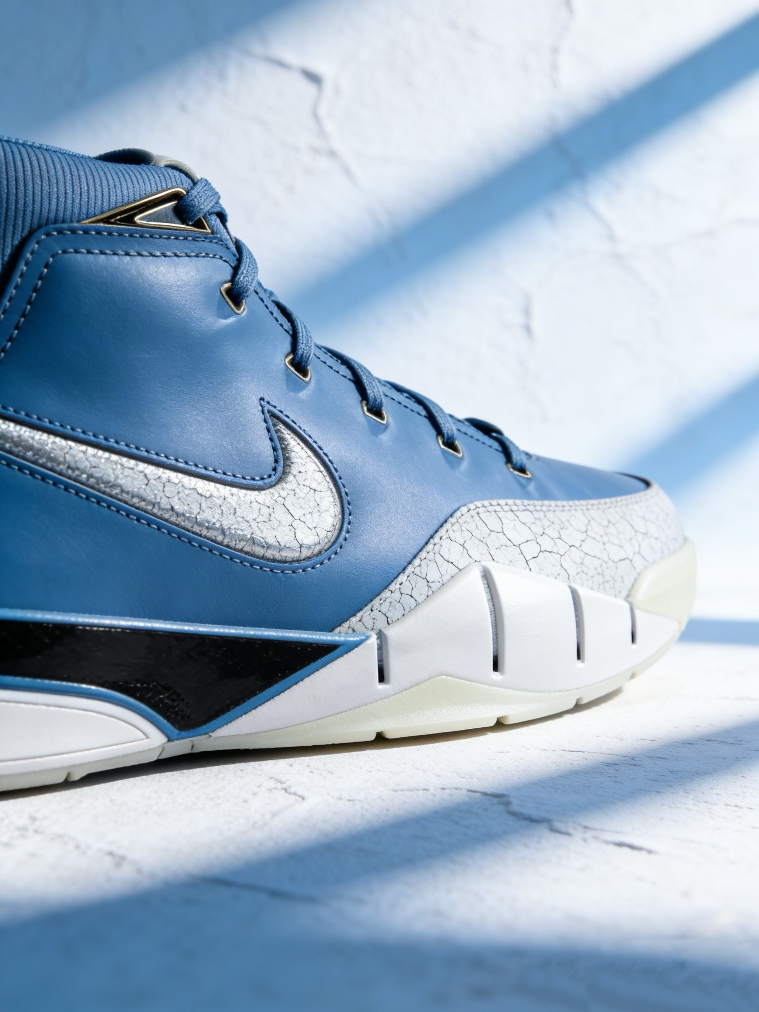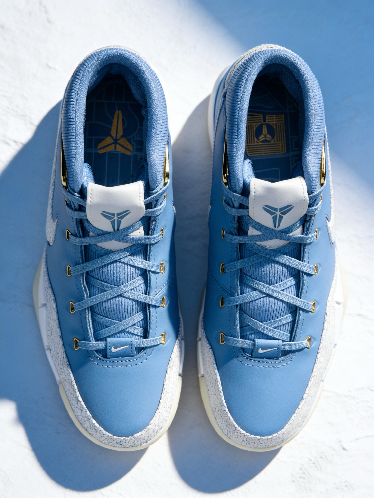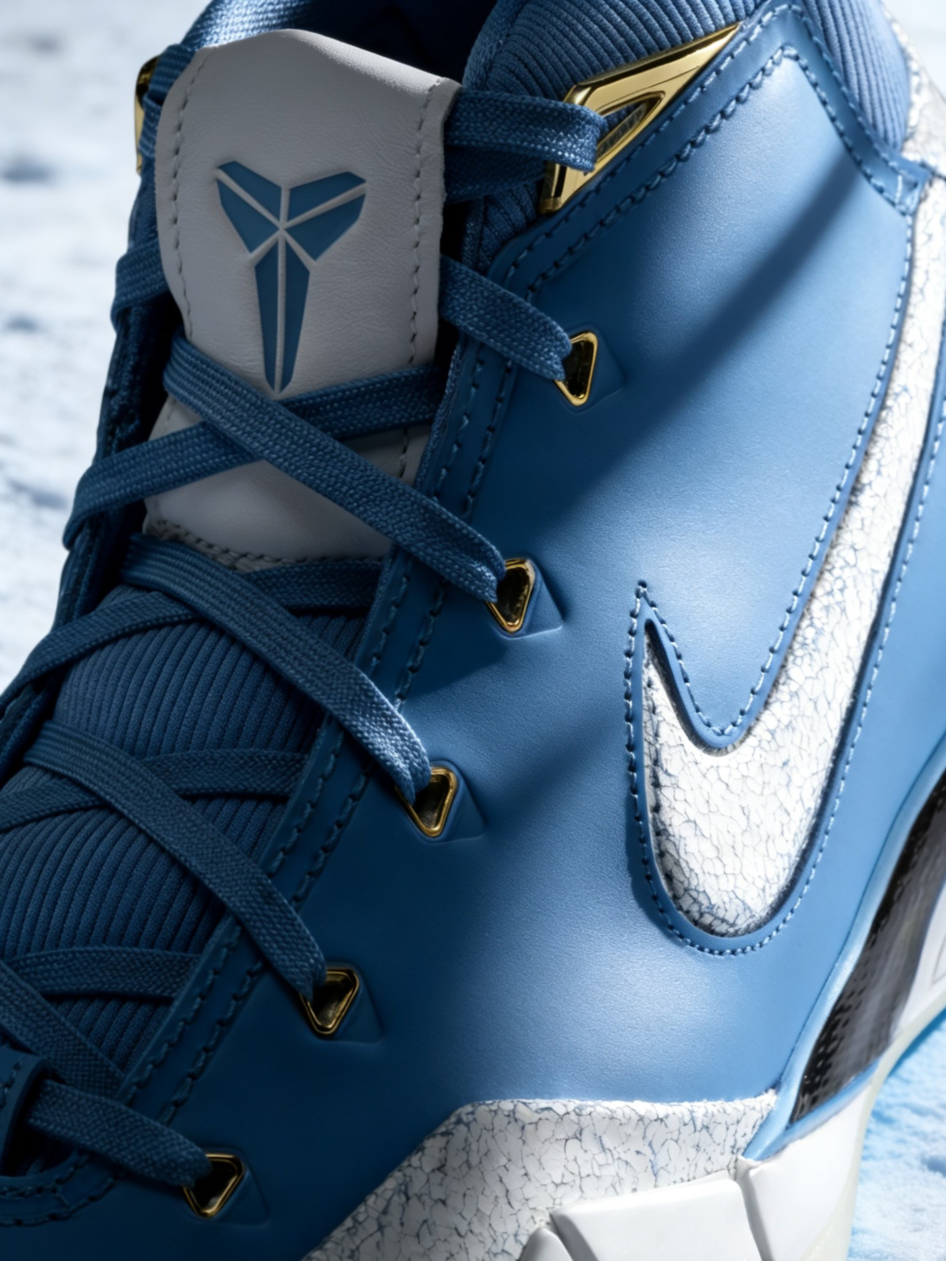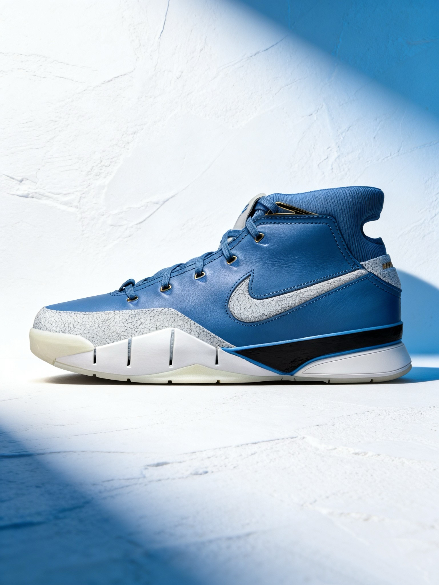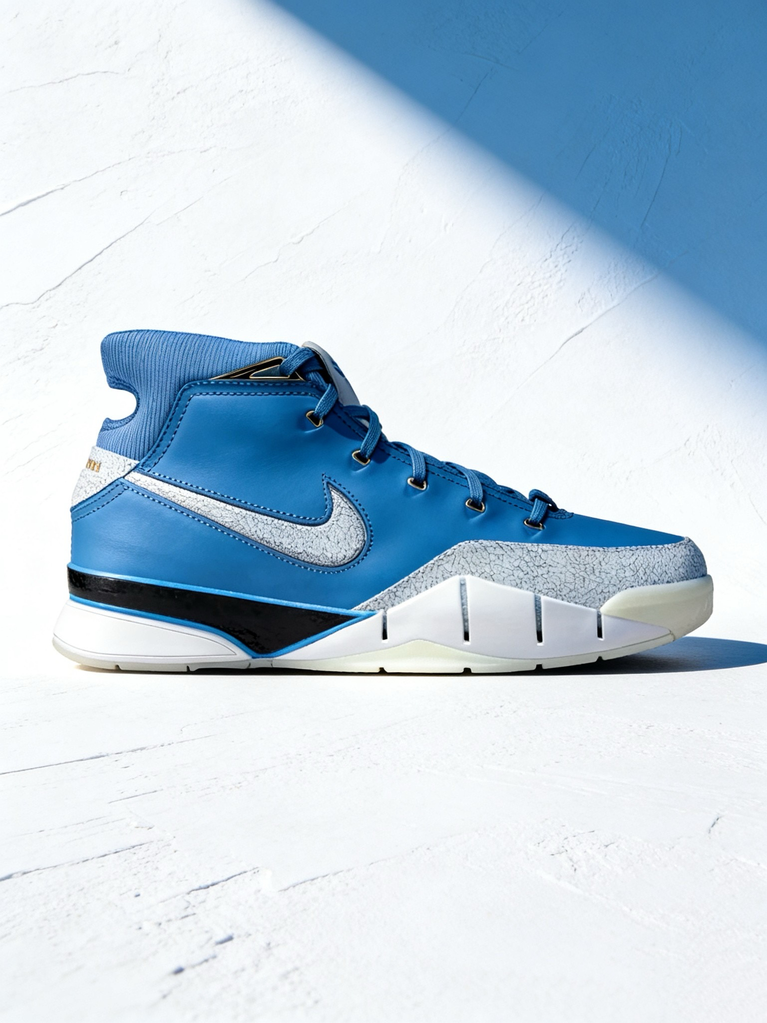 配色与设计:浅蓝色主色调搭配白色、金色细节,视觉清爽且有层次感,后跟金色点缀和鞋舌曼巴Logo是标志性元素,整体颜值在线,既适合实战也适合日常穿搭。 配置升级:作为Protro(Performance Retro)版本,相比原版Kobe 1在缓震、支撑等方面有优化,中底采用前掌Zoom Air气垫+后掌Cushlon泡棉,脚感更贴合现代实战需求,外底耐磨性和抓地力表现也较好。