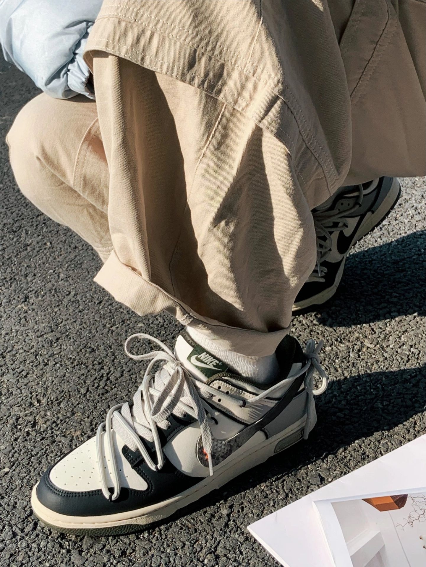 家人们!挖到一双把复古和质感焊死的Nike Dunk!巴洛克主题礼盒也太会了,黑白经典配色永不过时,加上解构做旧设计,像从复古画报里淘出来的宝藏,低调又有细节感~ 低帮版型对所有脚型都友好,不压脚面还显脚踝细!鞋面材质摸起来超有质感,做旧纹理不是廉价感,是那种自然的复古vibe,透气性也在线,夏天穿不闷脚。鞋底软软的有支撑,通勤走一整天不累,耐磨橡胶底日常穿超耐造,还不挑路况。