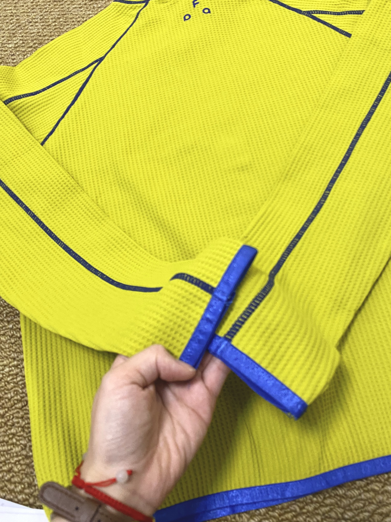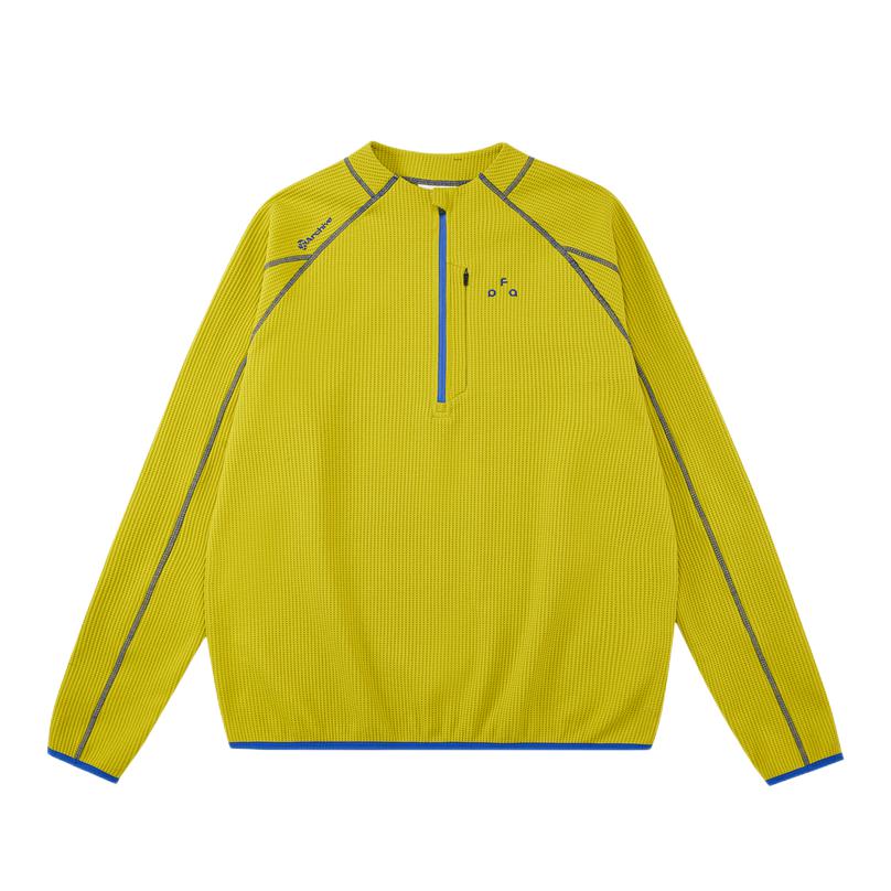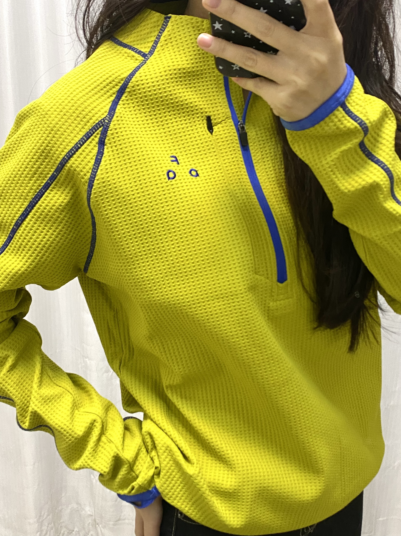 这件黄蓝撞色的半拉链长袖太戳我了!华夫格面料透气又防晒,半高领+明线设计潮酷感拉满。 宽松版型随便搭,配短裤或牛仔裤都很出片,运动、通勤一件搞定~