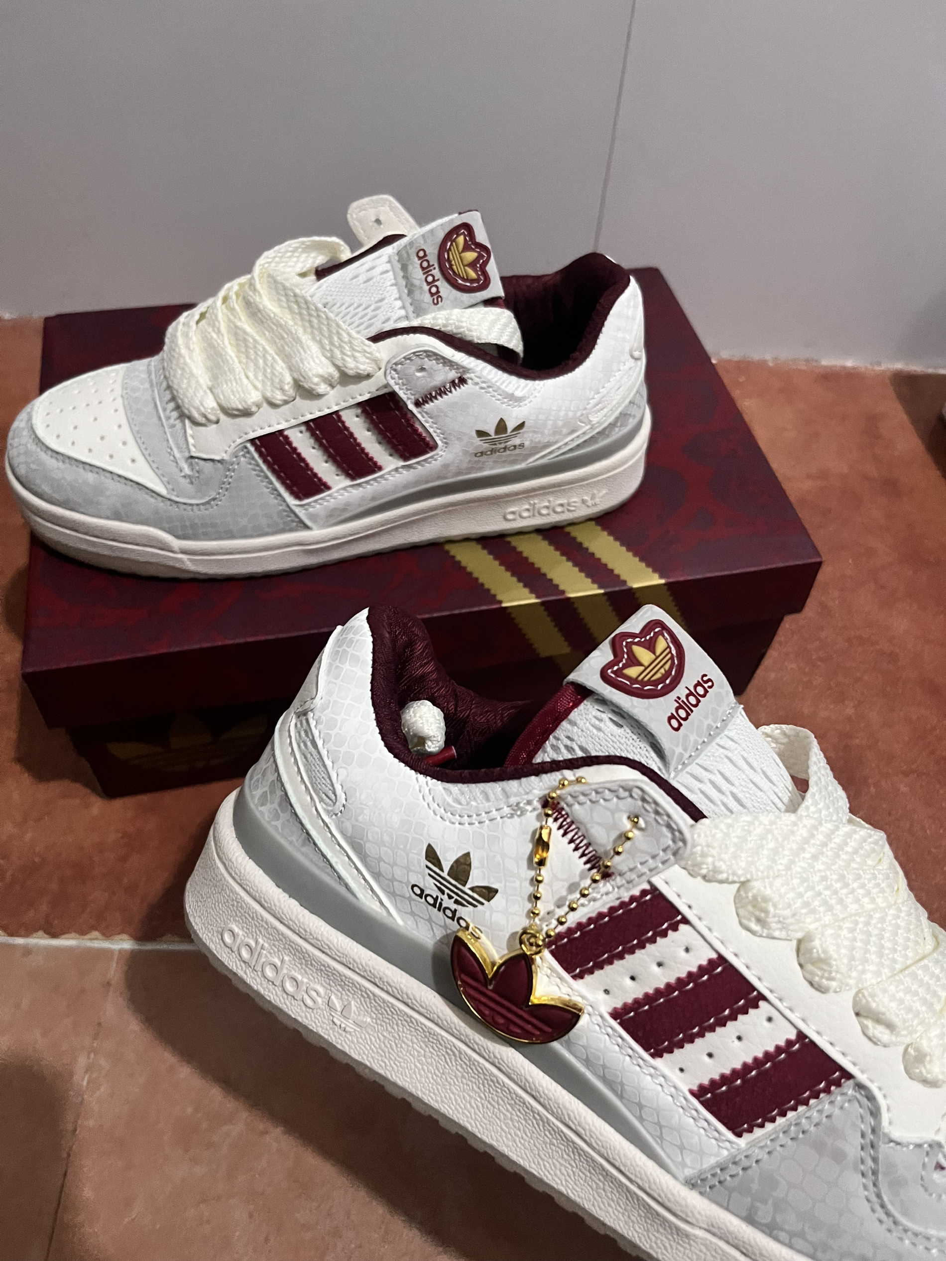 谁懂啊!新年第一双本命鞋直接被阿迪拿捏了😭 蛇年限定Forum 84白红配色太会了,奶白基底撞酒红条纹,高级感拉满又透着新年的喜庆劲儿~ 鞋身的蛇纹压印细节感绝了,低调又显贵,鞋舌的爱心三叶草标更是戳中少女心💘 复古板鞋版型超百搭,配牛仔裤显腿细,搭新年红裙也毫不违和,日常出街or拜年穿都吸睛。 脚感软乎乎的不磨脚,暴走一天也没压力。作为新年战鞋,既有蛇年的专属仪式感,又兼顾颜值与实用性,本命年姐...