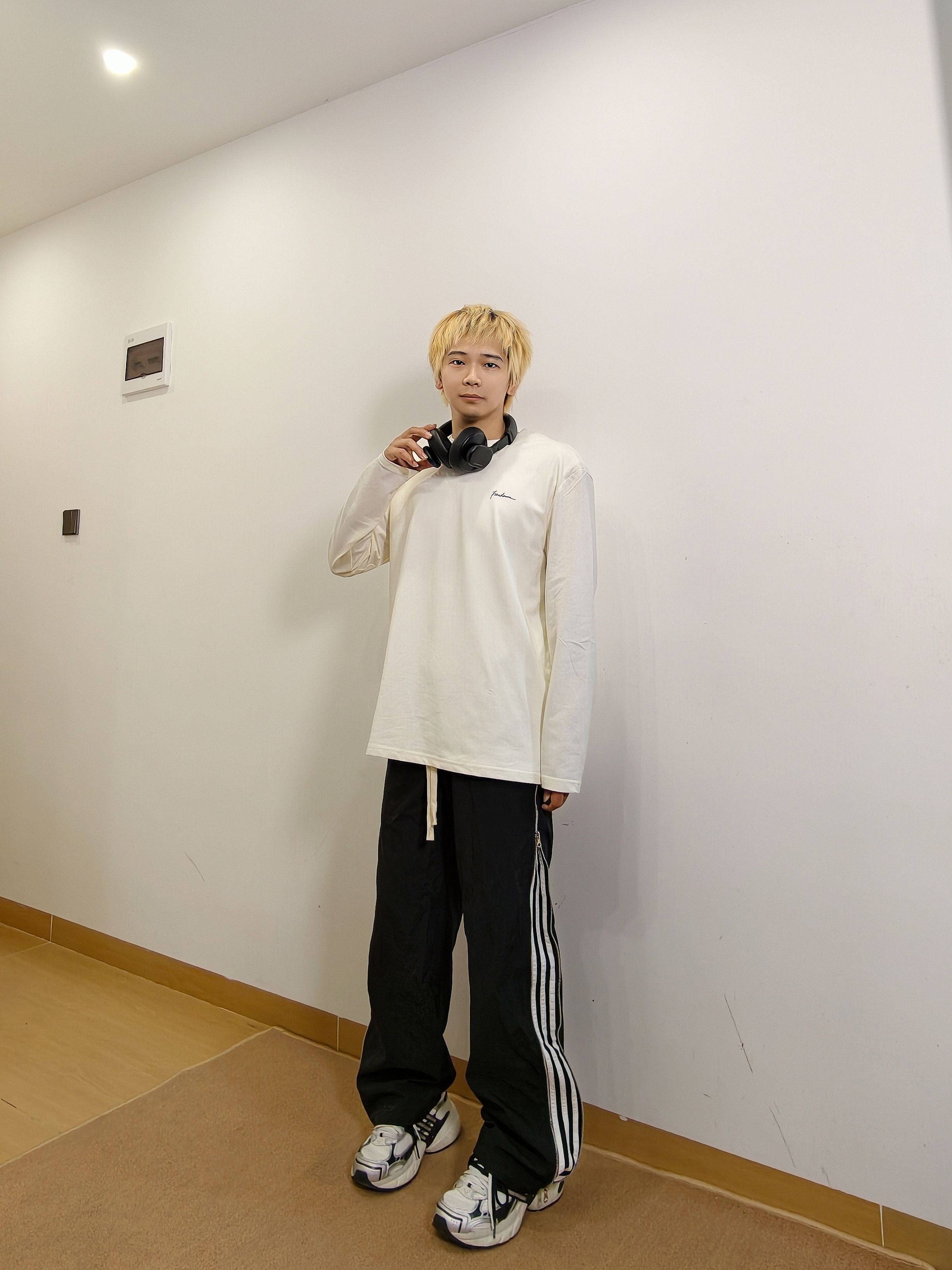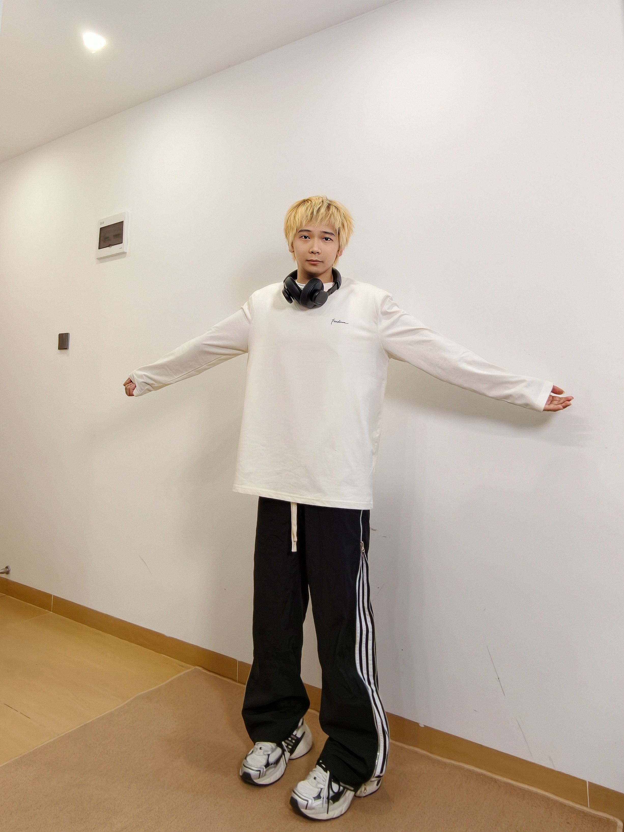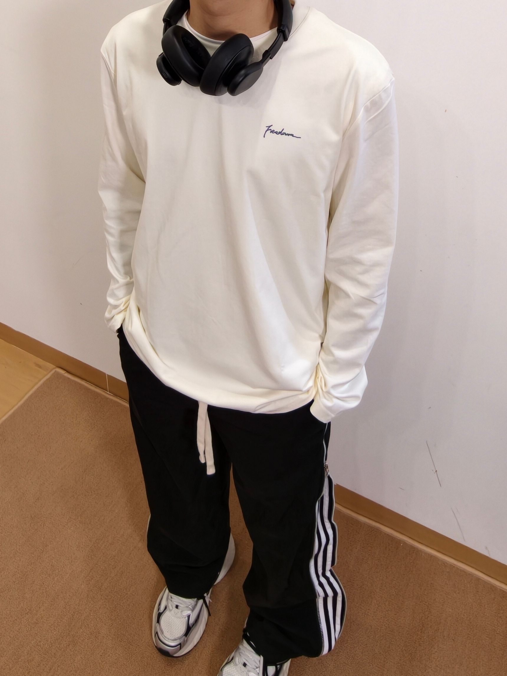 干净舒服的长袖t就穿着很舒服 简单的样式配上休闲条纹裤 再加双老爹鞋就很帅啦