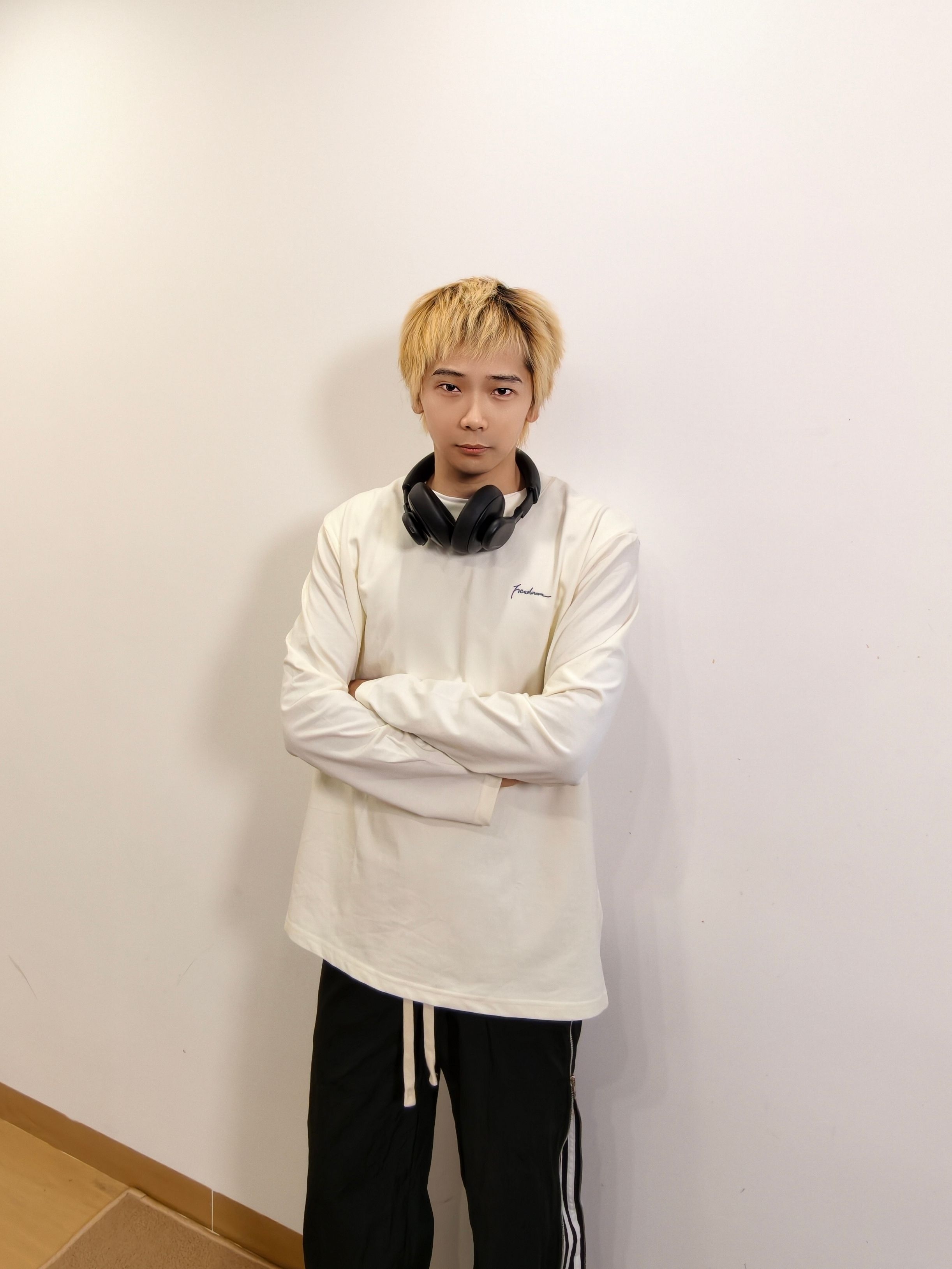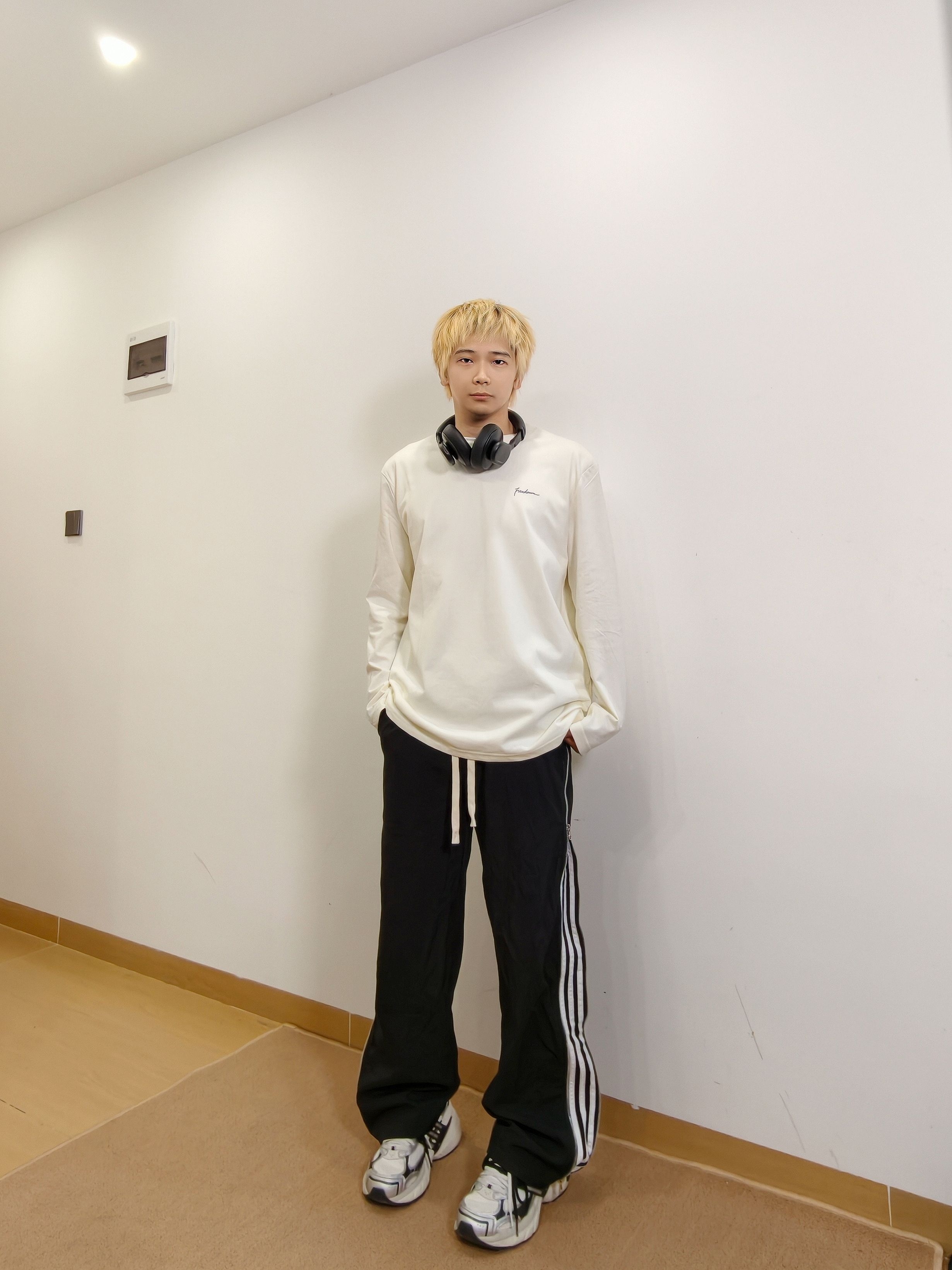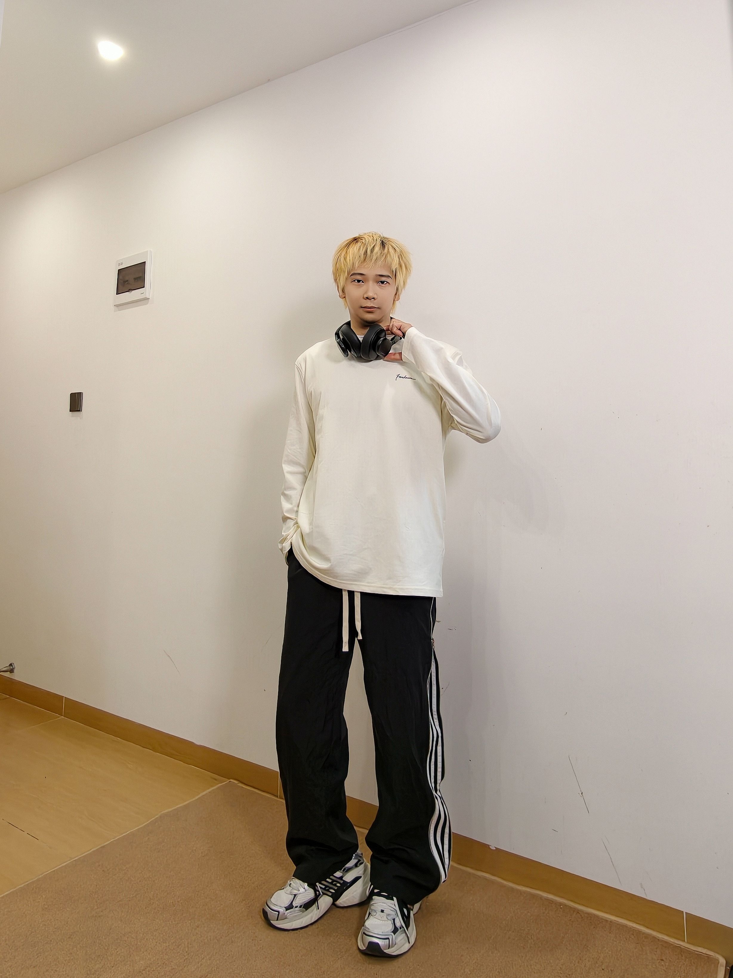 干净舒服的长袖t就穿着很舒服 简单的样式配上休闲条纹裤 再加双老爹鞋就很帅啦