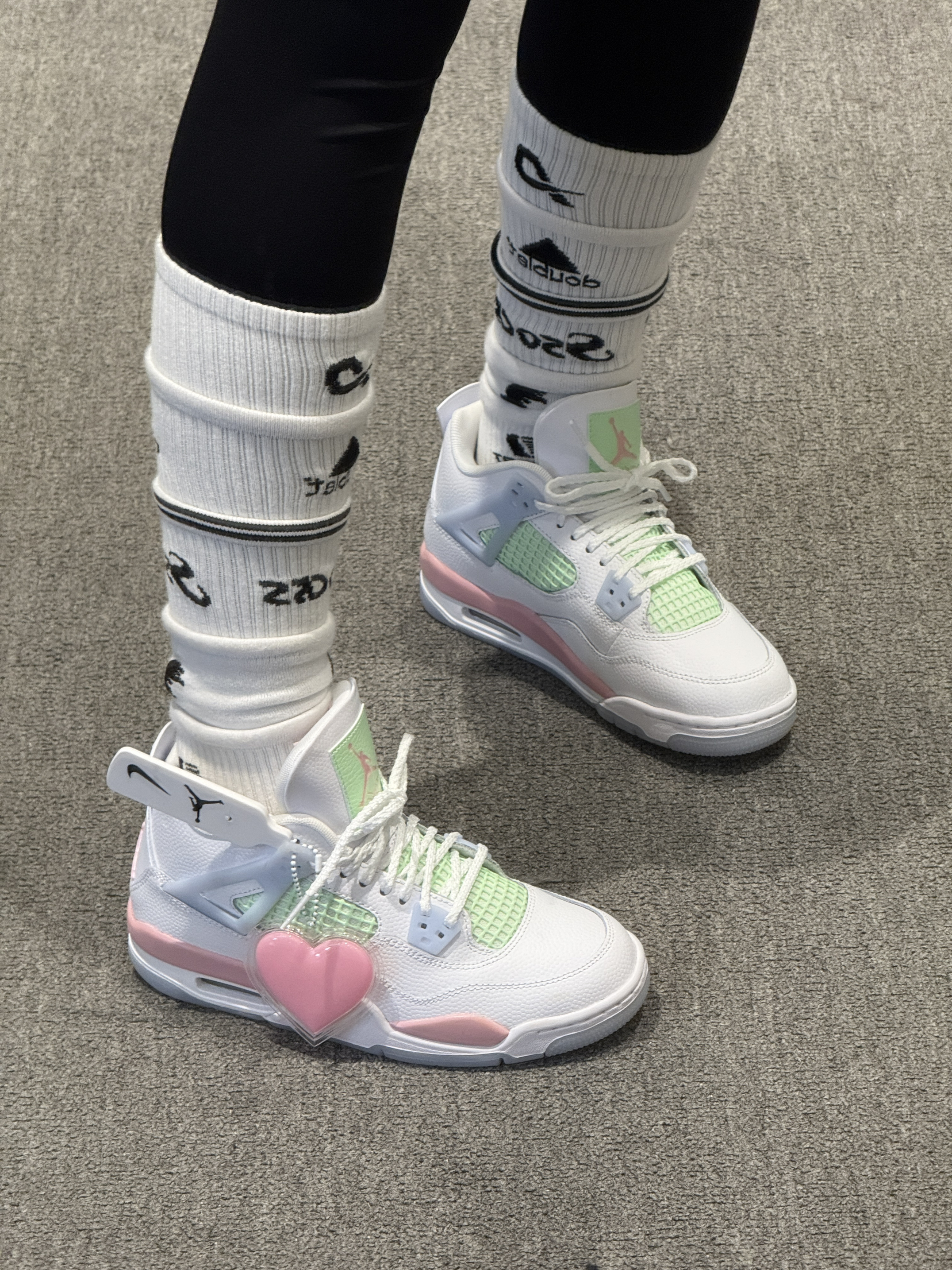 #新鞋零时差 这两双aj4情人节主题限定你会怎么选? 最大尺码到44.5男生也可以穿 学生党搭配校裤淡色的还是建议白红配色 青少年可以选择白绿色那双
