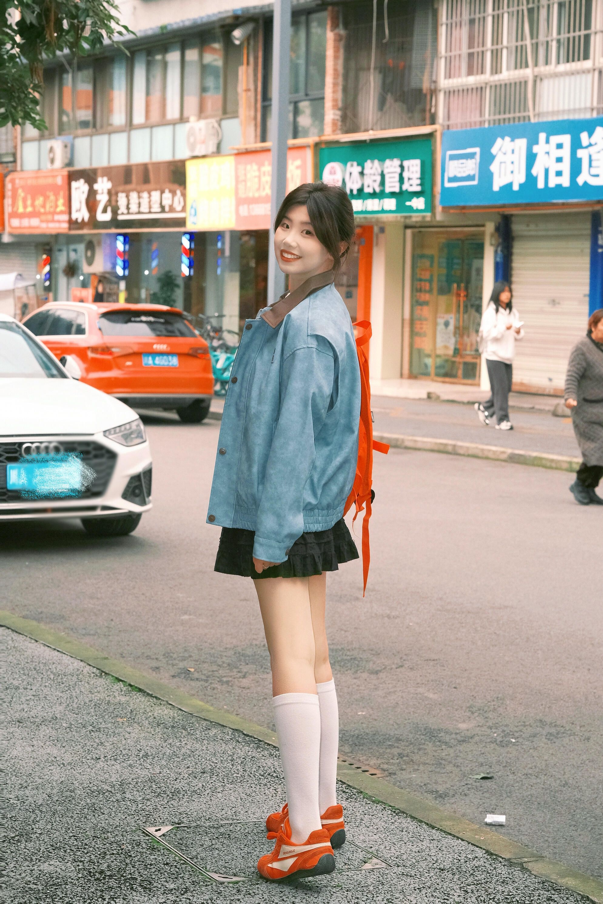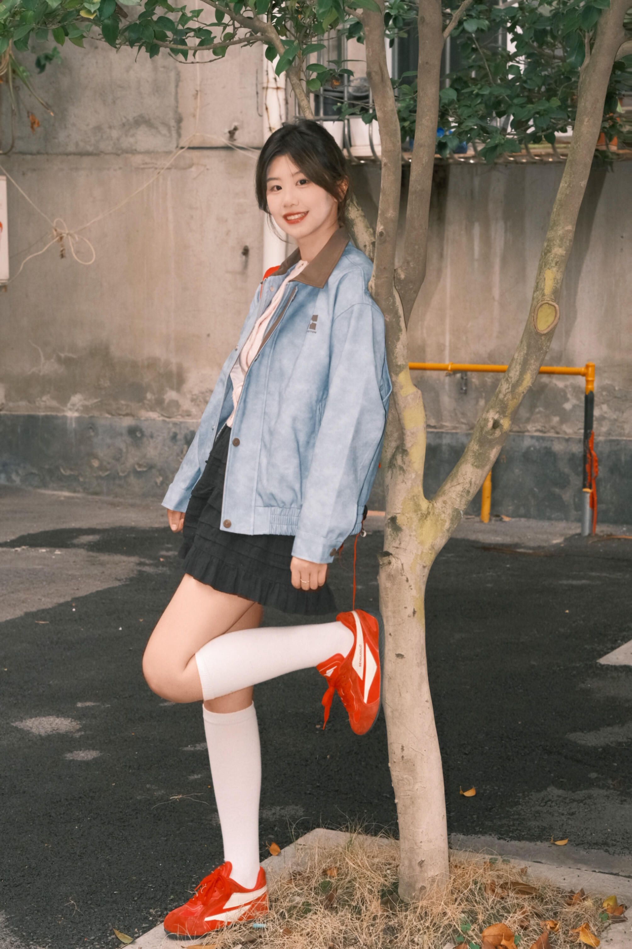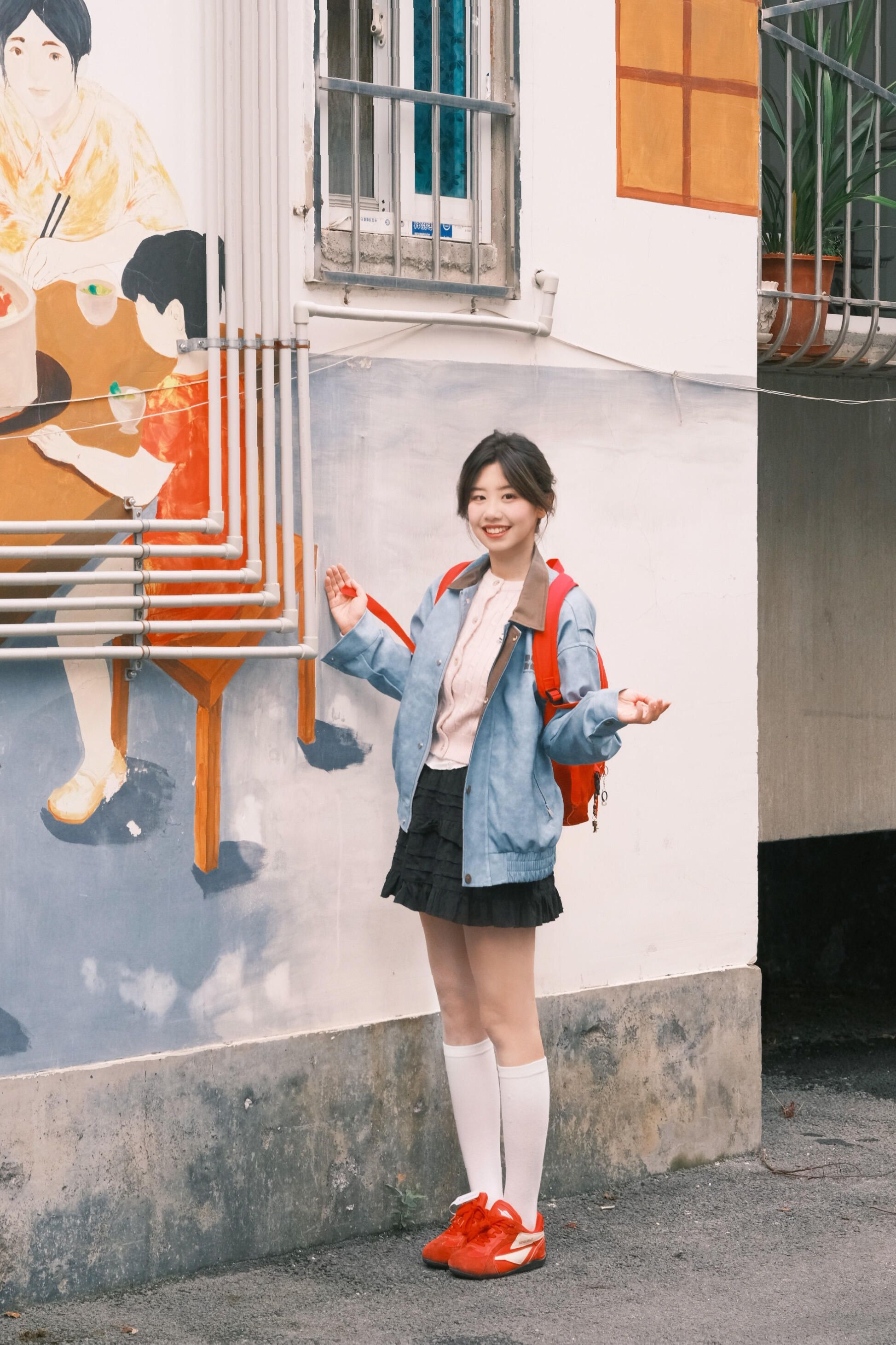 在老小区里也能拍到有活力的照片呀 红蓝撞色的衣服真的看起来很有少年感!