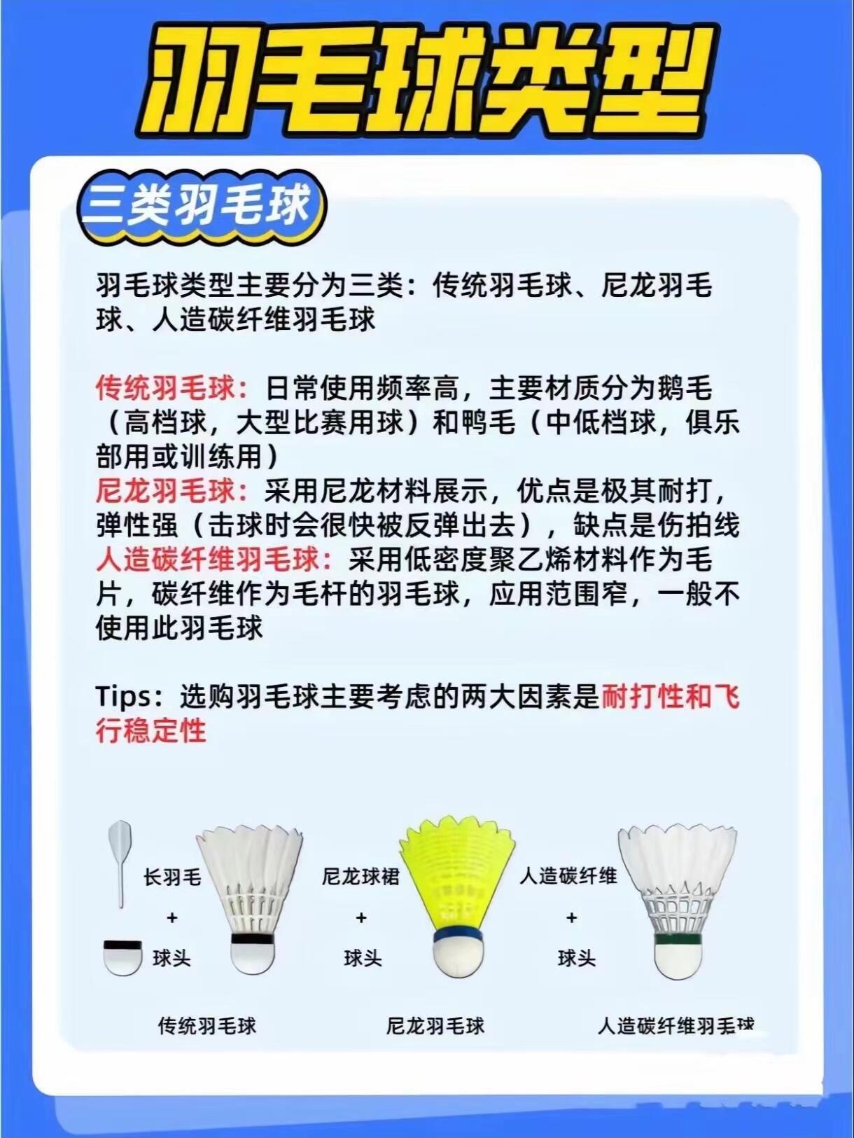 年初染上了羽毛球毒瘾,从此一发不可收拾!球、拍、线、鞋,看的我是眼花缭乱,收藏了好多别人的帖子,有的信息不全,有的信息错乱,无奈自己整理一份,谁让自己有轻微完美主义呢,舒服了,请各位看官赏阅! 羽毛球根据羽毛的材质,常见的有尼龙球、碳音球、天然羽毛球(鸭毛球、鹅毛球)。 尼龙球:优点是极其耐打,缺点是振动大,伤拍和线,适合业余娱乐、新手、打毛党。 碳音球:优点是飞行和耐打都不错,击球爆...