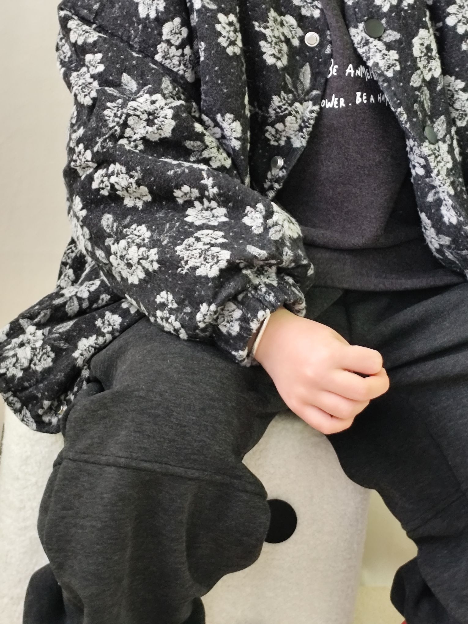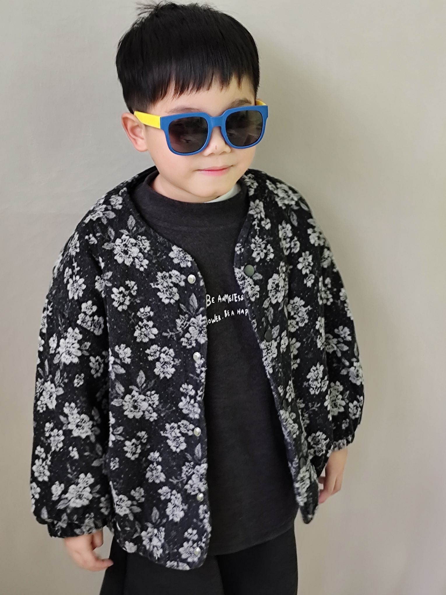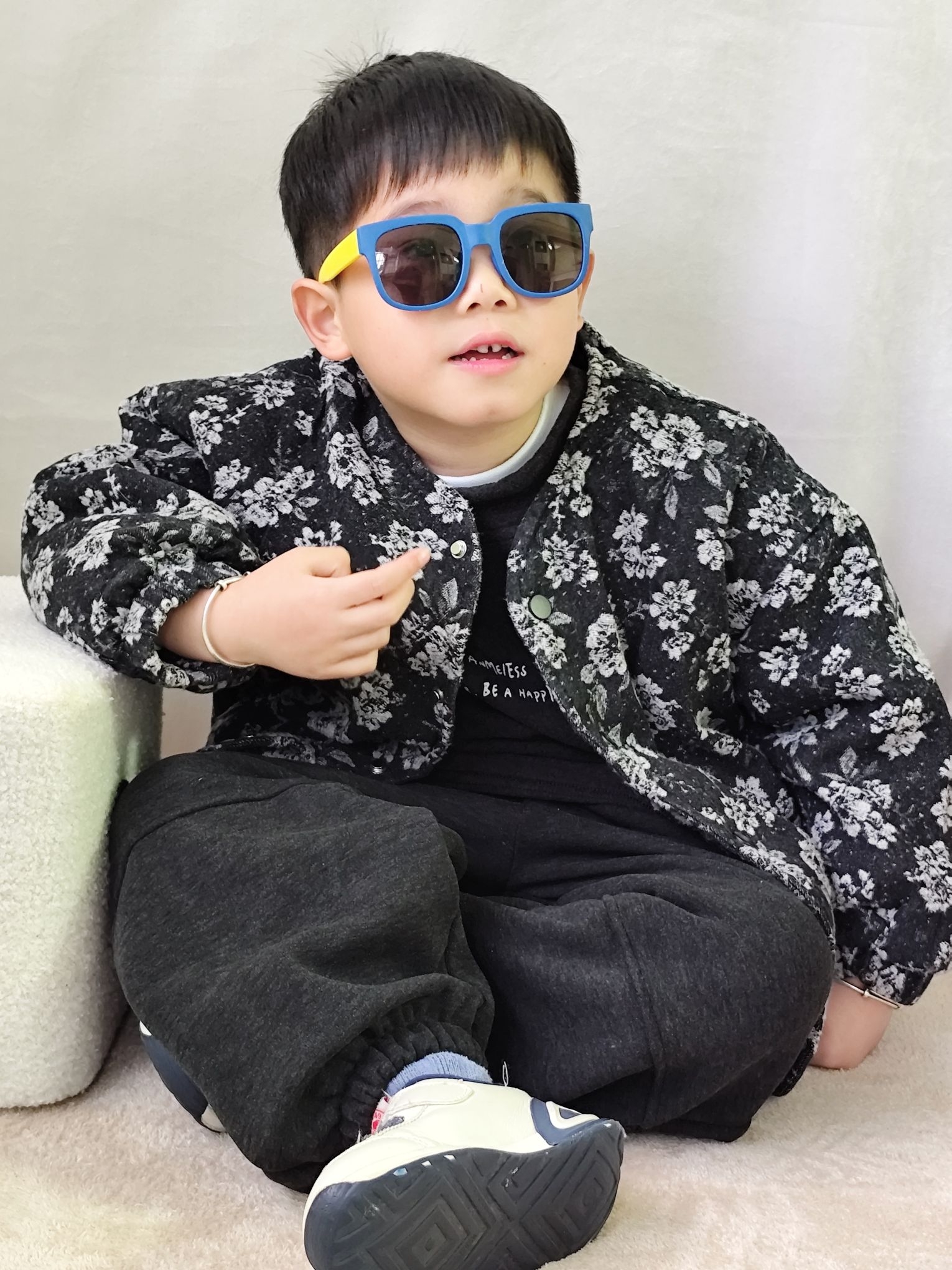 这是我家崽崽最近天天点名要穿的一套冬装! 内搭是深灰色磨毛小高领打底,宸宝说贴身穿软乎乎的,在幼儿园玩一天都不觉得勒。外面这件黑底白花的夹棉外套是他的最爱,宽松的版型抬手跑跳都没束缚,他自己说“像裹在小云朵里,暖乎乎的还不重”。 下装是同色系加绒卫裤,裤腿宽松不卡膝盖,蹲坐玩玩具都自在。脚上的#大黄蜂/BIG WASP 运动鞋轻便防滑,他穿着在操场跑圈都没喊累。#PARZIN/帕森 墨镜一戴直接变...