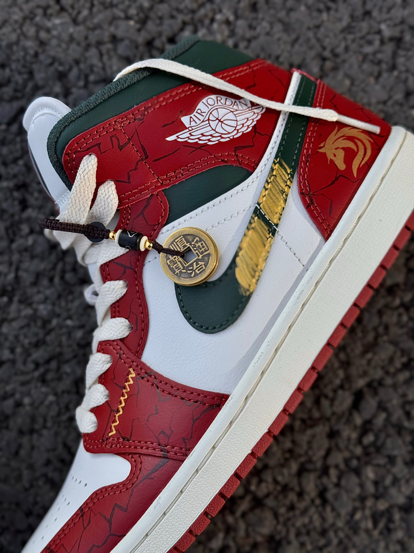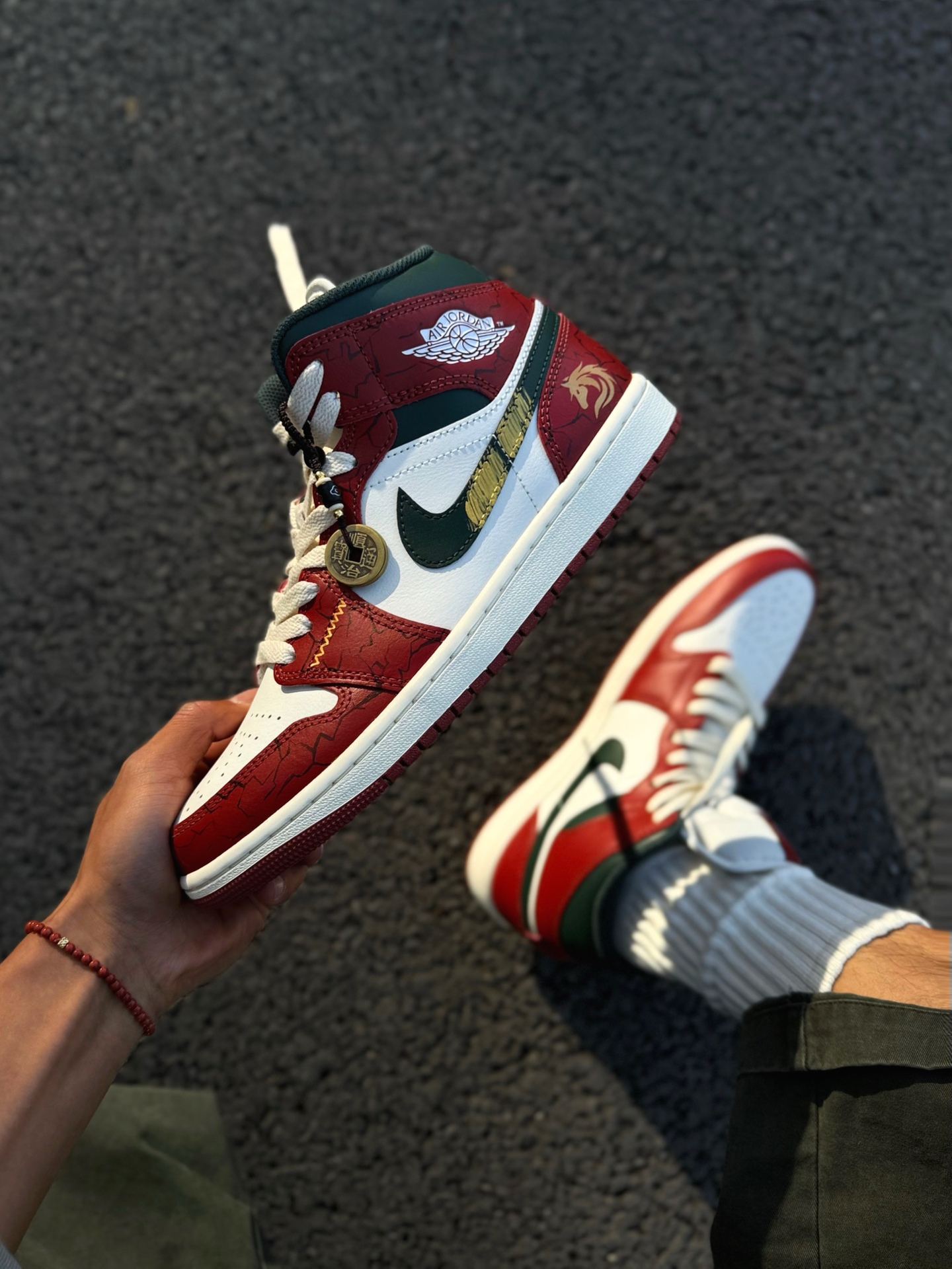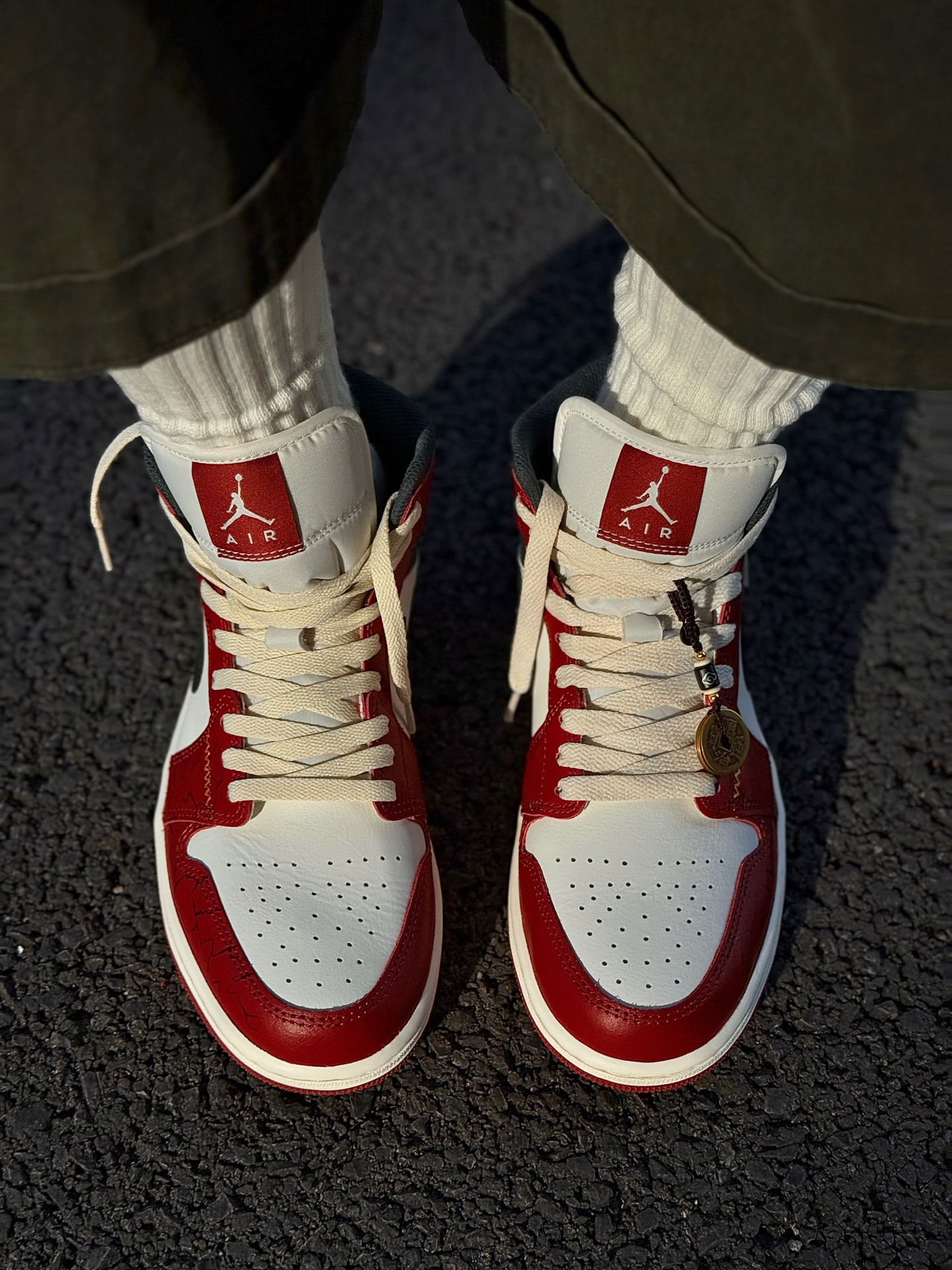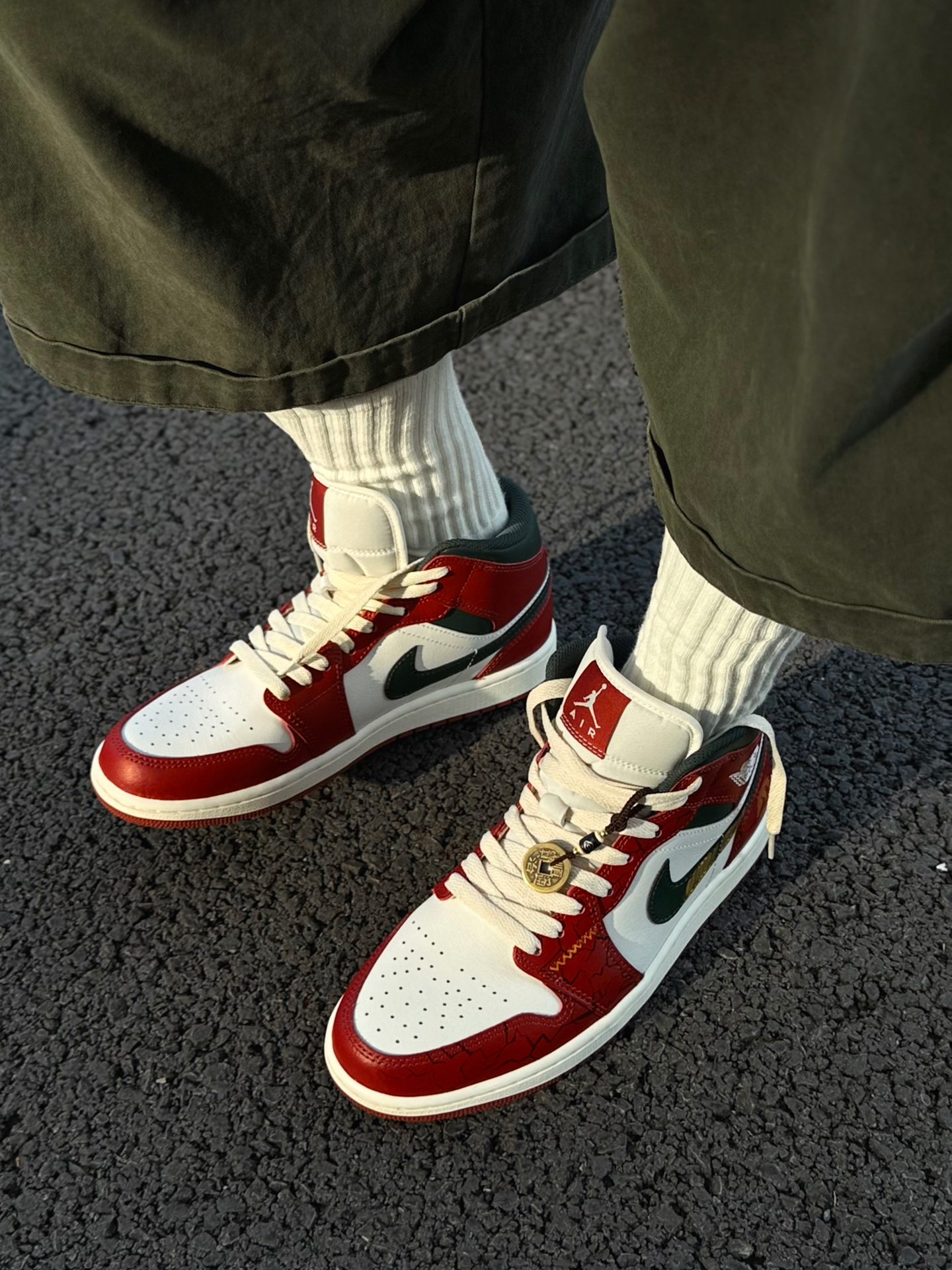 红色AJ1有很多,这双红调我还是很喜欢的了 鞋带和鞋底是做旧米黄色,复古做旧的感觉很明显 我喜欢日常搭蓝色牛仔裤、绿色工装裤 撞色的搭配很有美式复古风 喜欢的可以试试这样穿搭~ 我把送的铜钱吊坠挂鞋带上了 走路一晃一晃的还挺有意思 鞋头爆裂纹、后跟祥云龙马手绘都是细节 过年穿刚好讨个彩头 我脚偏宽,平时穿42码 这双mid中帮选42.5码上脚不挤 活动起来很舒服 如果平时穿AJ觉得脚感硬的兄弟...