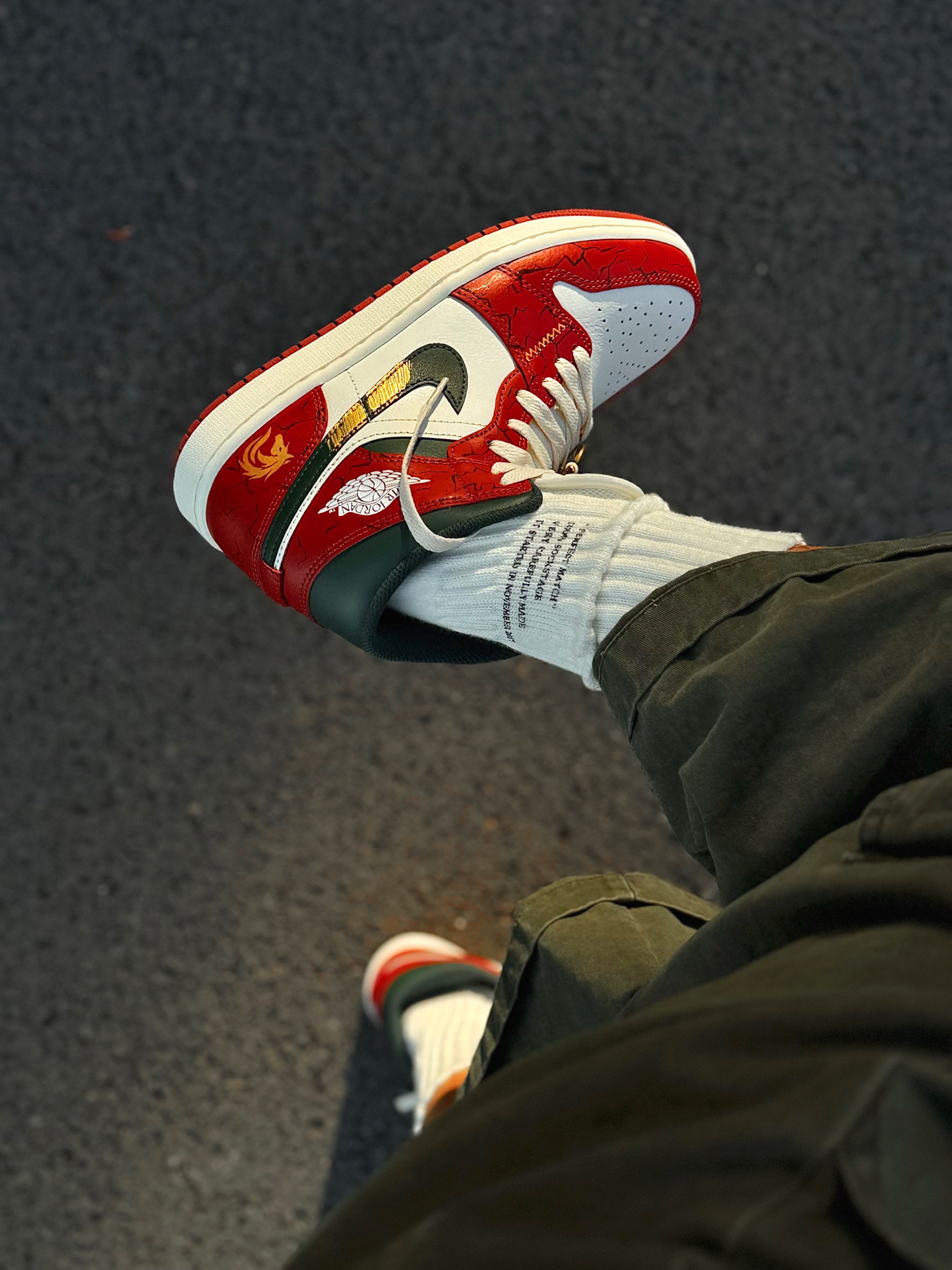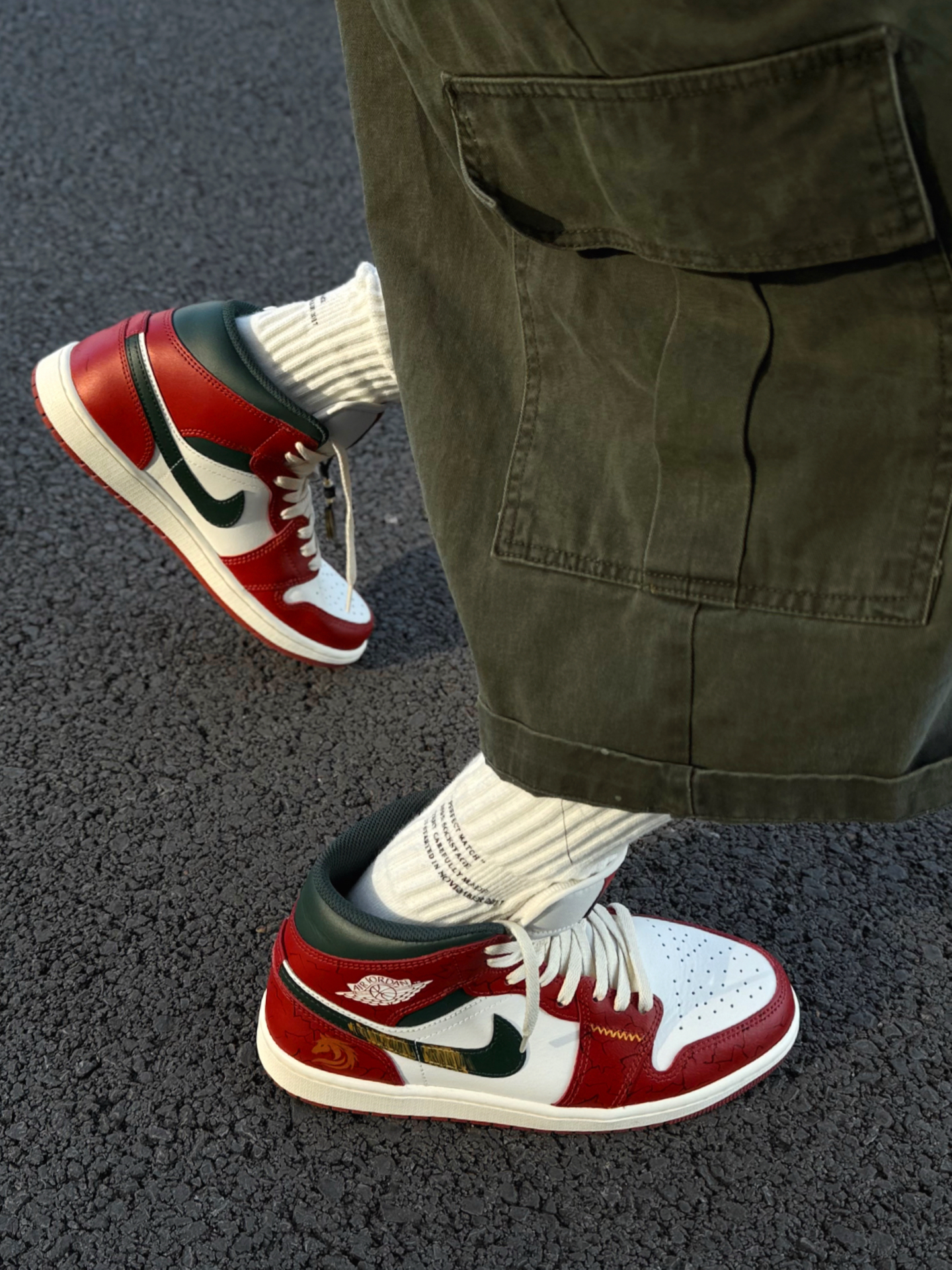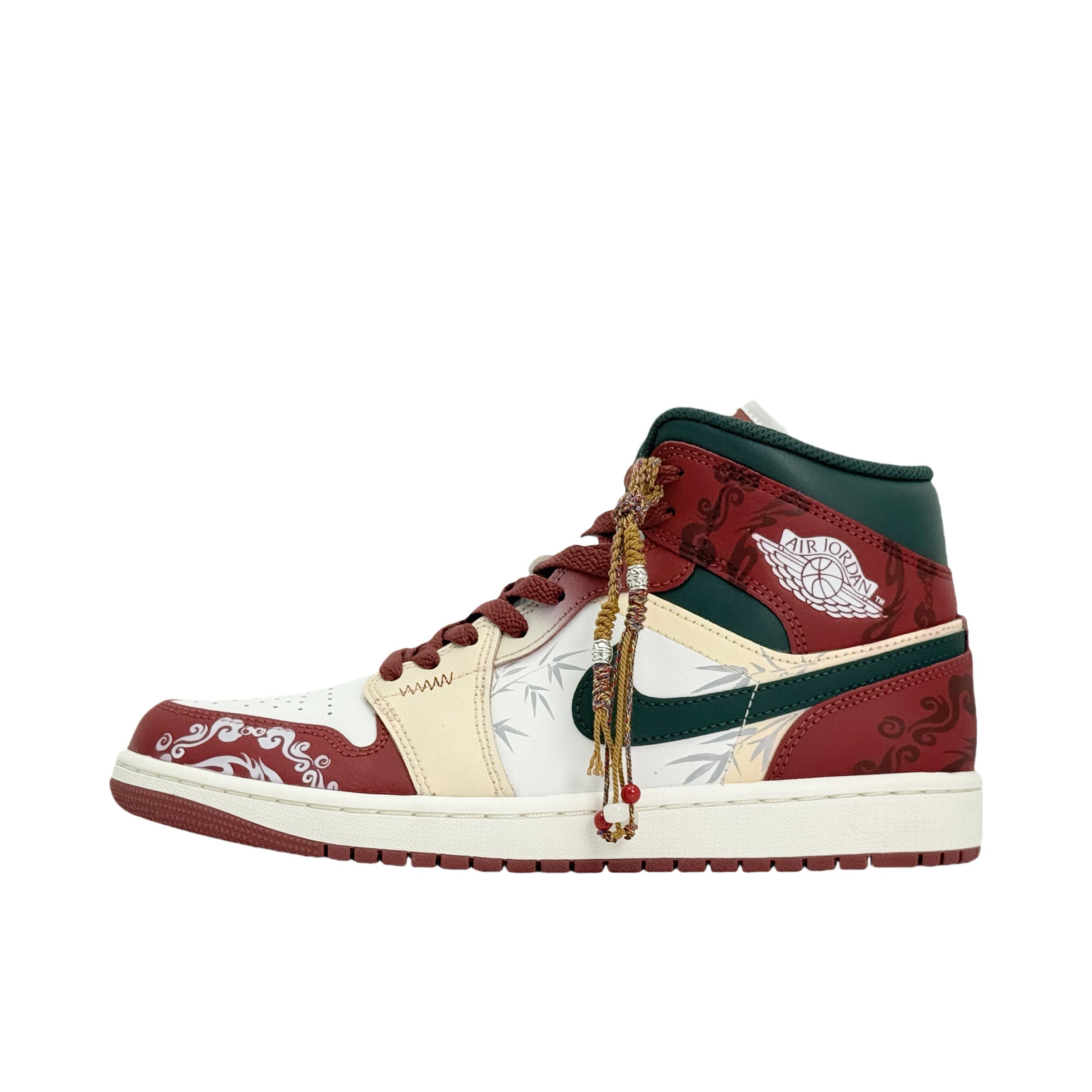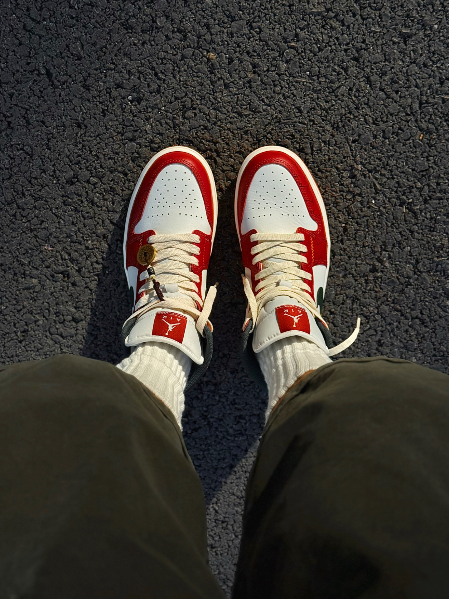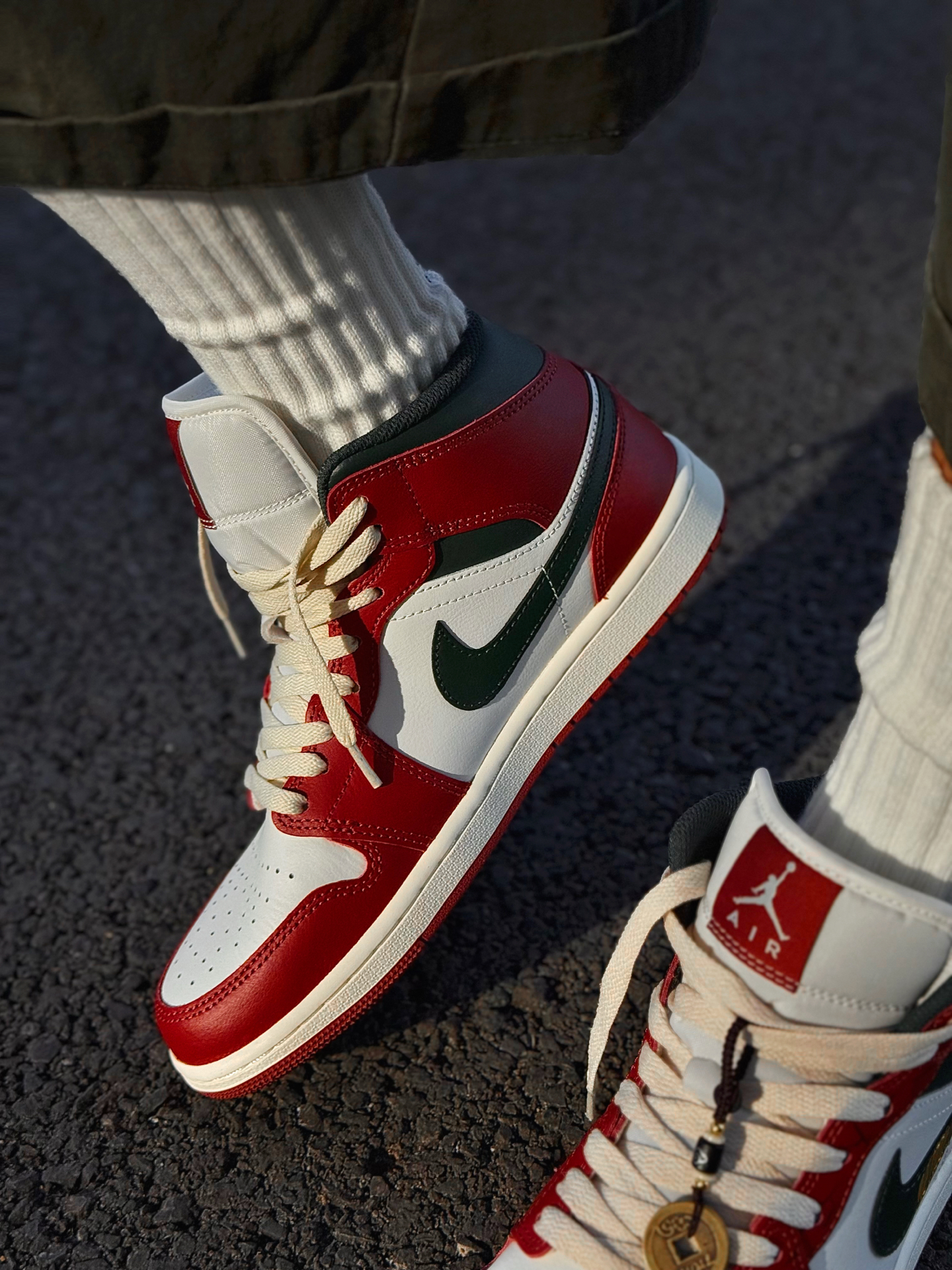 红色AJ1有很多,这双红调我还是很喜欢的了 鞋带和鞋底是做旧米黄色,复古做旧的感觉很明显 我喜欢日常搭蓝色牛仔裤、绿色工装裤 撞色的搭配很有美式复古风 喜欢的可以试试这样穿搭~ 我把送的铜钱吊坠挂鞋带上了 走路一晃一晃的还挺有意思 鞋头爆裂纹、后跟祥云龙马手绘都是细节 过年穿刚好讨个彩头 我脚偏宽,平时穿42码 这双mid中帮选42.5码上脚不挤 活动起来很舒服 如果平时穿AJ觉得脚感硬的兄弟...