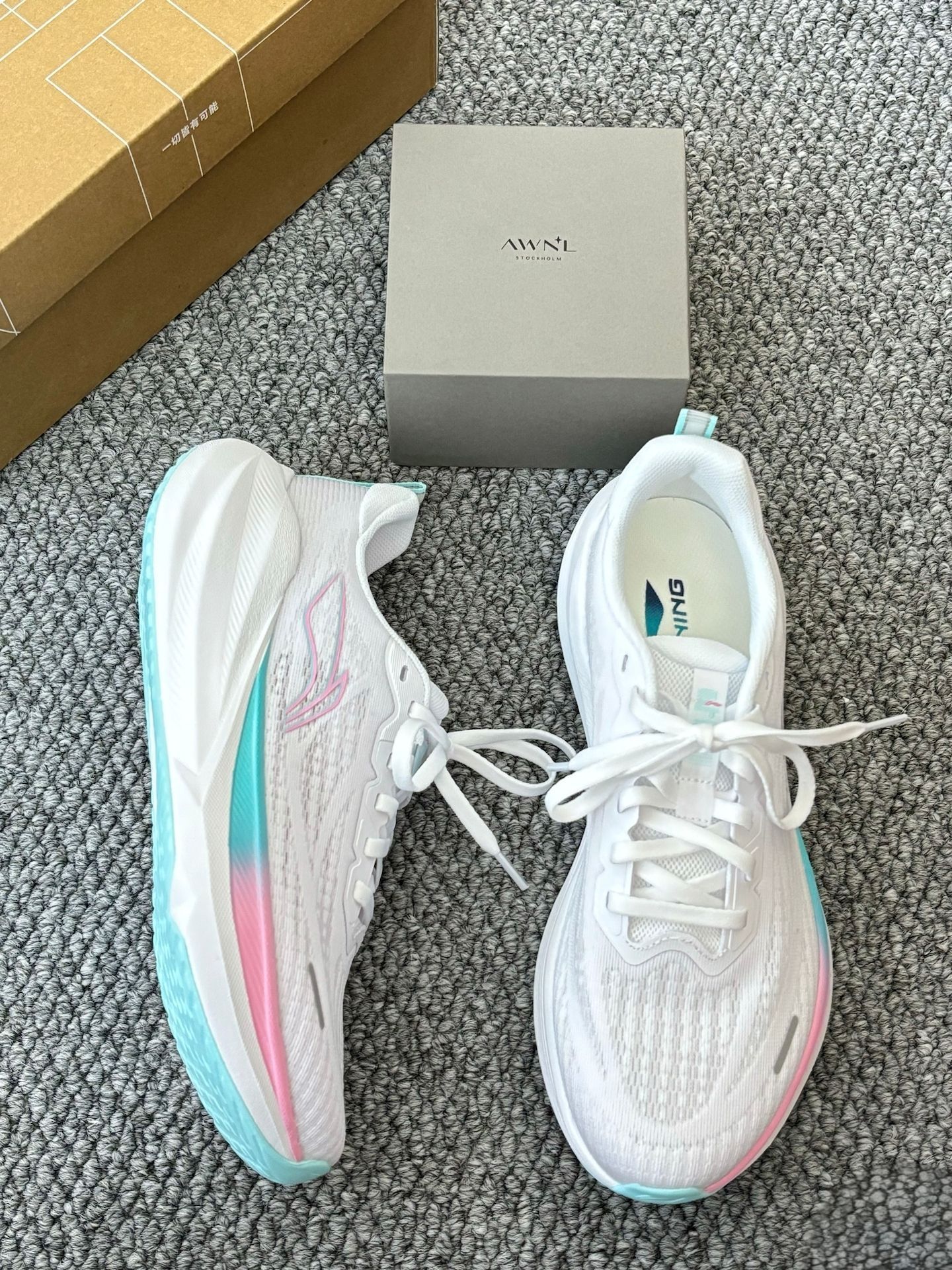 - 鞋身是清爽的白底色,搭配蓝粉渐变的撞色线条,不扎眼但自带清新感。 - 配牛仔裤、运动裤都很和谐,即使搭百褶裙或阔腿裤,也能让整体造型显得更有活力。 - 鞋底的软弹脚感很舒服,长时间走路、挤地铁都不会累,对学生党和通勤族特别友好。