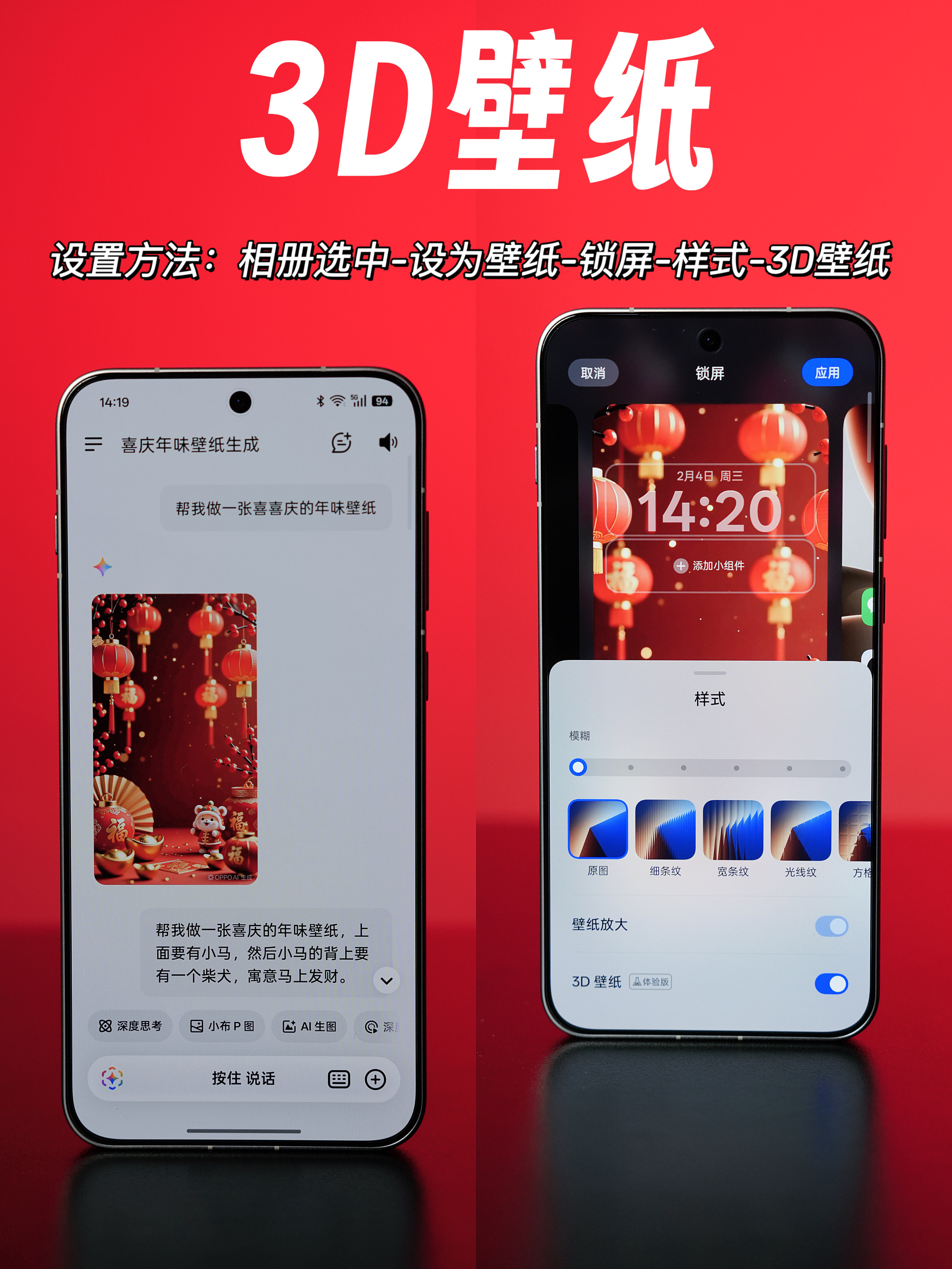 春节氛围越来越浓,咱每天都要用的手机也必须把年味拉满。教大家几招,让OPPO手机更有年味的设置,只要你的手机是ColorOS系统都可以。 1、3D壁纸 可以先让小布帮你生成一张很有喜庆氛围的新年壁纸,然后在相册选中将它设为壁纸-锁屏-样式-3D壁纸,就可以实现更立体的效果了,比静态壁纸要更生动有趣。 2、小布放烟花 跨年钟声响起时就对着手机说小布放烟花,手机屏幕上就会出现灿烂的2026新春烟花...