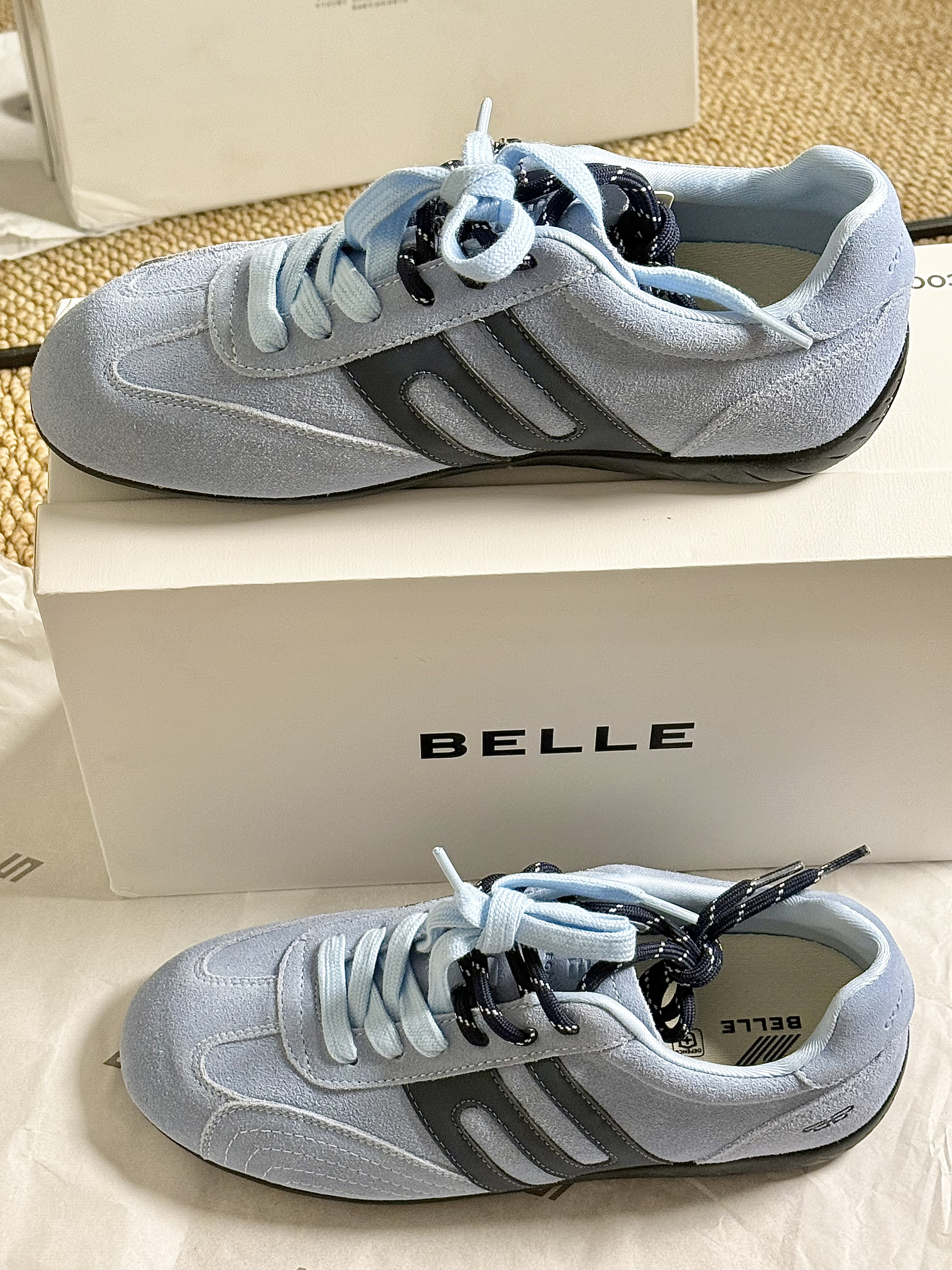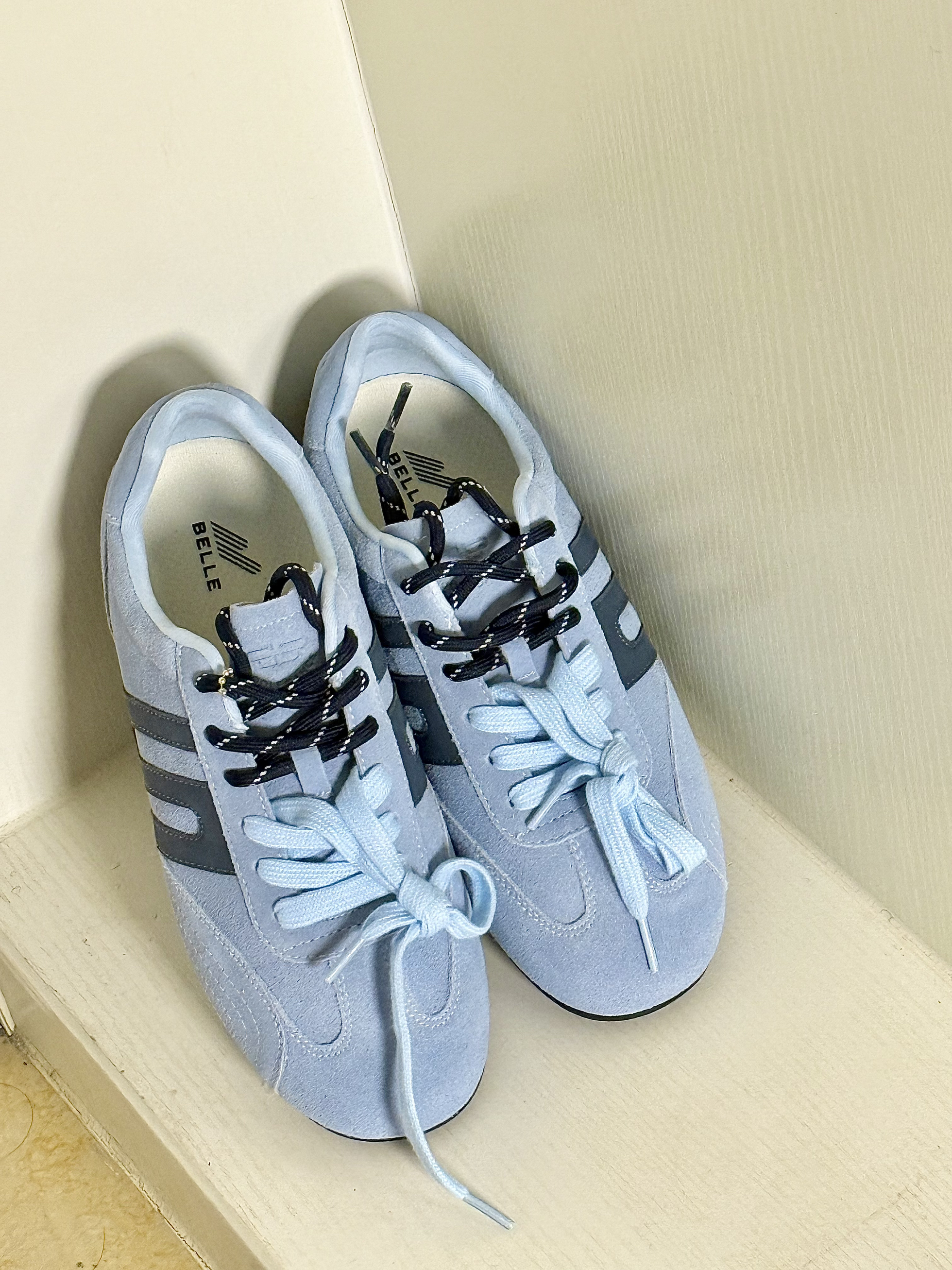 百丽这双浅蓝德训鞋,真的把我拿捏住了💙 ▫️ 鞋带是奶蓝+黑纹撞色,系成蝴蝶结或者随意散着都好看! ▫️ 麂皮软乎乎的,踩上去像踩了团棉花,逛街一天脚都不喊累! ▫️ 复古鞋型巨百搭,配阔腿裤是慵懒范儿,搭小裙子又甜又酷~ ⚠️ 偷偷说:麂皮有点娇贵,下雨天千万别穿!不然弄脏了真的会心疼死!😭 💡 今日穿搭公式: 浅蓝德训鞋 + 米白堆堆袜 + 棕色阔腿裤 = 松弛感天花板! 随手一拍都是氛围感...
