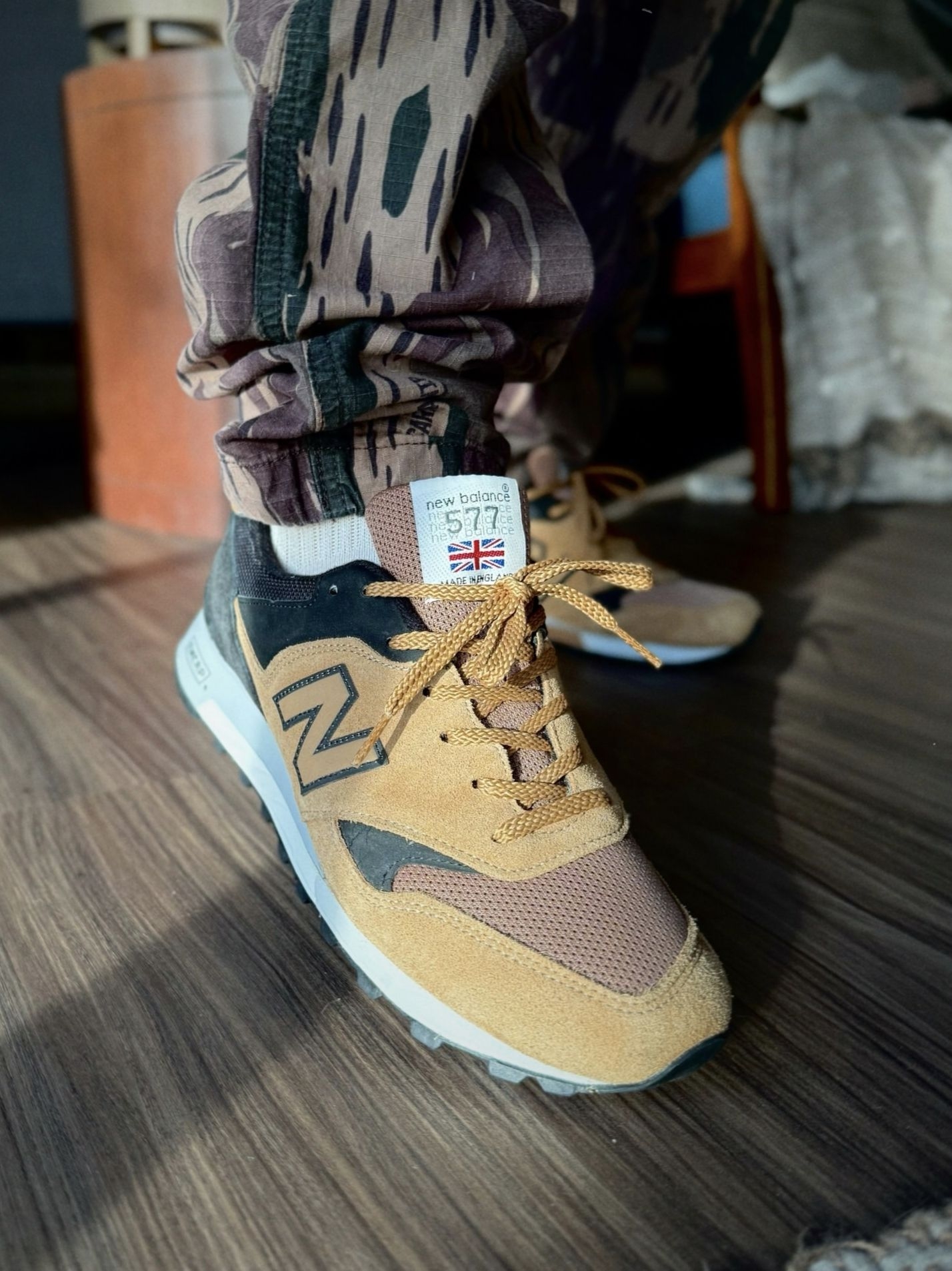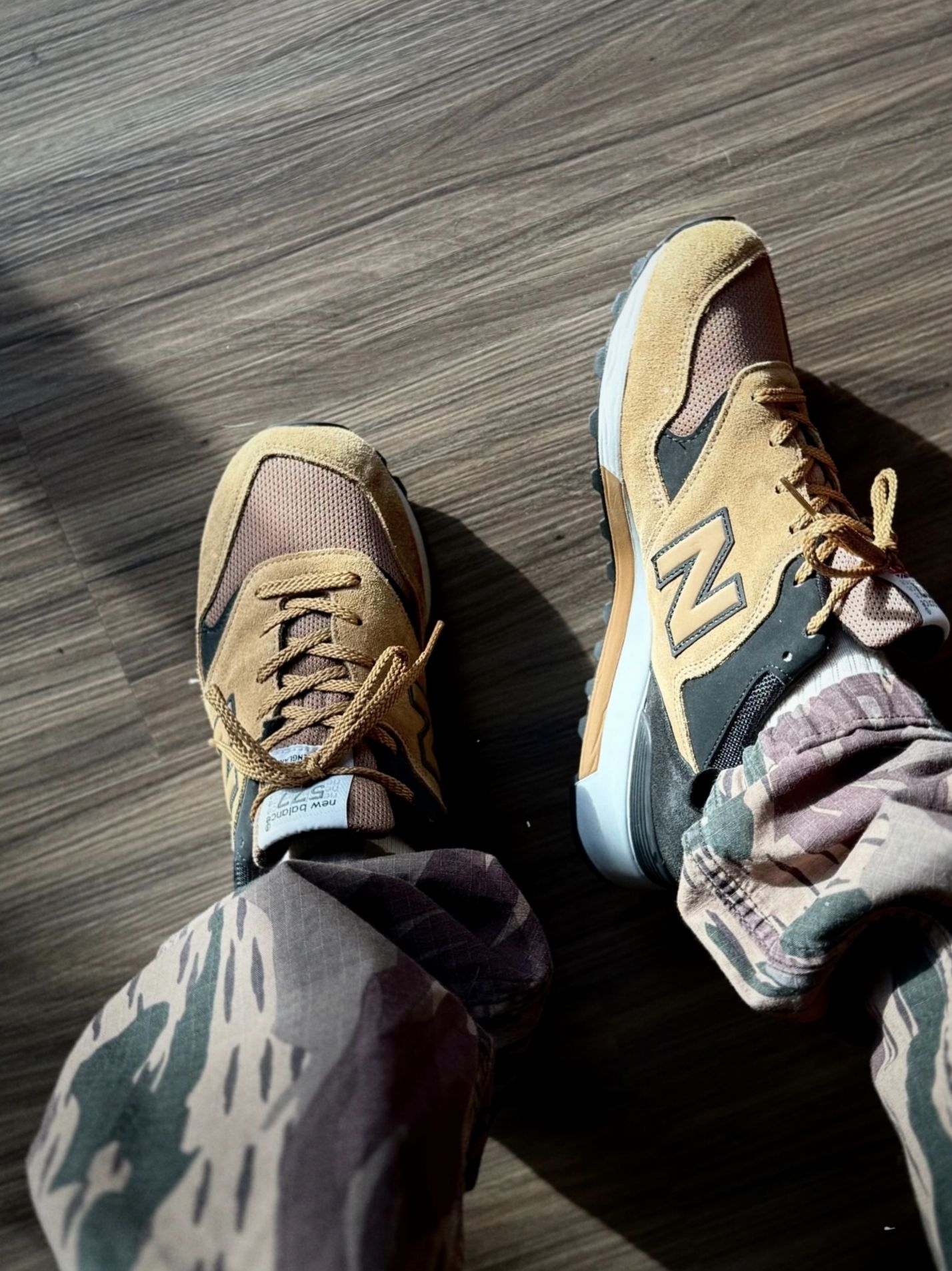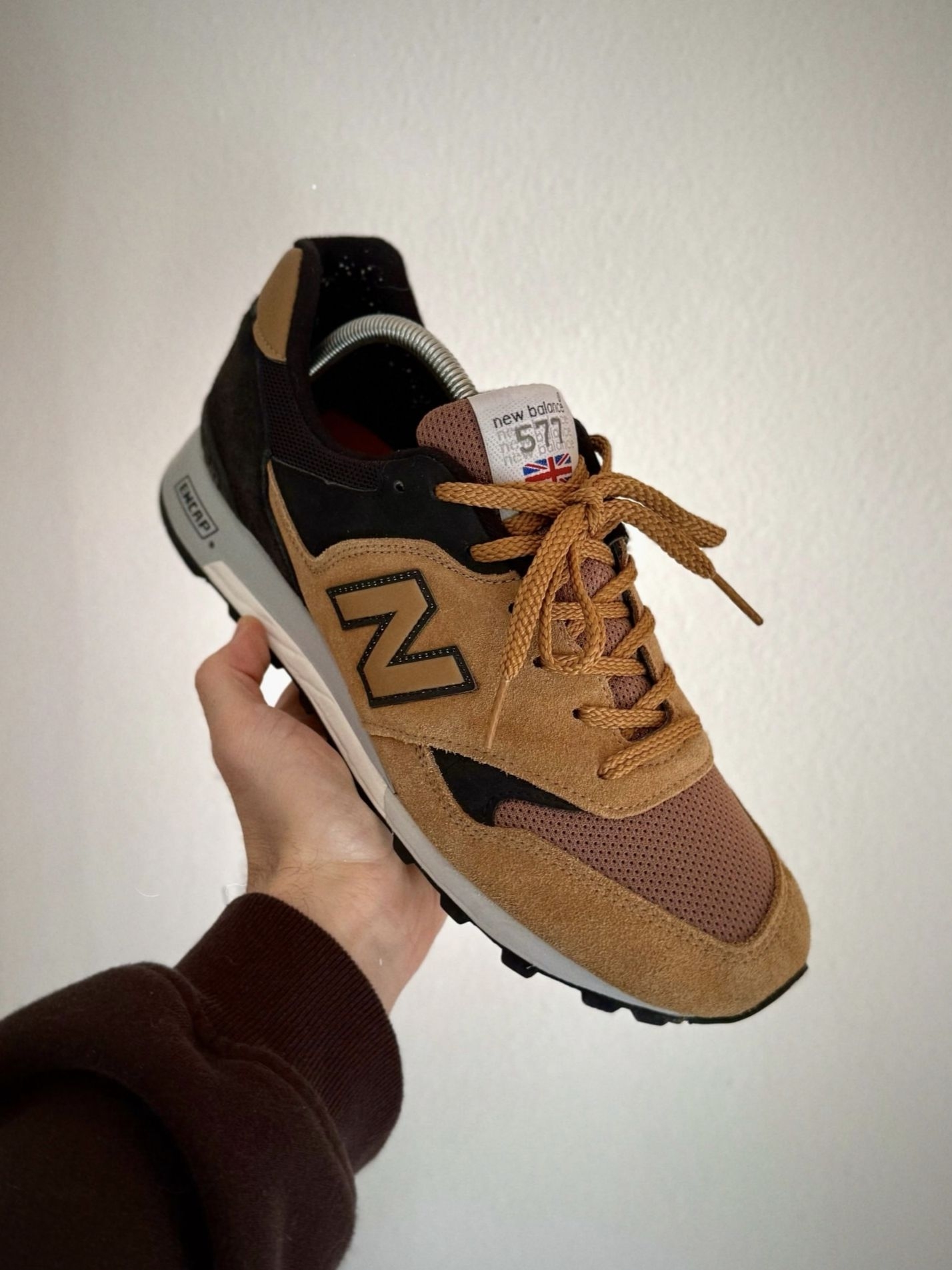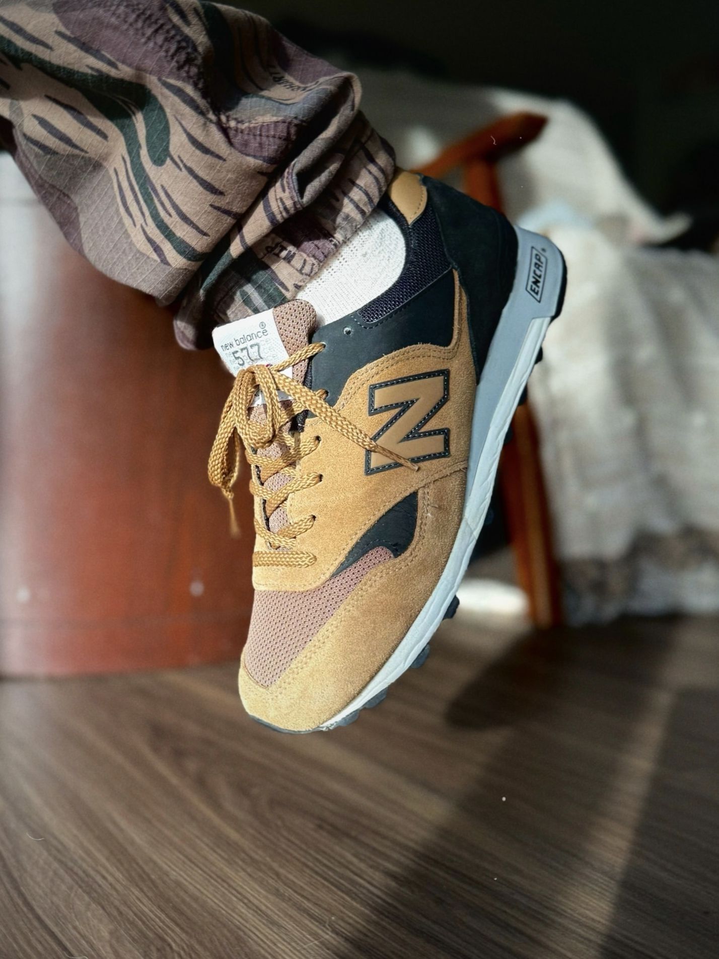 我一眼就被吸引,当它悬在室内木质地板上方时,焦糖棕翻毛皮与黑色绒面革的拼接鞋面自带粗犷质感,搭配迷彩工装裤,把户外机能风的硬核氛围拉满。 我越看越爱它的实用细节,翻毛皮与网布拼接的鞋面兼顾耐磨与透气,ENCAP缓震中底脚感扎实稳定,应对城市复杂路面与轻量户外都游刃有余。棕黑撞色既保留了复古跑鞋的松弛感,又多了几分硬核气质,搭配卡其工装裤、做旧牛仔裤或迷彩裤都能驾驭,是户外风玩家的吸睛选择。 ...