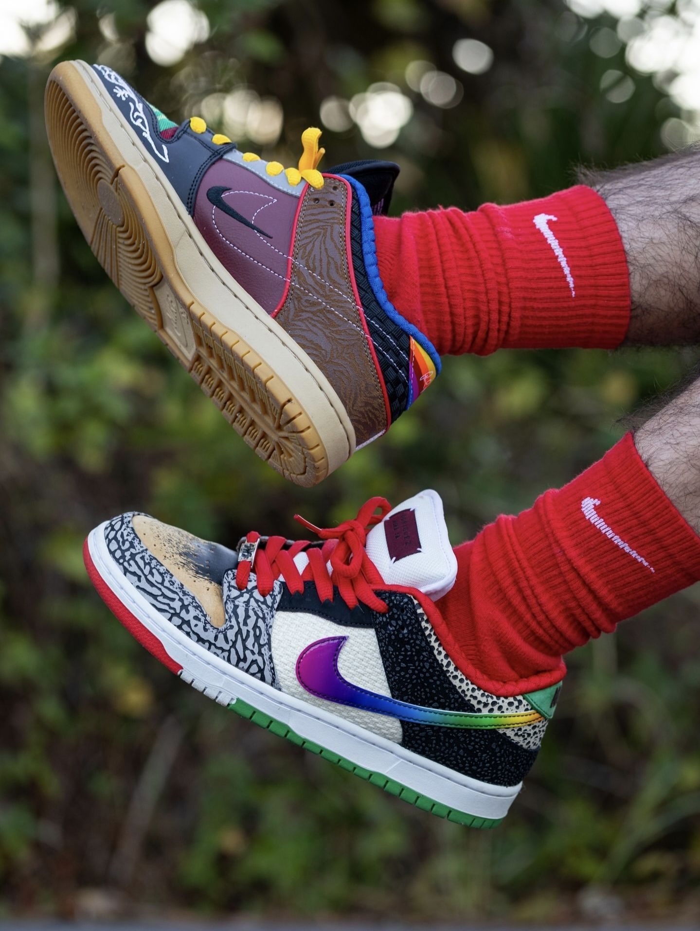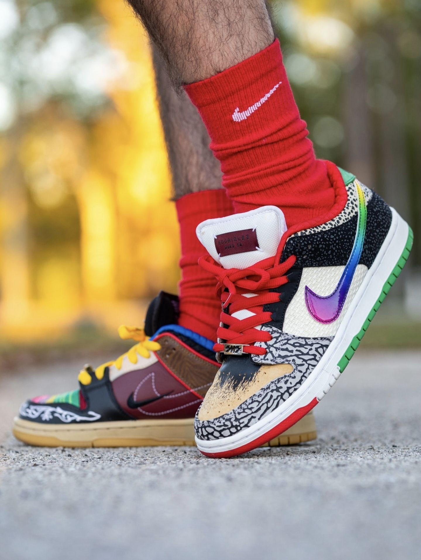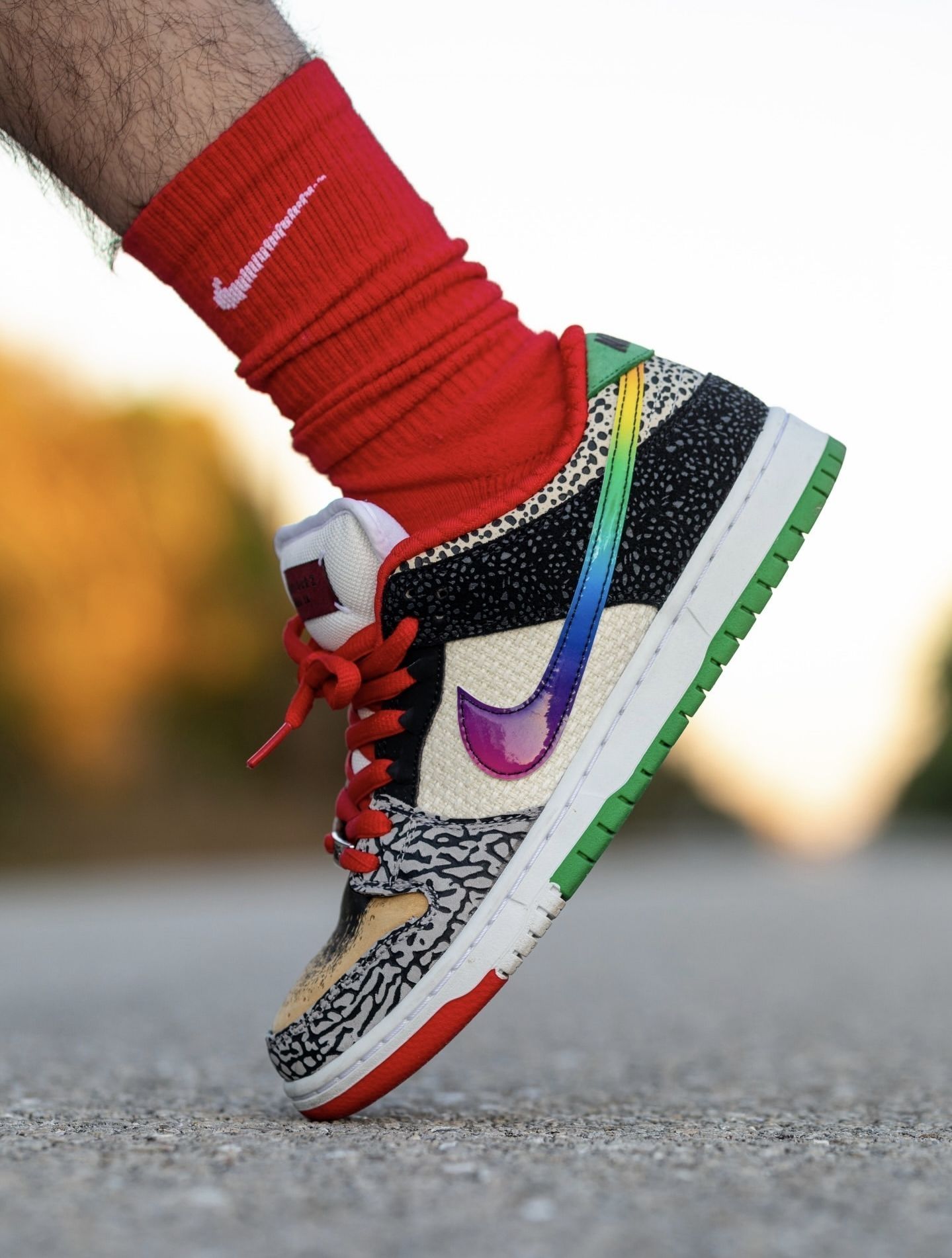我直呼炸裂,这双“What The Paul”完全是把街头玩梗和复古滑板文化焊在了一起。 我越看越爱,鞋身把豹纹、爆裂纹、彩虹渐变等十几种经典元素疯狂拼接,就像翻遍了Paul Rodriguez职业生涯的滑板鞋库。翻毛皮、帆布、漆皮的材质碰撞充满层次,鞋侧的Swoosh从绿到紫渐变,搭配红袜和秋日背景,视觉冲击力直接拉满。低帮设计让脚踝活动自如,橡胶大底的纹路抓地力超强,刷街时带碎石的柏油路也...