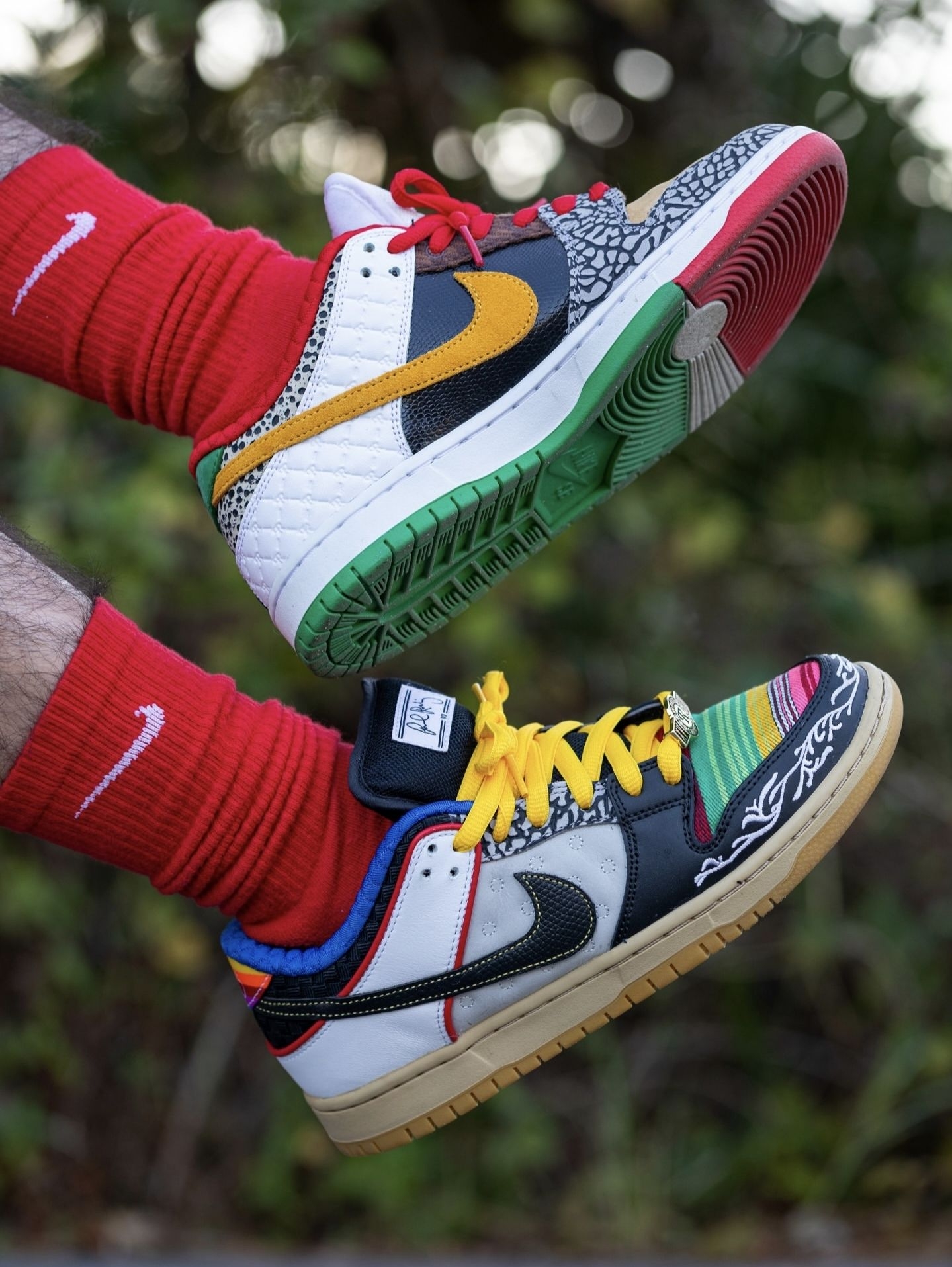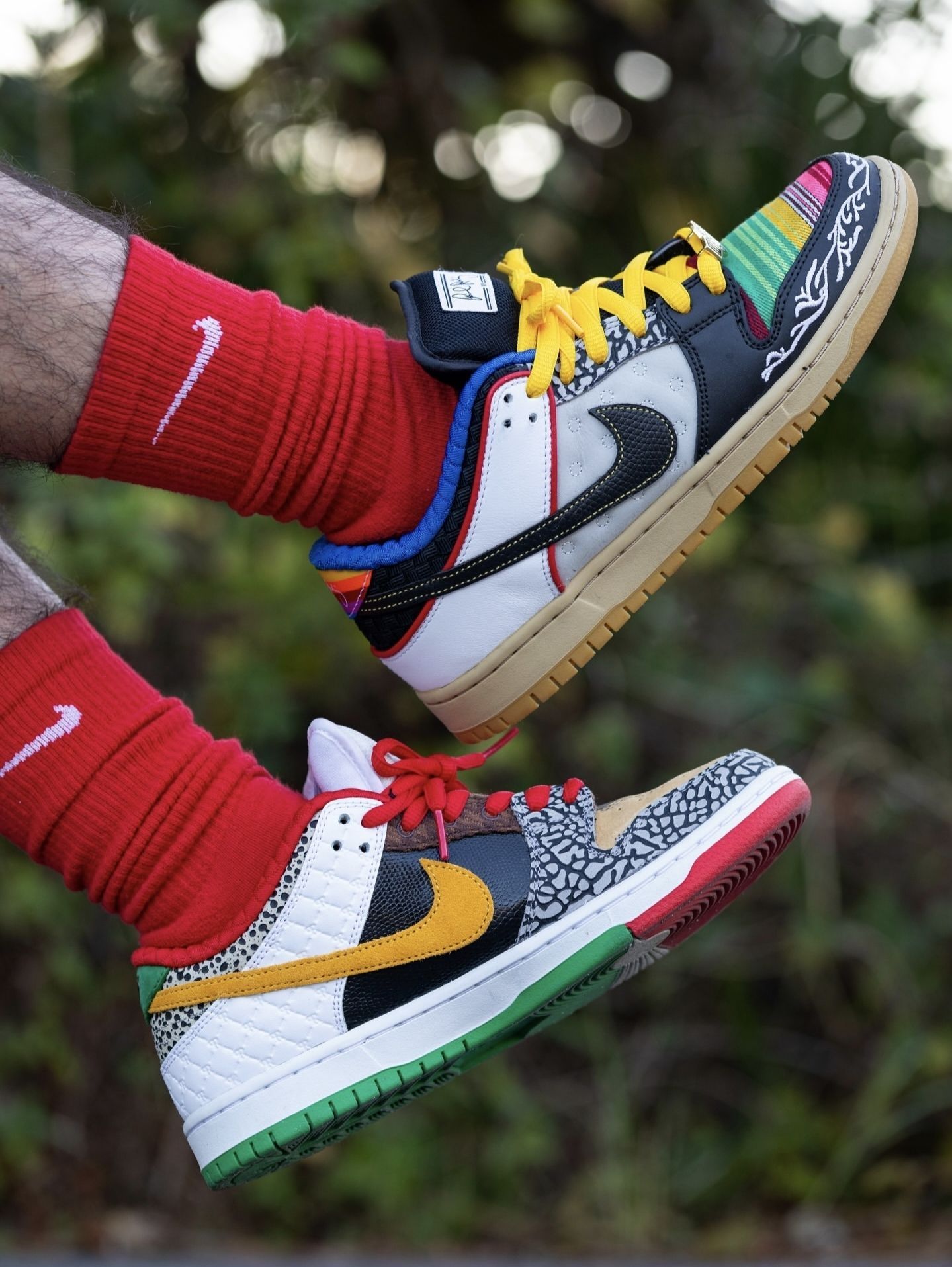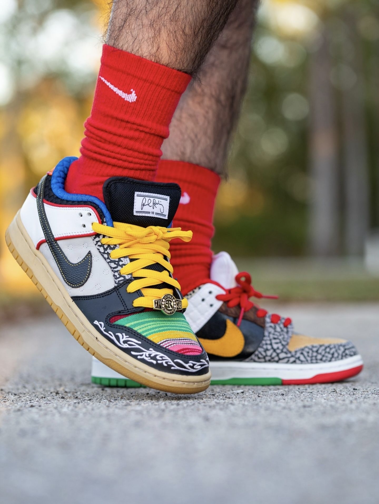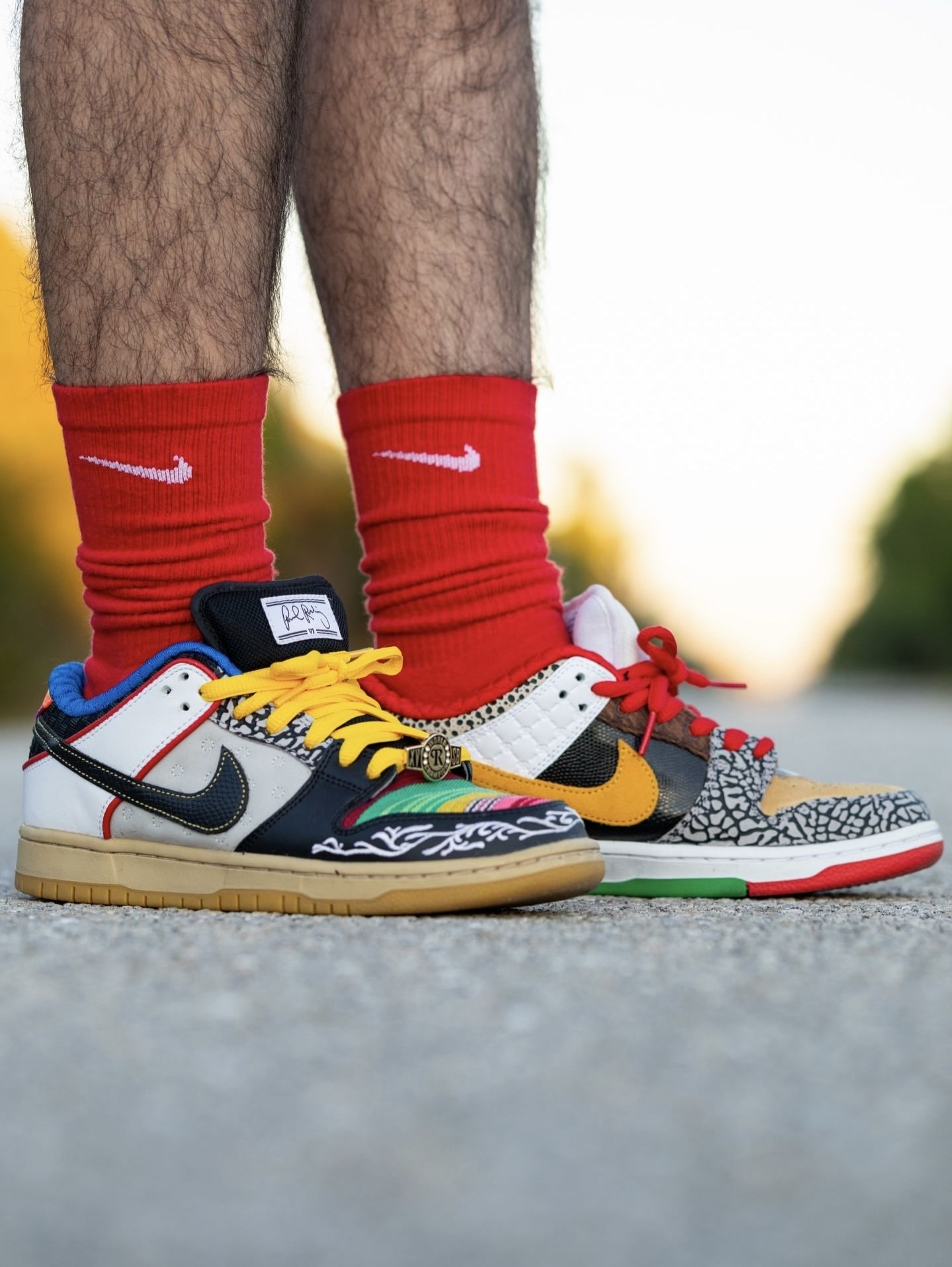 我直呼炸裂,这双“What The Paul”完全是把街头玩梗和复古滑板文化焊在了一起。 我越看越爱,鞋身把豹纹、爆裂纹、彩虹渐变等十几种经典元素疯狂拼接,就像翻遍了Paul Rodriguez职业生涯的滑板鞋库。翻毛皮、帆布、漆皮的材质碰撞充满层次,鞋侧的Swoosh从绿到紫渐变,搭配红袜和秋日背景,视觉冲击力直接拉满。低帮设计让脚踝活动自如,橡胶大底的纹路抓地力超强,刷街时带碎石的柏油路也...