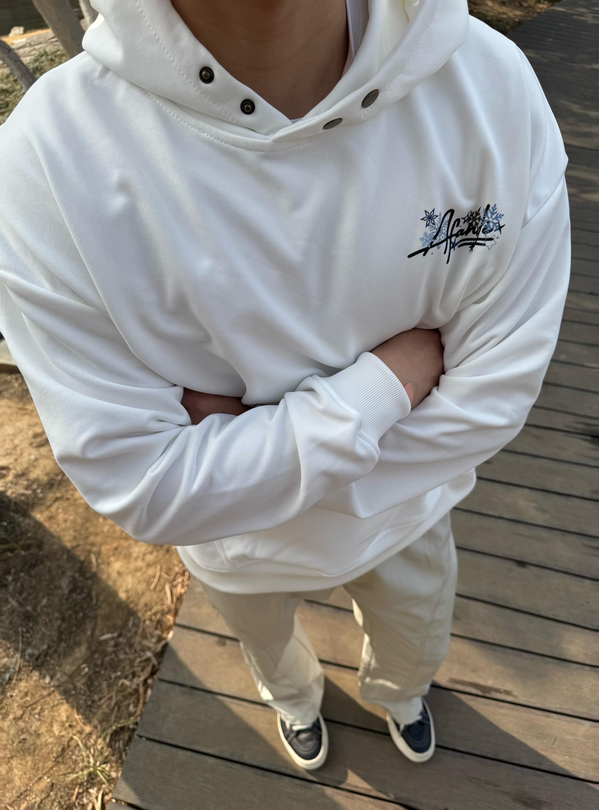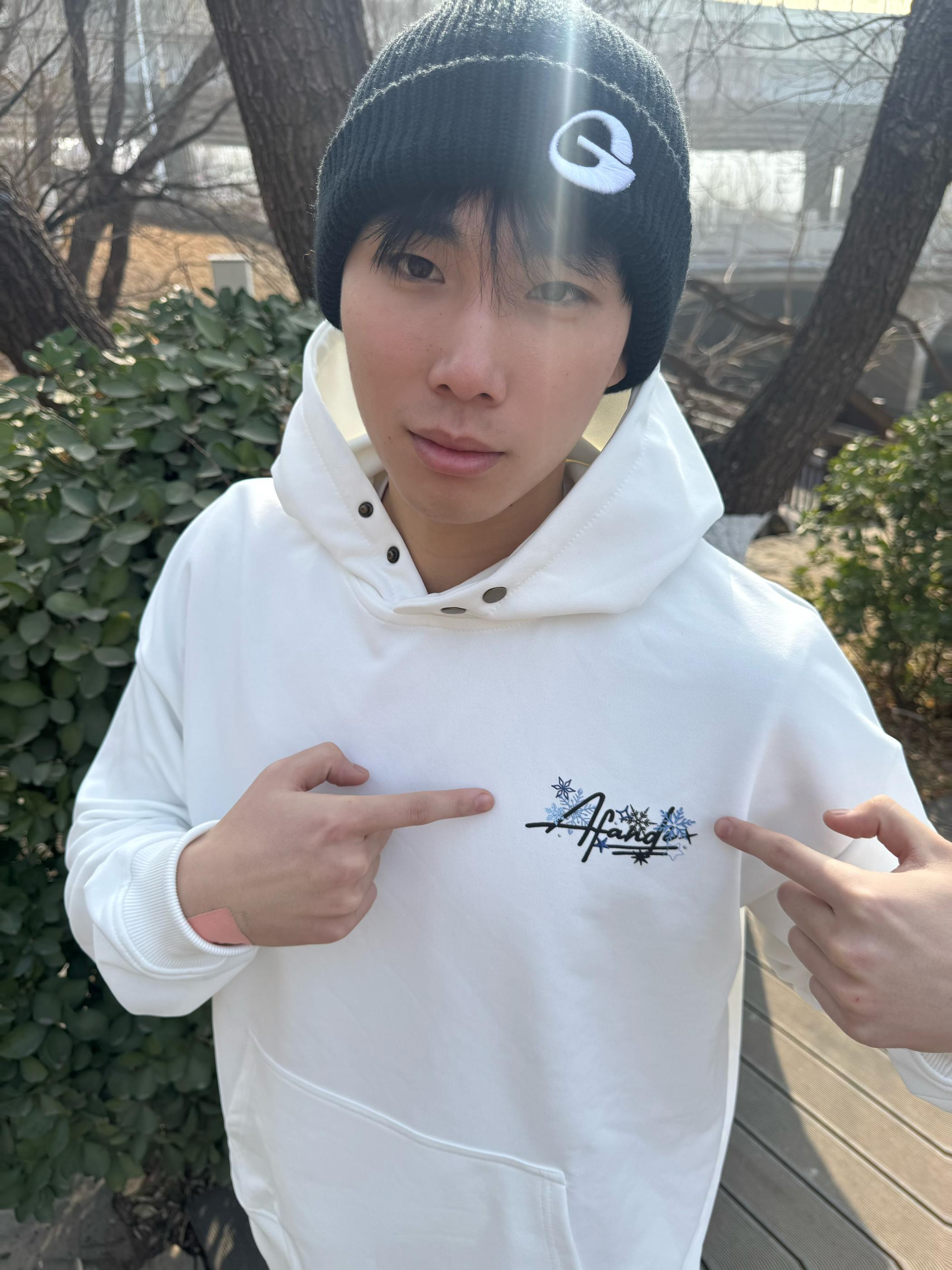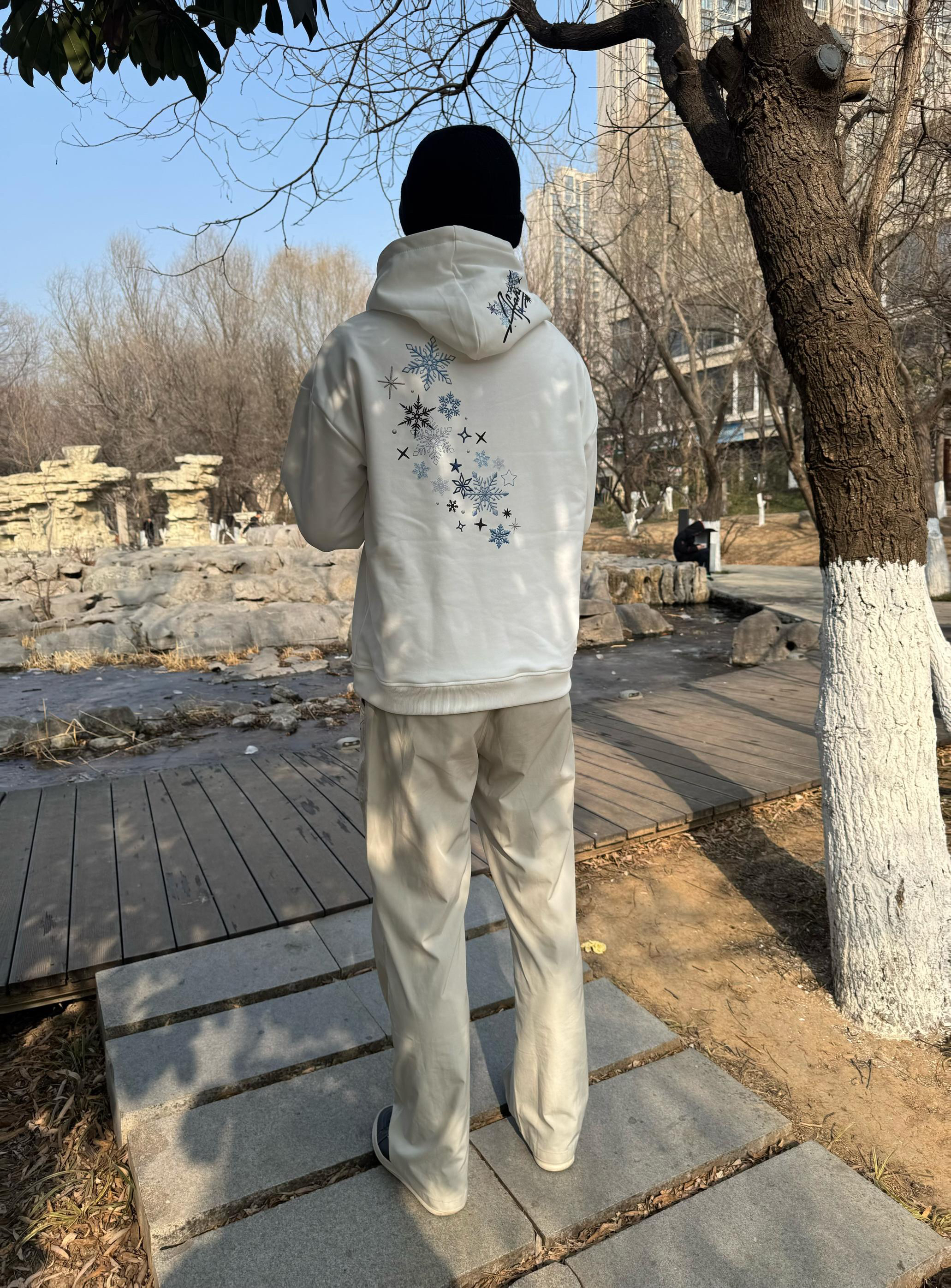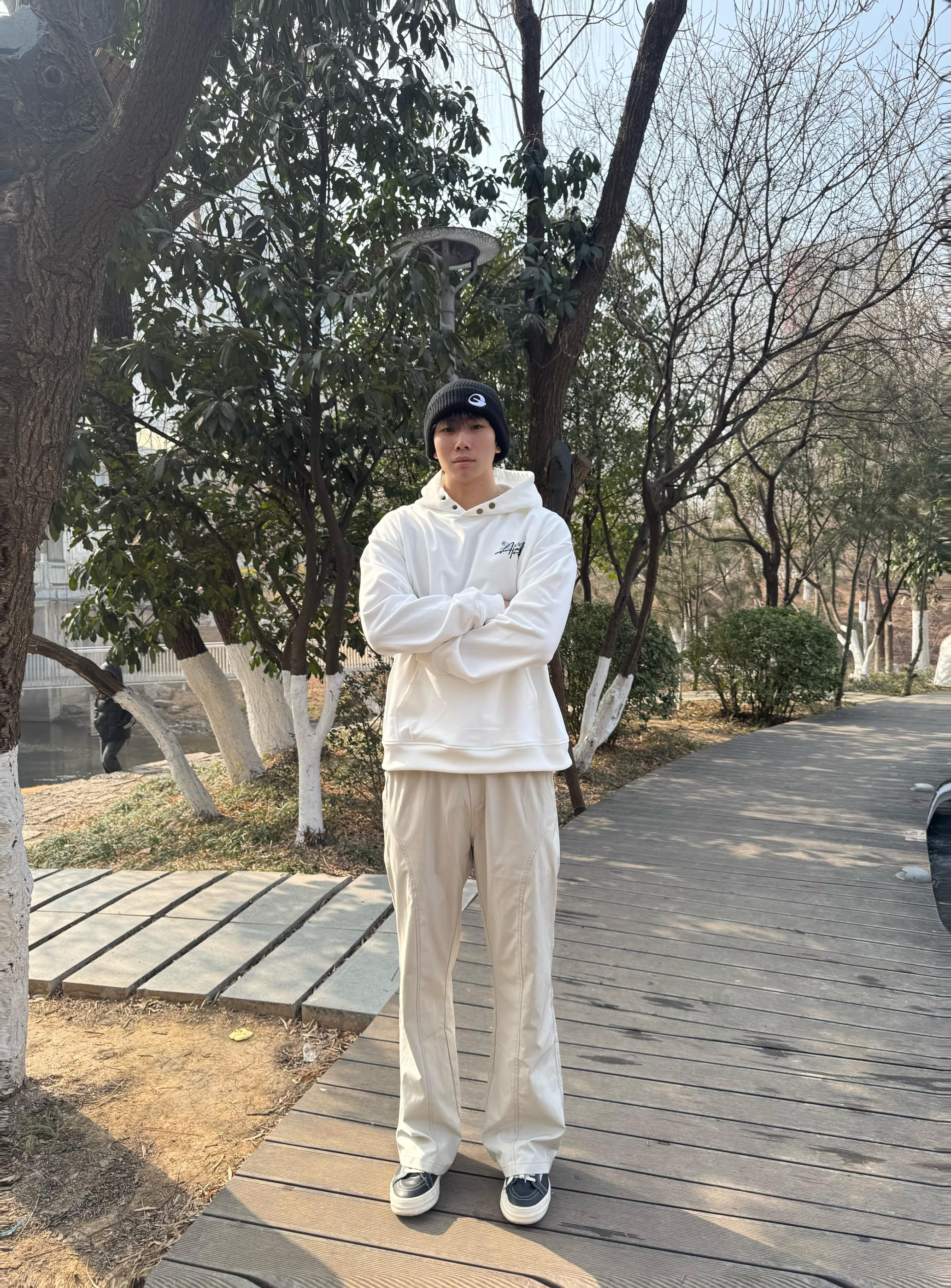 上半身:今日上身一件白色的加绒加厚雪花刺绣卫衣,衣服料子摸起来很手感很好,今天天气气温只有几度,不过好在它里面是加绒的,里面毛绒绒的很保暖,摸起来软fufu~的,很喜欢这种里面加绒的衣服,卫衣不论是单穿还是叠穿都很好看,衣服版型也很好,简直就是出片神器!! • 下半身:还是一条我经常穿的米白色直筒裤搭配一双黑白色板鞋,这套我真的太喜欢啦,陪我出了好多片。 • 本人身高185体重165上下浮动 •卫...