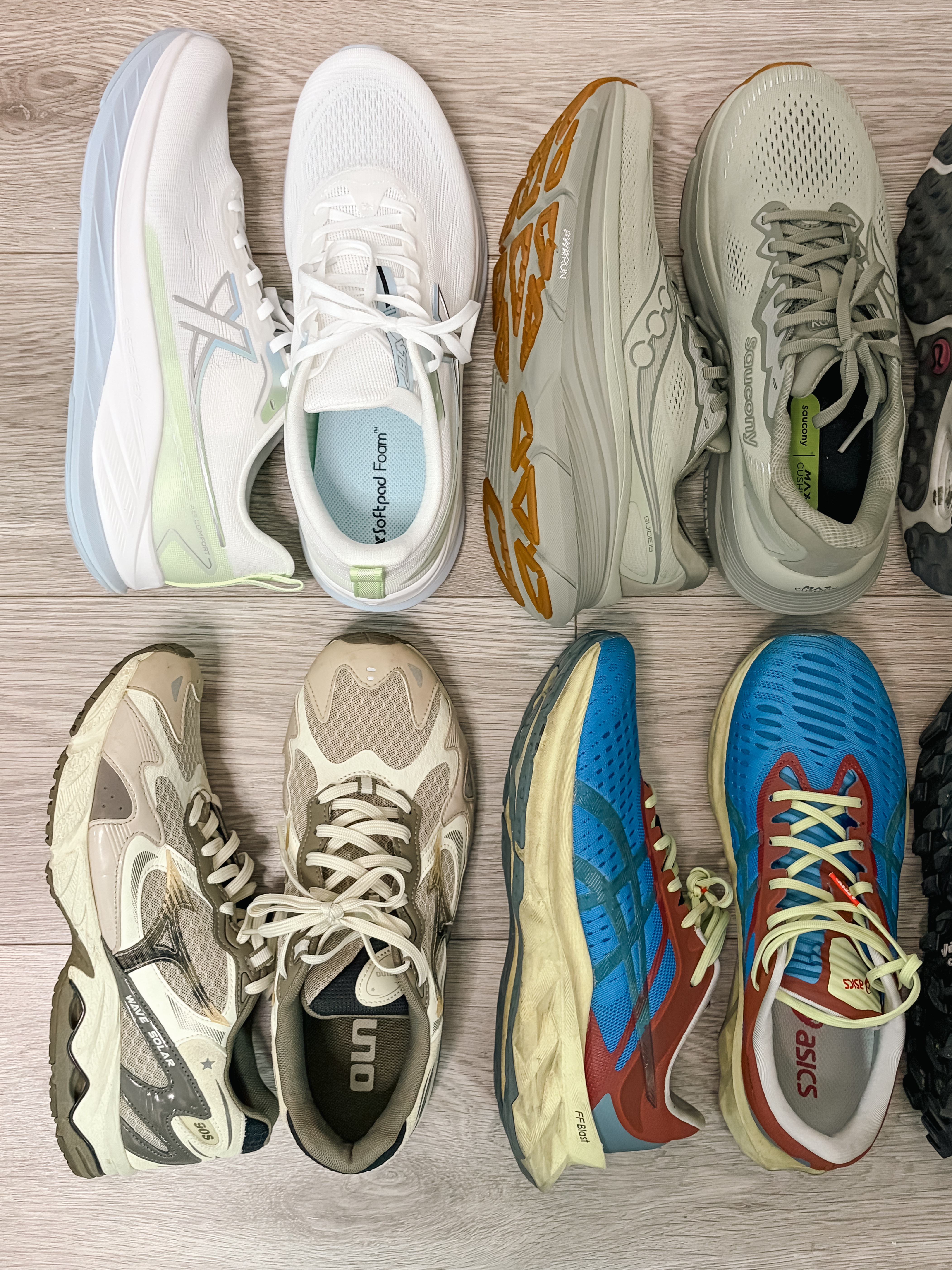 asics 发过n次了 联名这个配色比较冷门 gtaft 应该更小众这个品牌 我觉得质量一般 边缘会掉胶 而且严重偏小 美津侬 复古跑鞋 作为穿搭更合适 特步 国产里把我比较喜欢他的鞋楦 比较健康的鞋型 日常和健身房都可以用 索康尼 这波是真的被圈粉 前掌宽的真的拇外翻狂喜 而且很韧 lululemon 也算冷门吧 偏小 跑步肯定合适 但是他不是软的那种类型