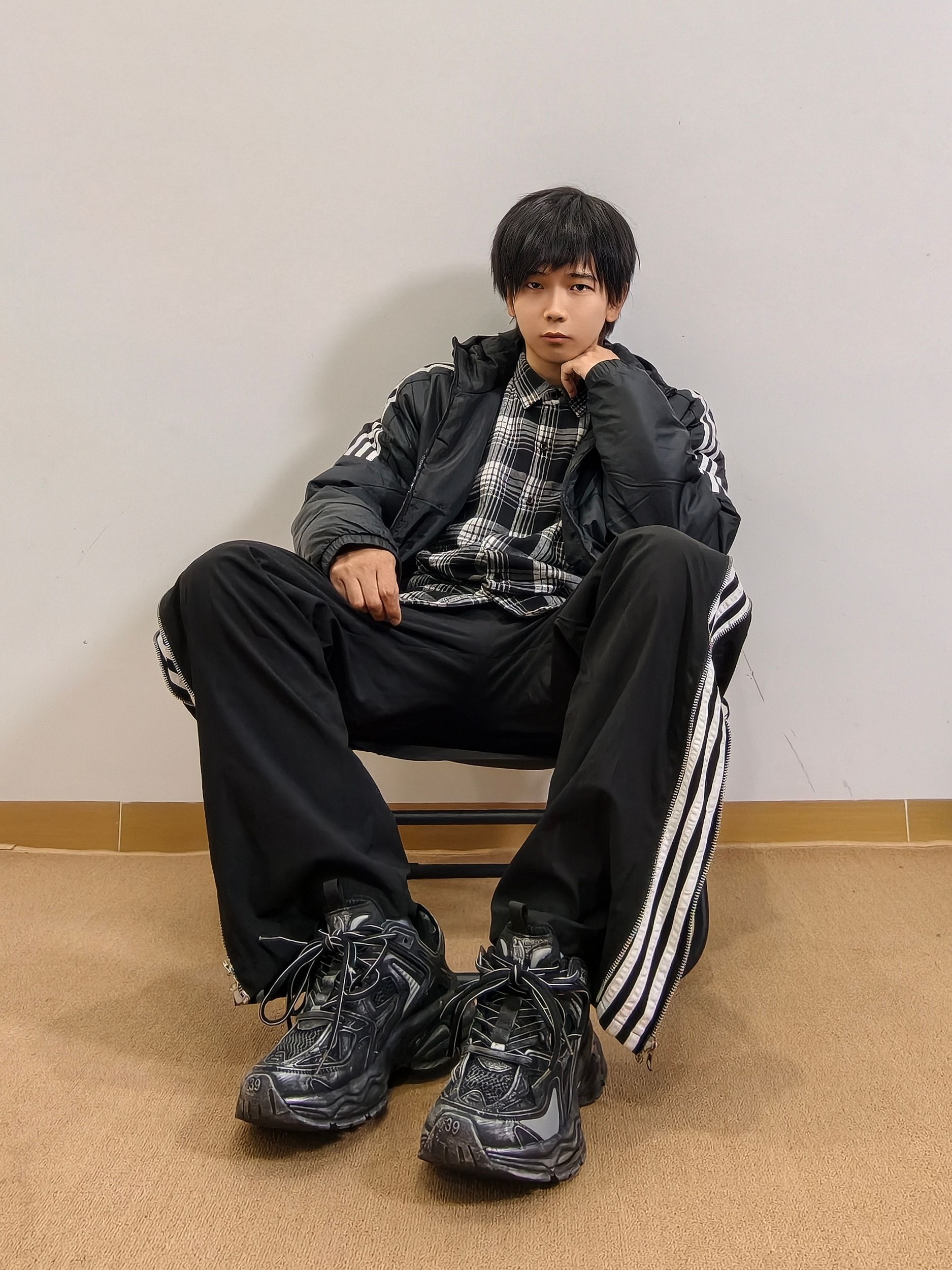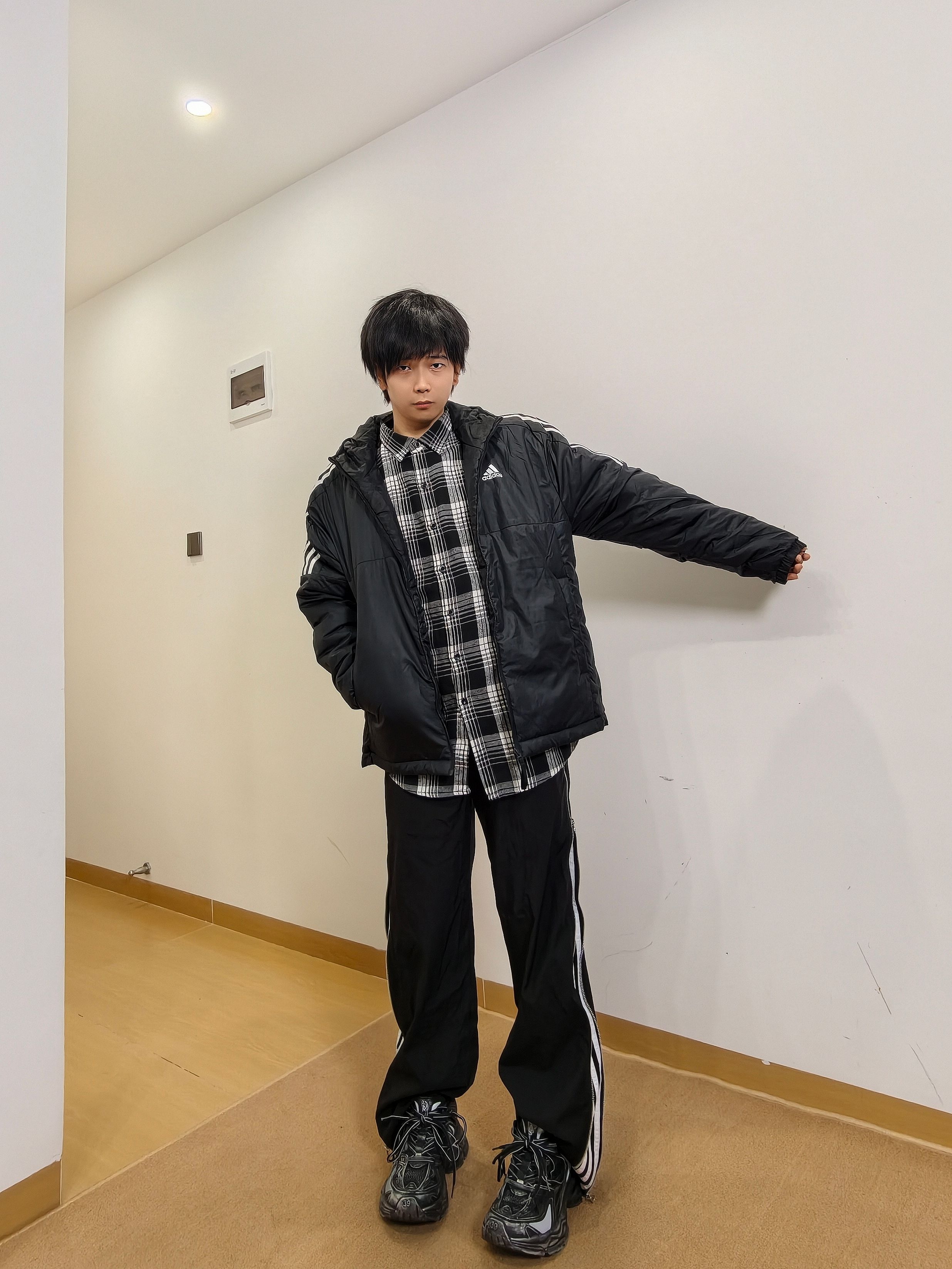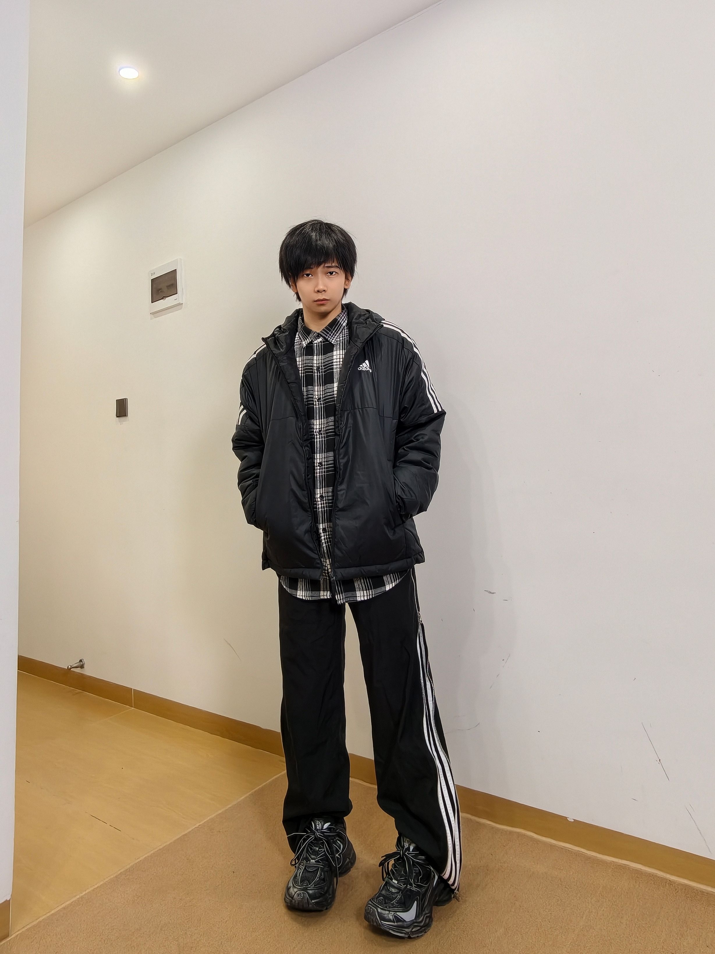 果然黑色是男生的医美 妥妥的阿迪棉服配衬衣 下身也是黑色系,简单又好看