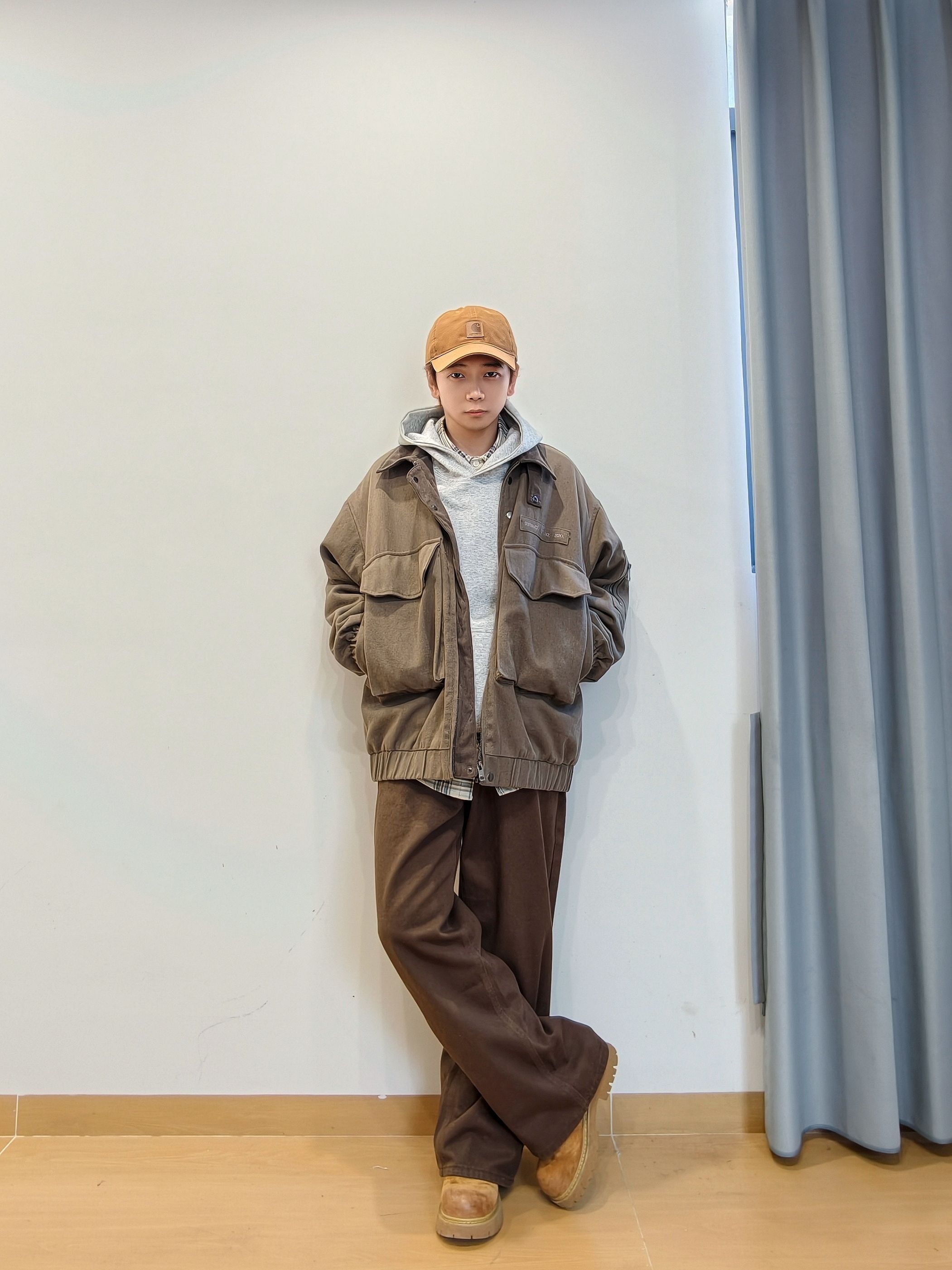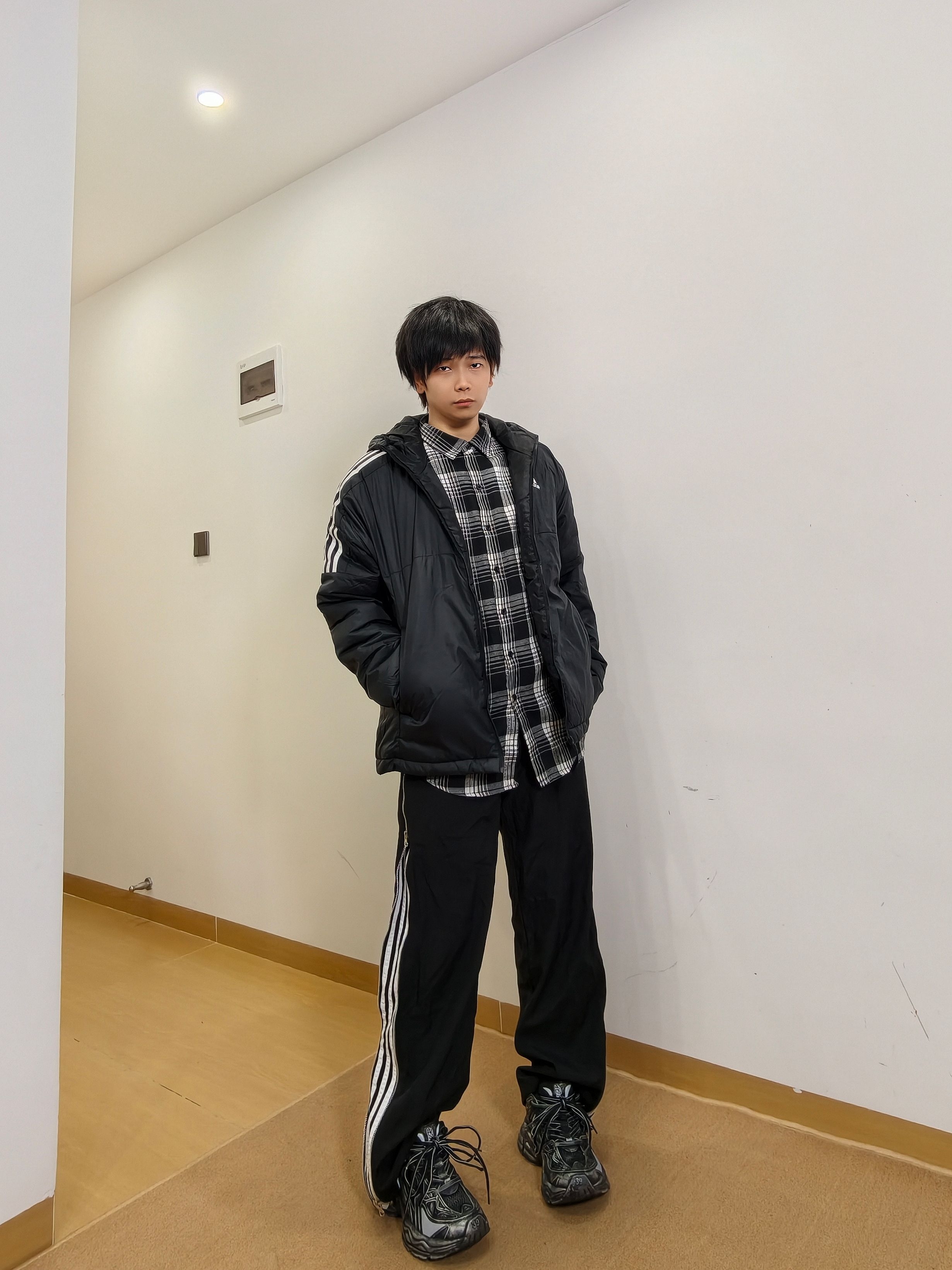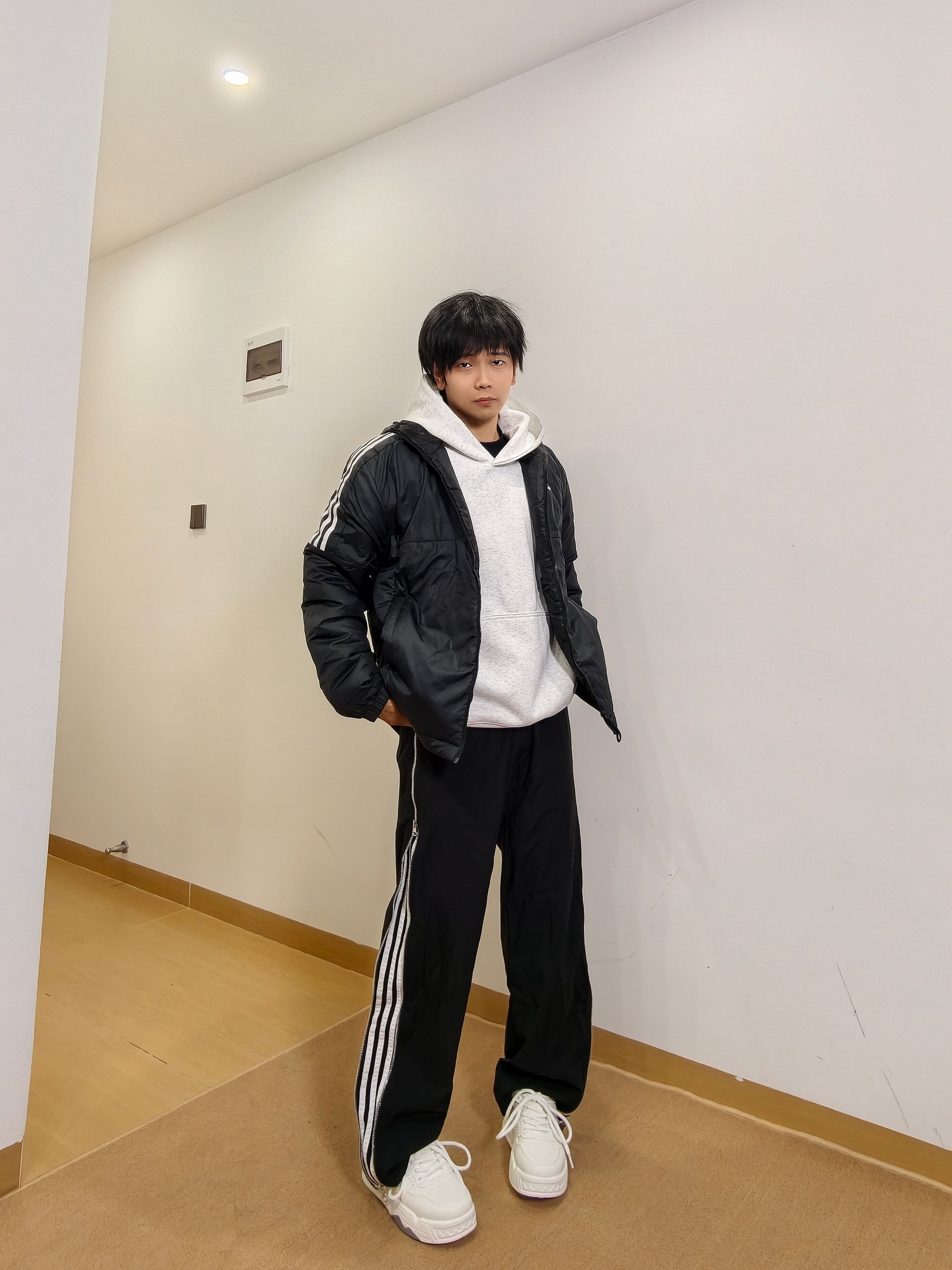 黑色系棉服配白花灰卫衣叠穿 下身也是黑色裤子+小白鞋呼应上身 好看又休闲,通勤太可了