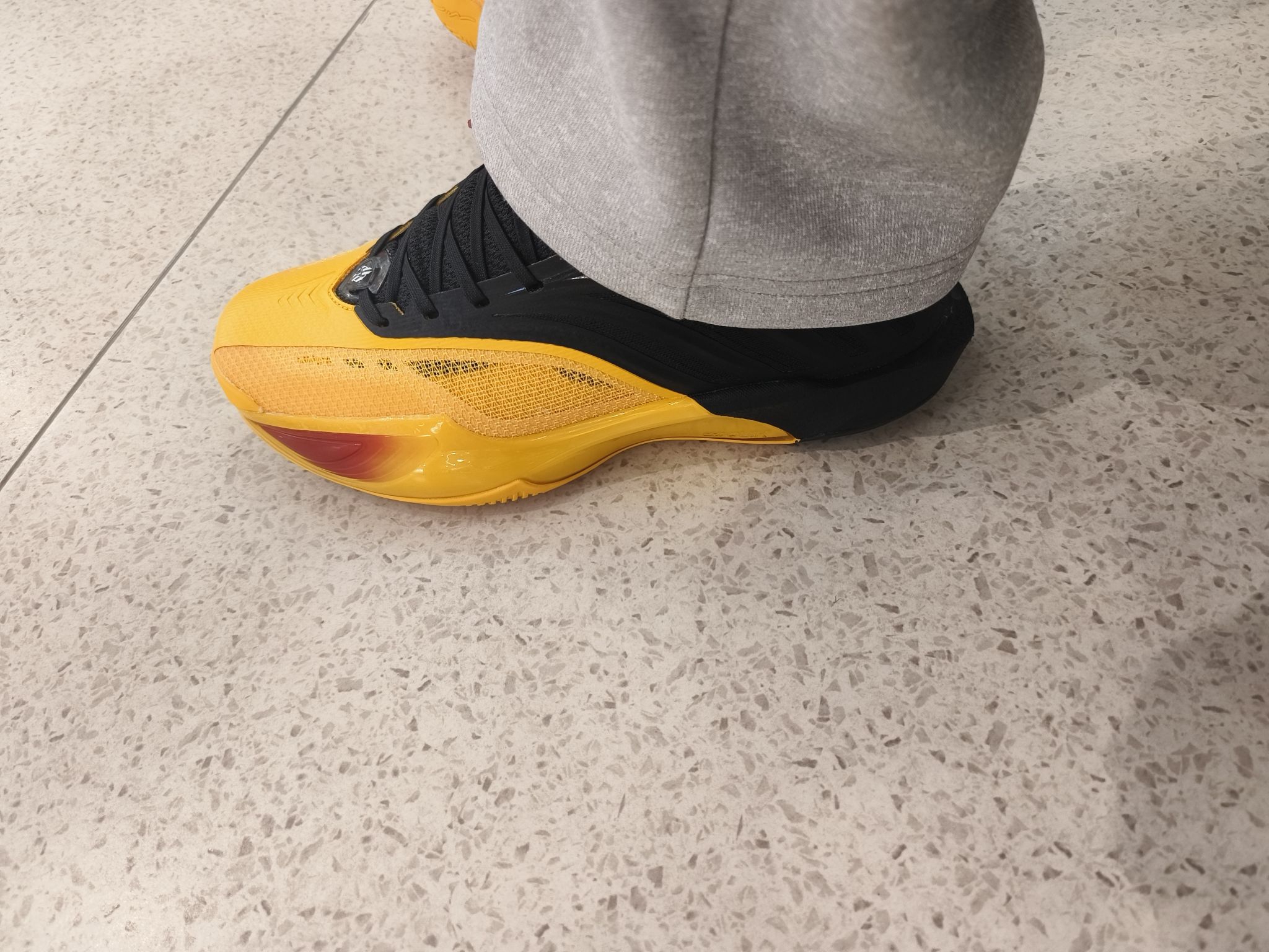 其次,关于这个前掌的反馈,我觉得有一丢丢的过于韧弹,那块凸起有些顶,无论你是投射党还是突破党,前掌的脚感肯定是追求快速反馈,啪的一下就起来,这个很明显没有,脚感有点像一块平平的硬床板上边铺了一层软床垫,对于追求快的后卫来说并不给劲。