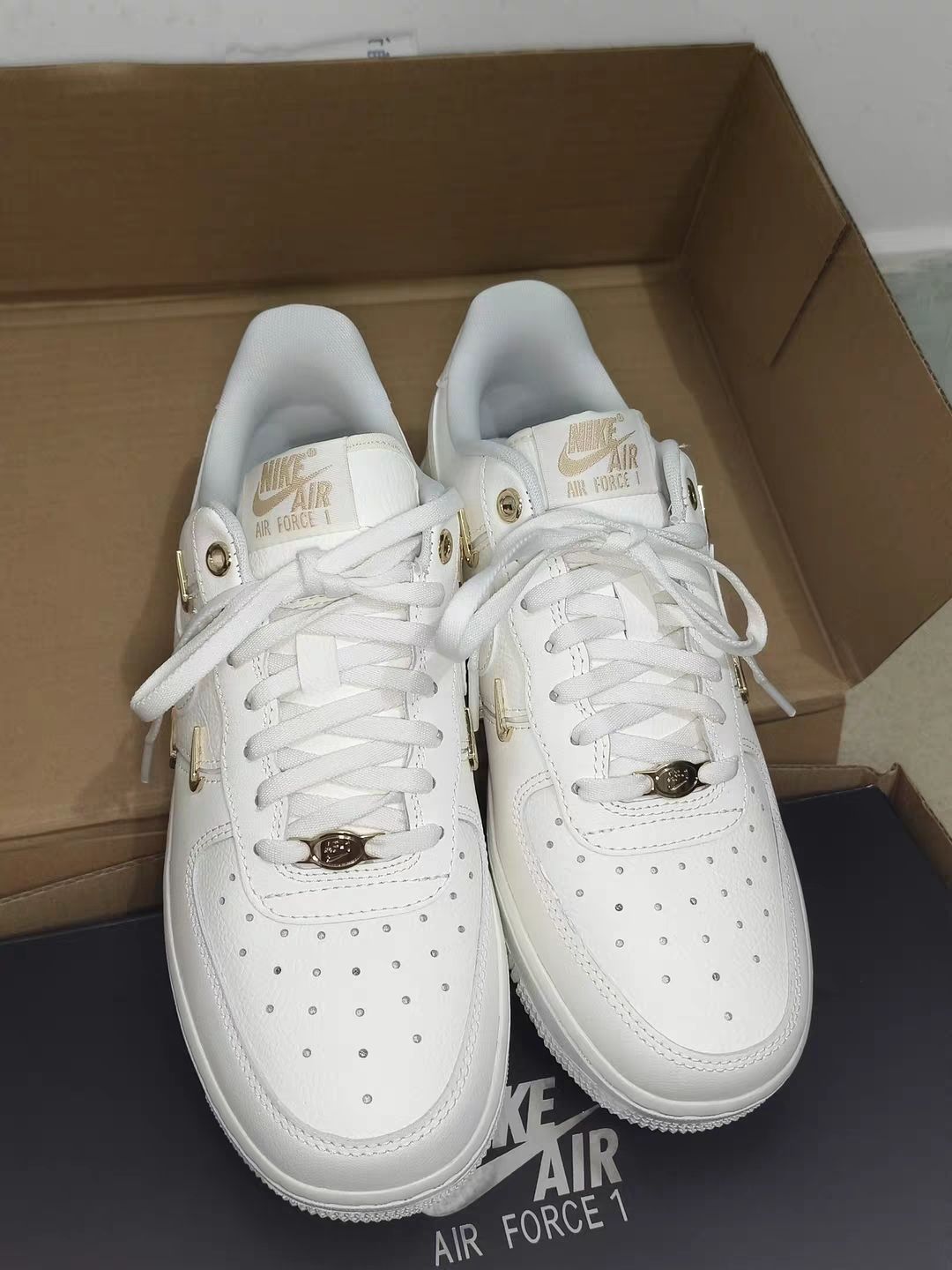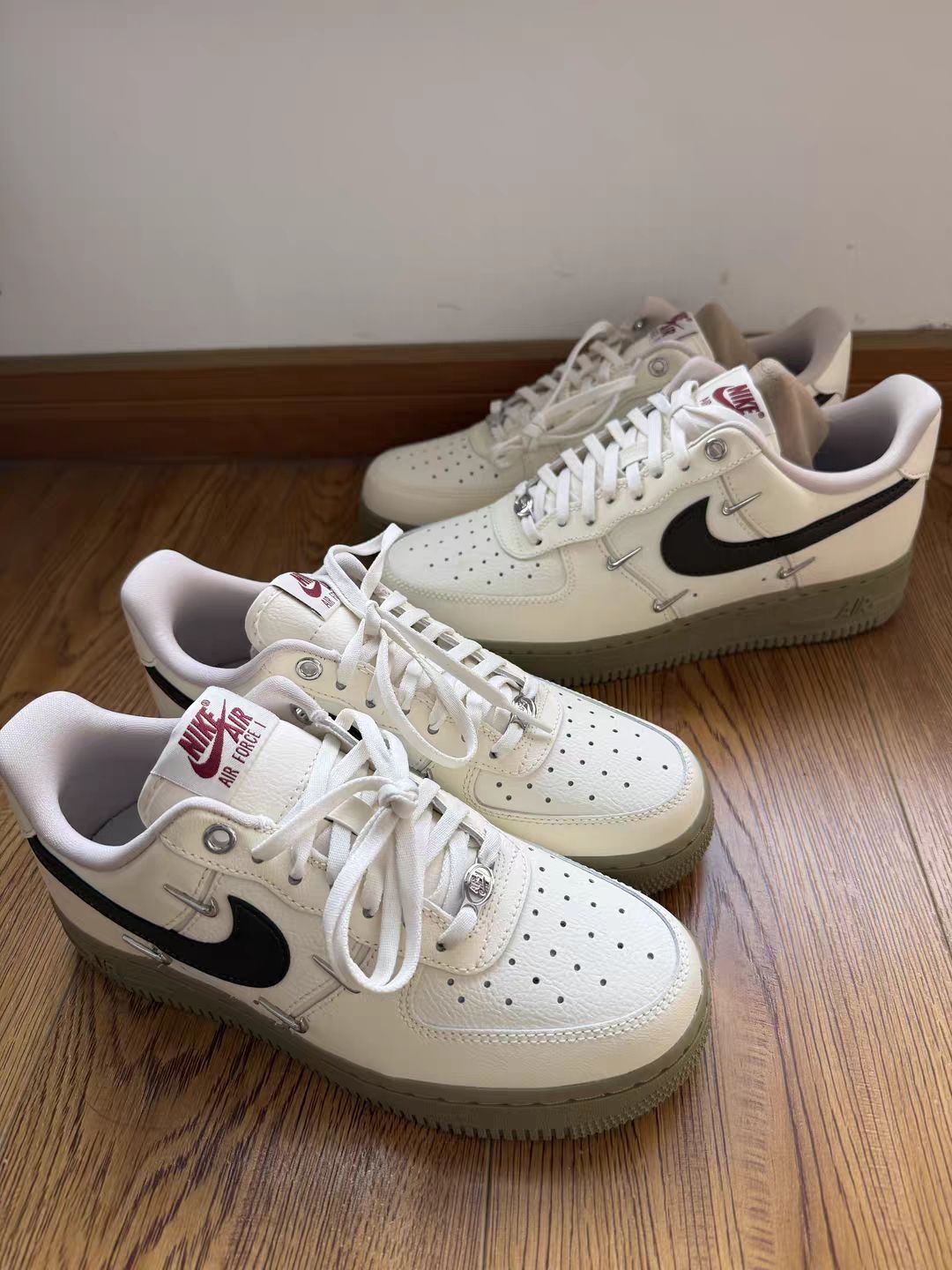 这双AF1米白棕配色真的是秋冬氛围感神鞋!实物比图片更有质感,米白色鞋身温柔又百搭,深棕皮质勾子搭配鞋尾红色NIKE字母点缀,撞色高级不突兀,鞋侧迷你小勾的细节设计更是拉满辨识度,复古腔调直接拉满。 材质选用细腻荔枝纹皮革,摸起来手感扎实,鞋面走线工整,做工细节无可挑剔。经典Air气垫加持,脚感软弹适中,缓震效果出色,通勤、逛街穿一天也不会累脚。鞋型偏宽,包裹性好不挤脚,搭配牛仔裤、卫裤都适配...