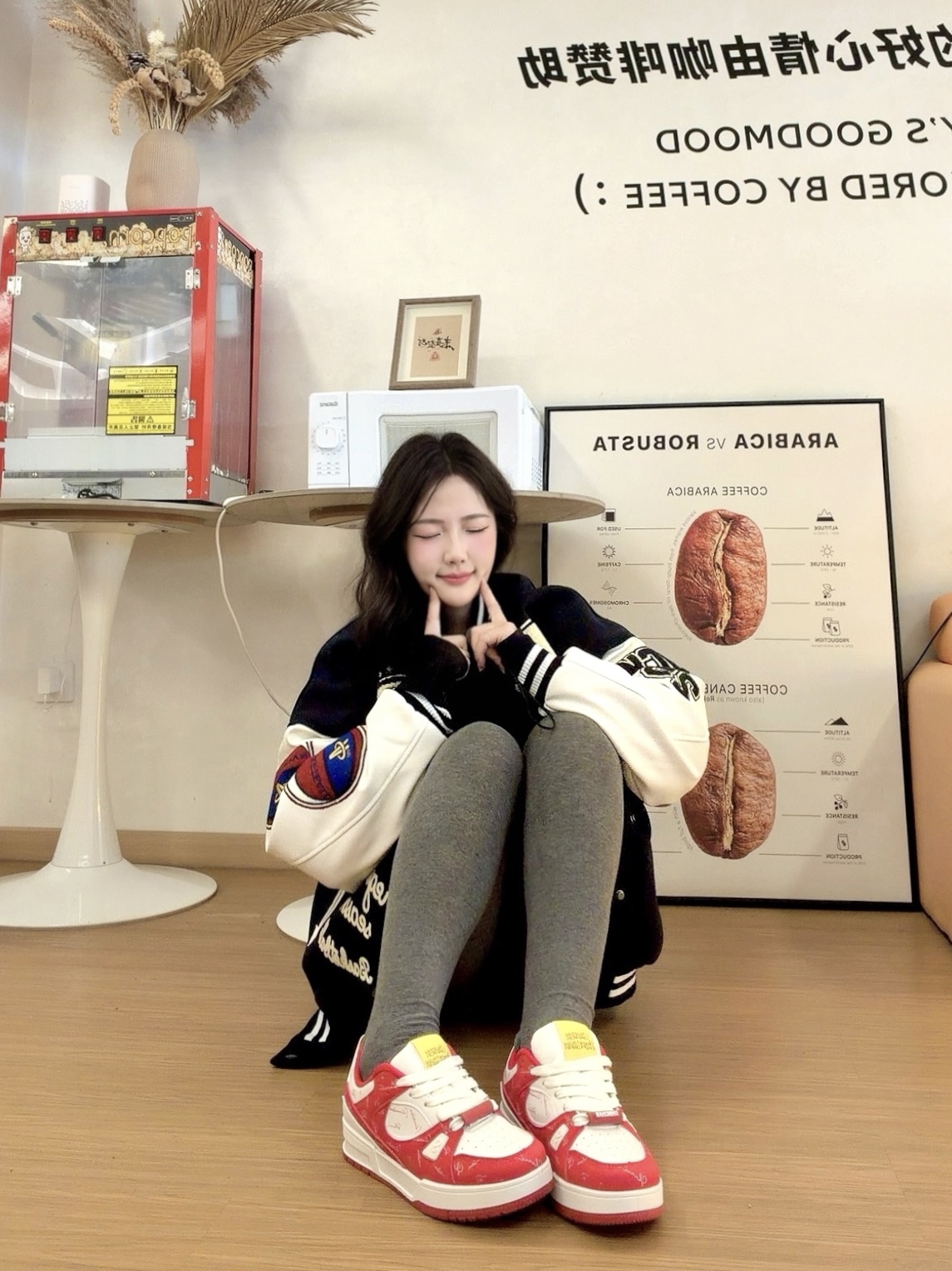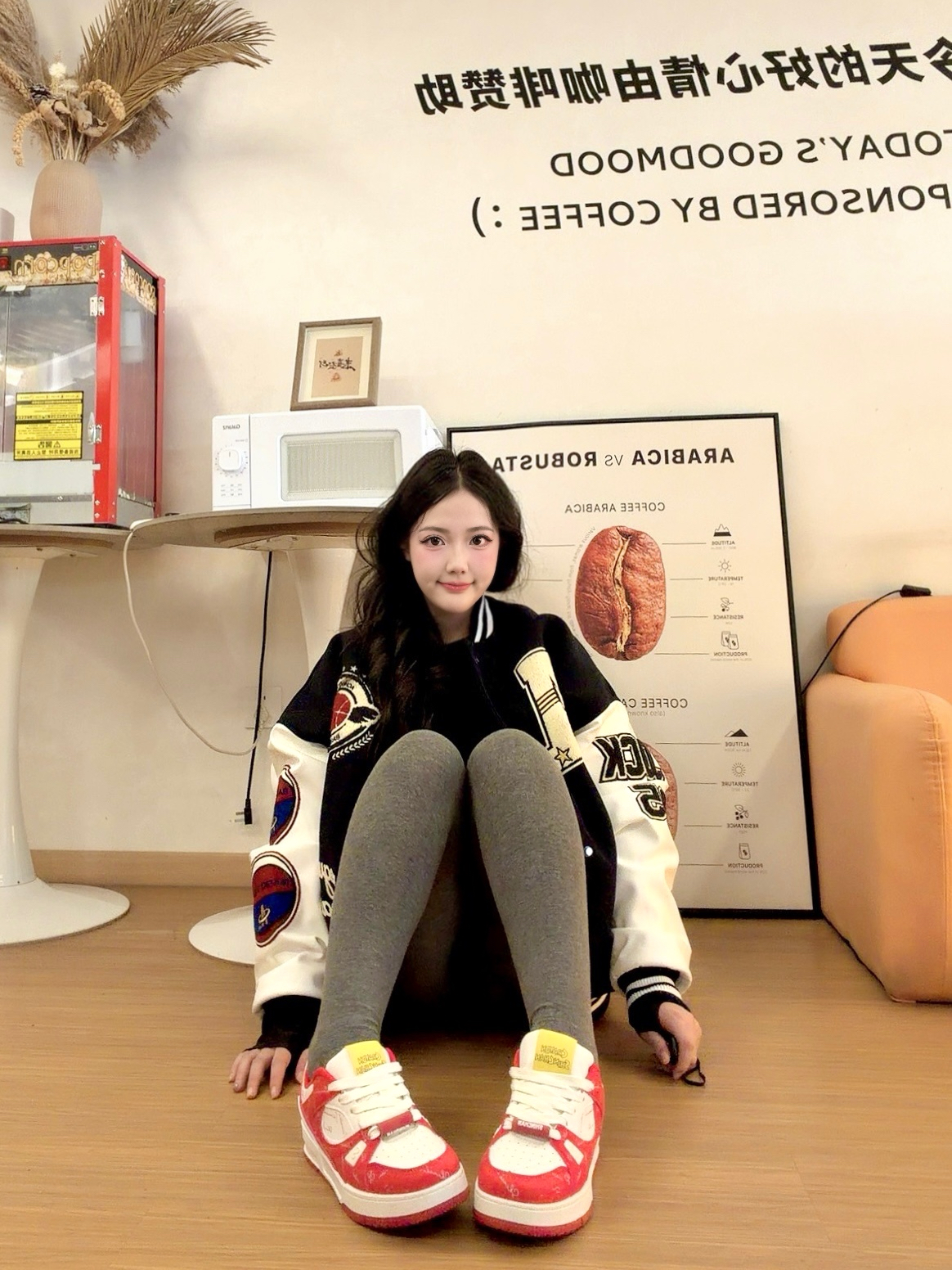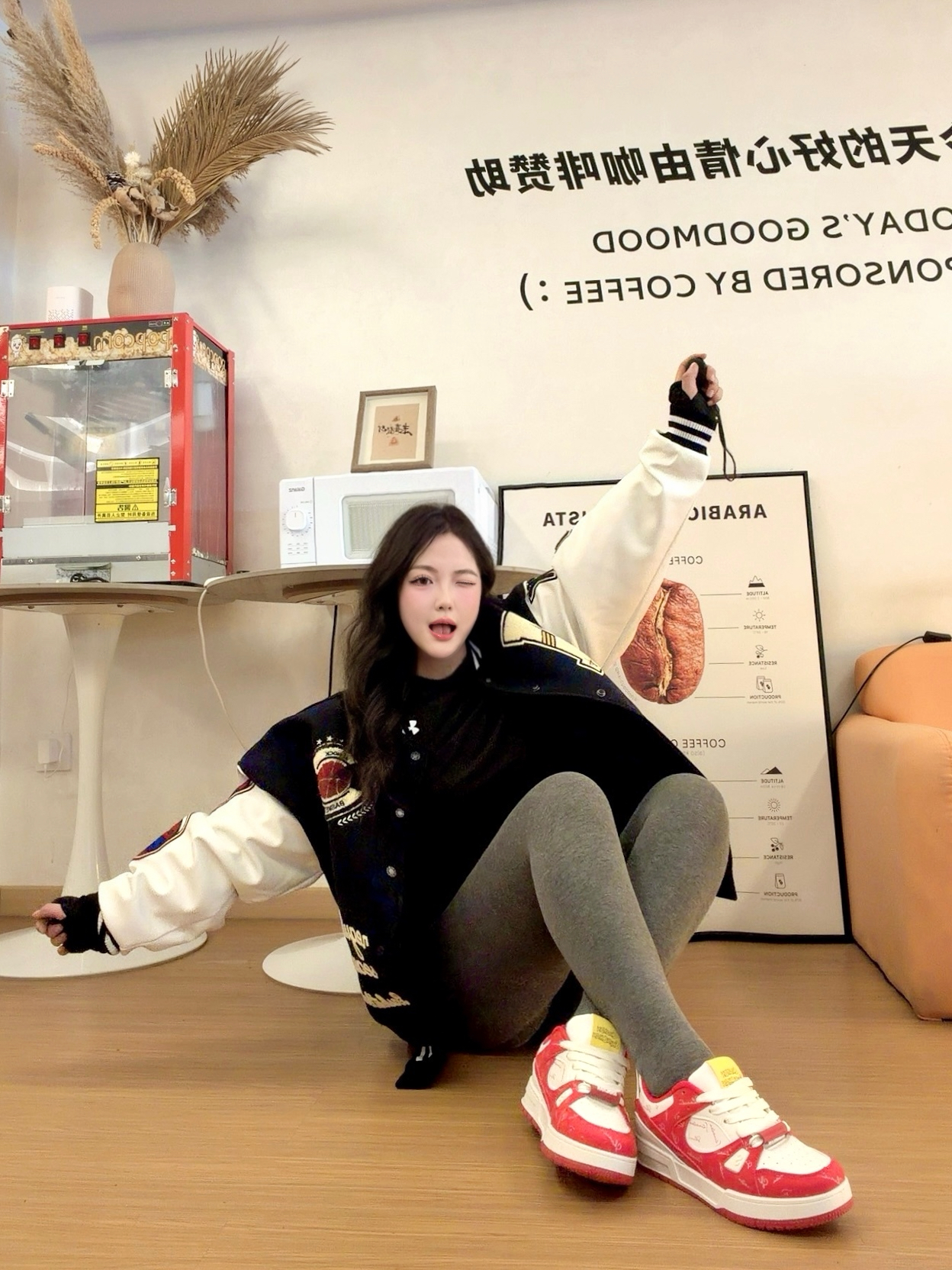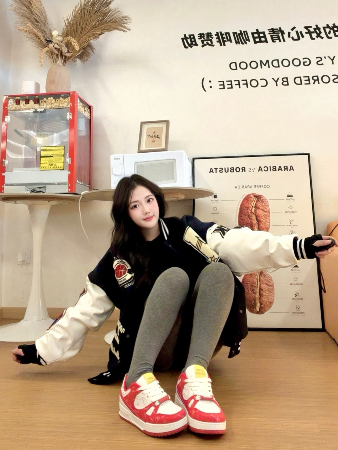这件A chock棒球服真的是秋冬百搭款~藏青拼米白的配色经典又耐看,背后的篮球毛巾绣图案复古感拉满 🧺。 袖子上的贴布标细节也很用心,面料软软的上身不压身~搭灰色leggings和毛毛靴就很有松弛感 🥿,日常出街或者上学穿都超合适~