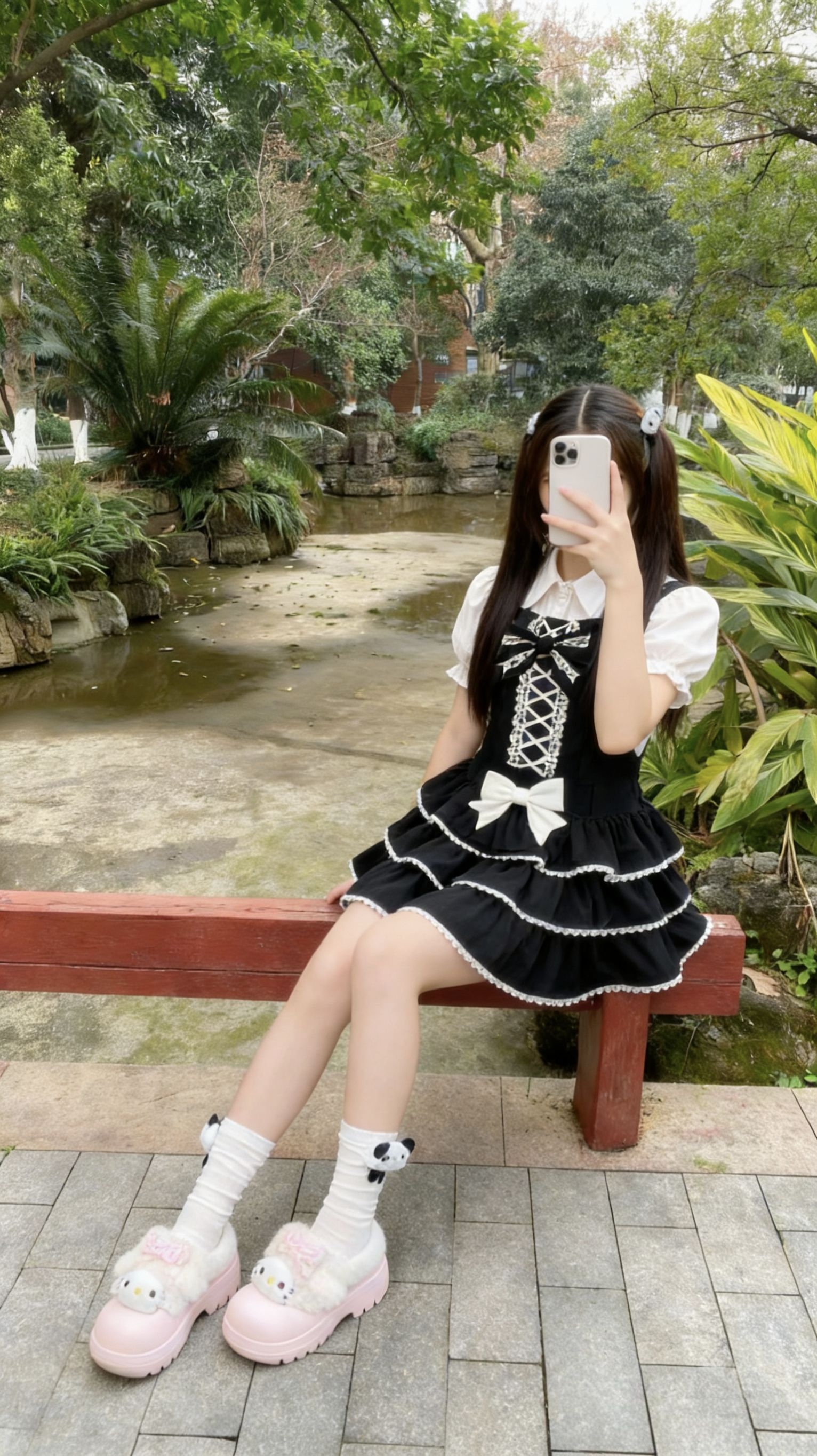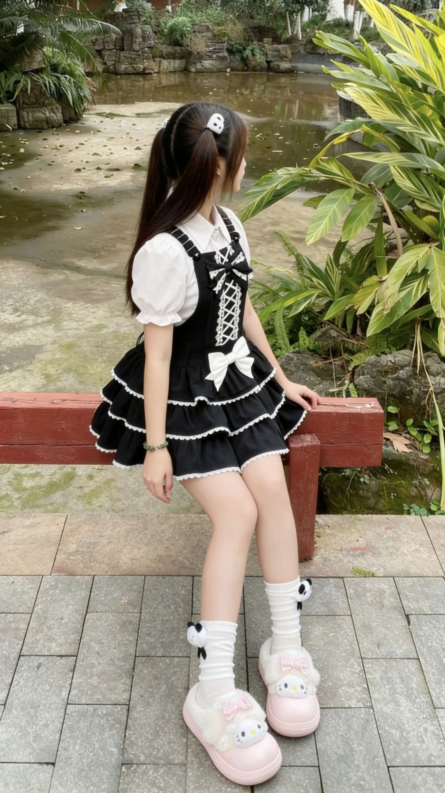 这套穿搭真的把甜妹氛围焊在身上了! ✨ 穿搭亮点 - 裙装:经典黑白配色的洛丽塔风背带裙,蕾丝花边+多层蛋糕裙摆,可爱又带点复古感,搭配泡泡袖内搭,瞬间化身在逃公主👸 - 鞋子:粉白拼色的厚底lo鞋,Hello Kitty的装饰直接戳中少女心,软乎乎的材质踩着超舒服,暴走一天也不累脚! - 袜子:重点夸夸这双熊猫玩偶小白袜!面料是薄透的冰丝感,堆堆袜的设计刚好盖住脚踝,搭配厚底鞋显腿细一绝🐼 袜口...